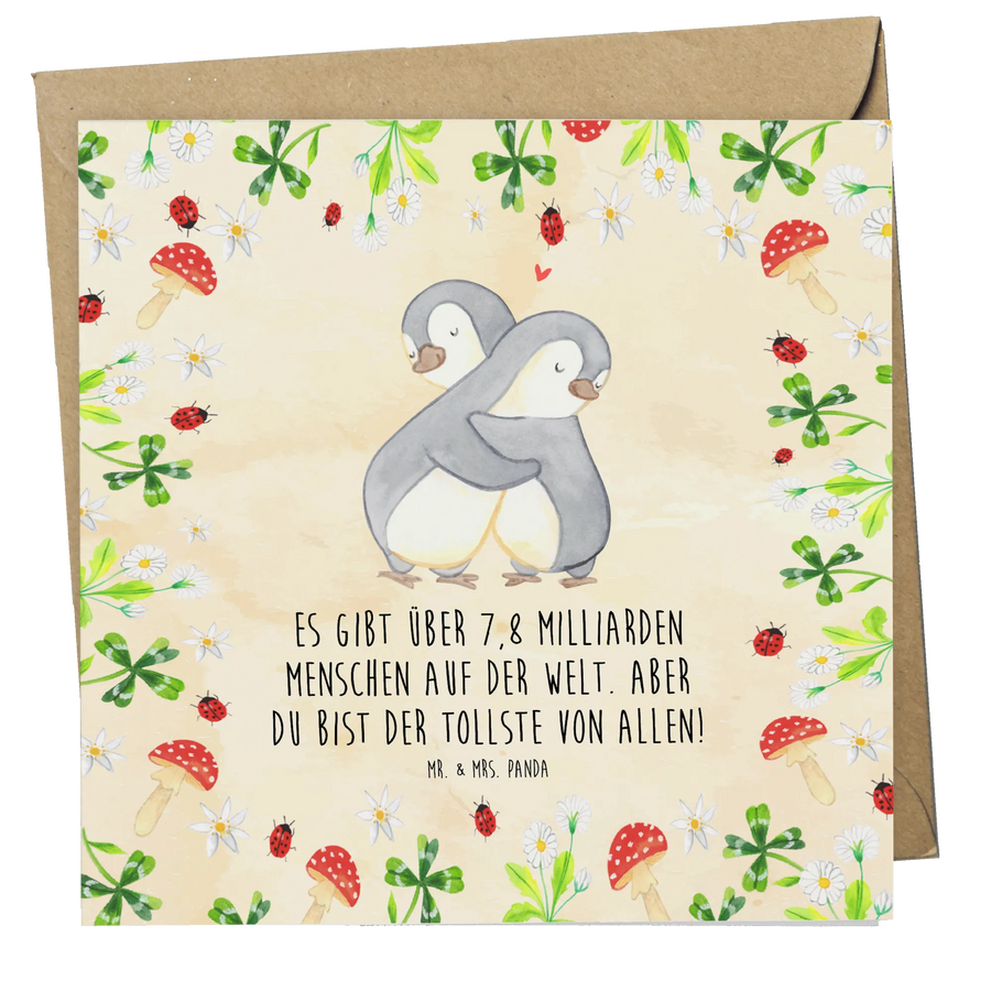 Unsere Deluxe Karte aus der Liebe-Kollektion von Mr. & Mrs. Panda zeigt zwei eng umschlungene Pinguine und trägt den schönen Spruch: „Es gibt über 7,8 Milliarden Menschen auf der Welt. Aber du bist der Tollste von allen!“ Dieses Motiv drückt Zuneigung und Geborgenheit aus und ist perfekt als Grußkarte für deinen Partner oder deine Partnerin.