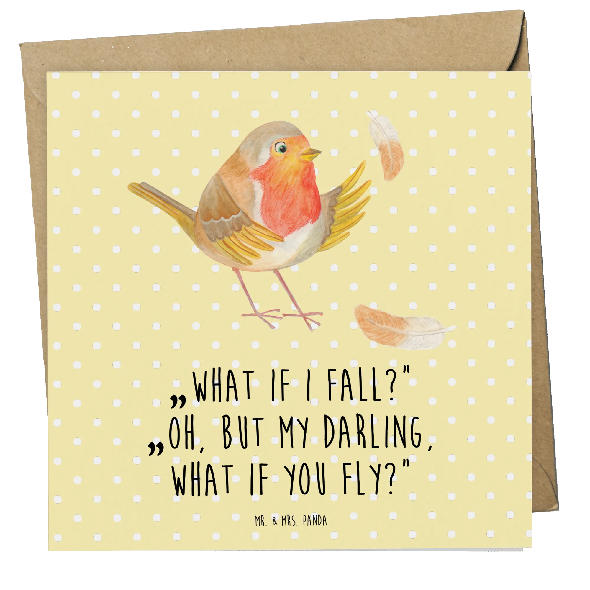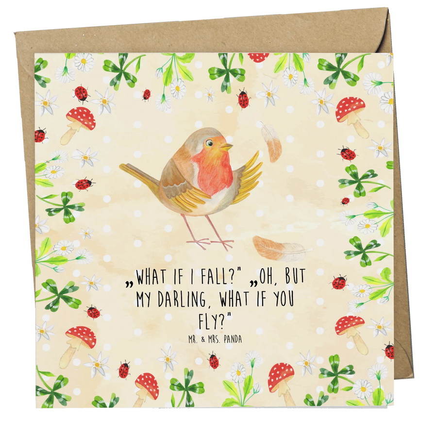 Unsere hochwertige, quadratische Grußkarte von Mr. & Mrs. Panda verbindet zarte Aquarellkunst mit einem berührenden Spruch: „What if I fall?“ / „Oh, but my darling, what if you fly?“ 🐦✨ Das süße Rotkehlchen, umgeben von bunten Federn, strahlt Ruhe, Hoffnung und Mut aus – ideal als Geburtstagskarte, Hochzeitskarte, Glückwunschkarte oder Einladungskarte.