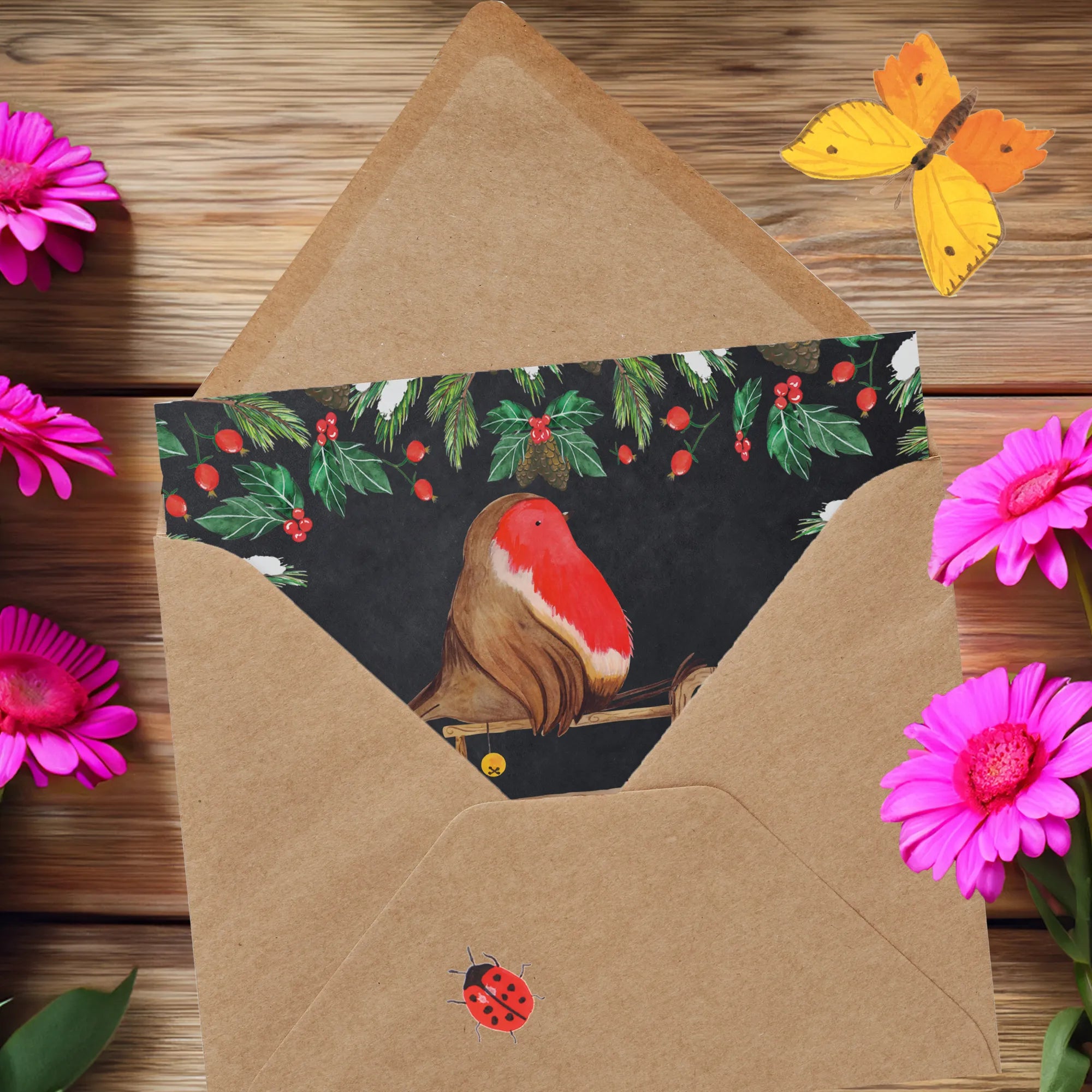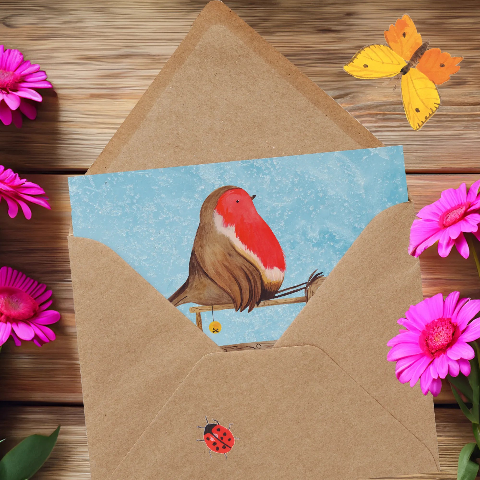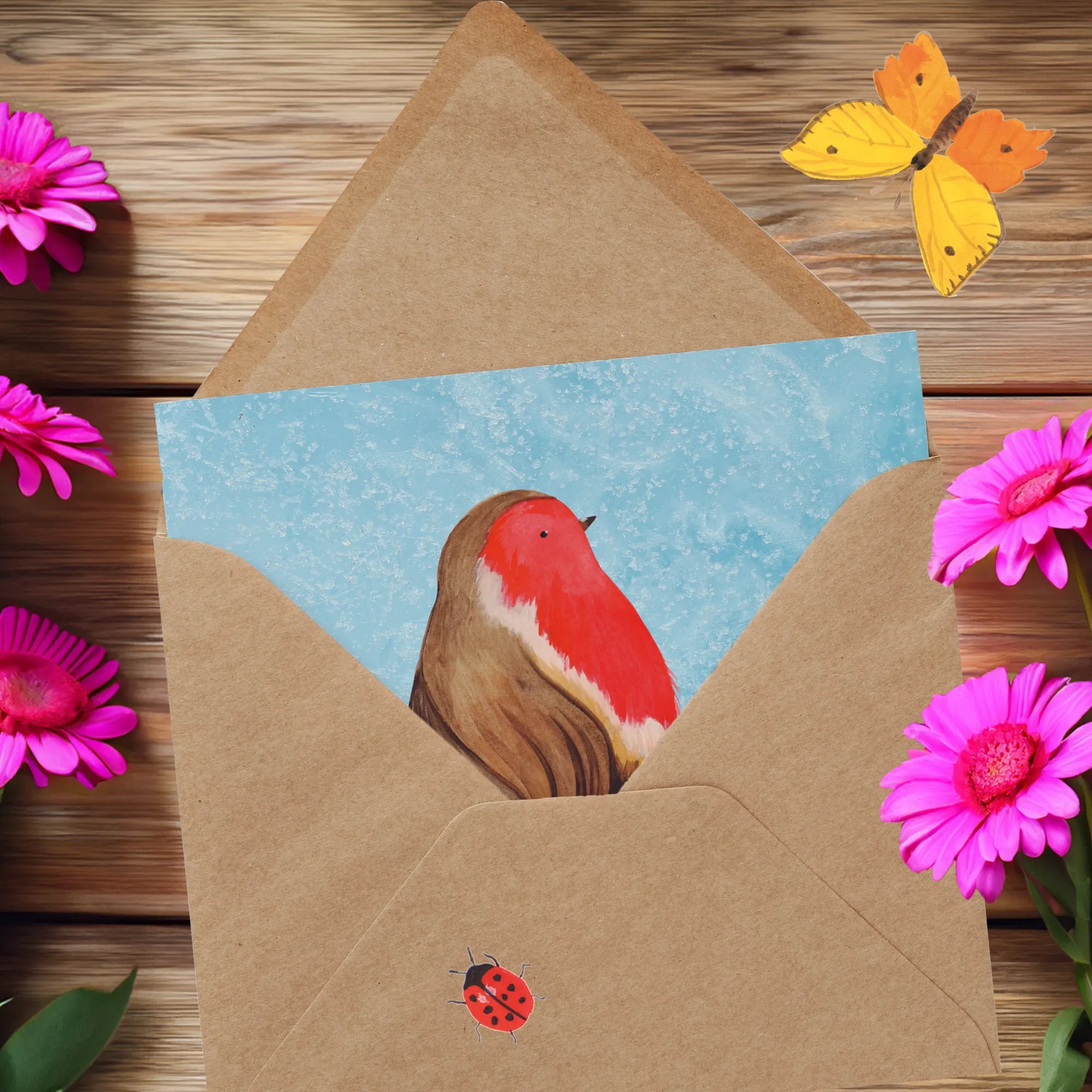 Das niedliche Motiv zeigt ein fröhliches Rotkehlchen, das auf einem Holzschlitten fährt, und wird sicherlich ein Lächeln auf das Gesicht des Empfängers zaubern. Diese Karte wird oft als herzlicher Glückwunsch zu besonderen Anlässen wie dem Heiligabend, Nikolaus oder sogar als Einladungskarte für Winterfeiern gewählt.