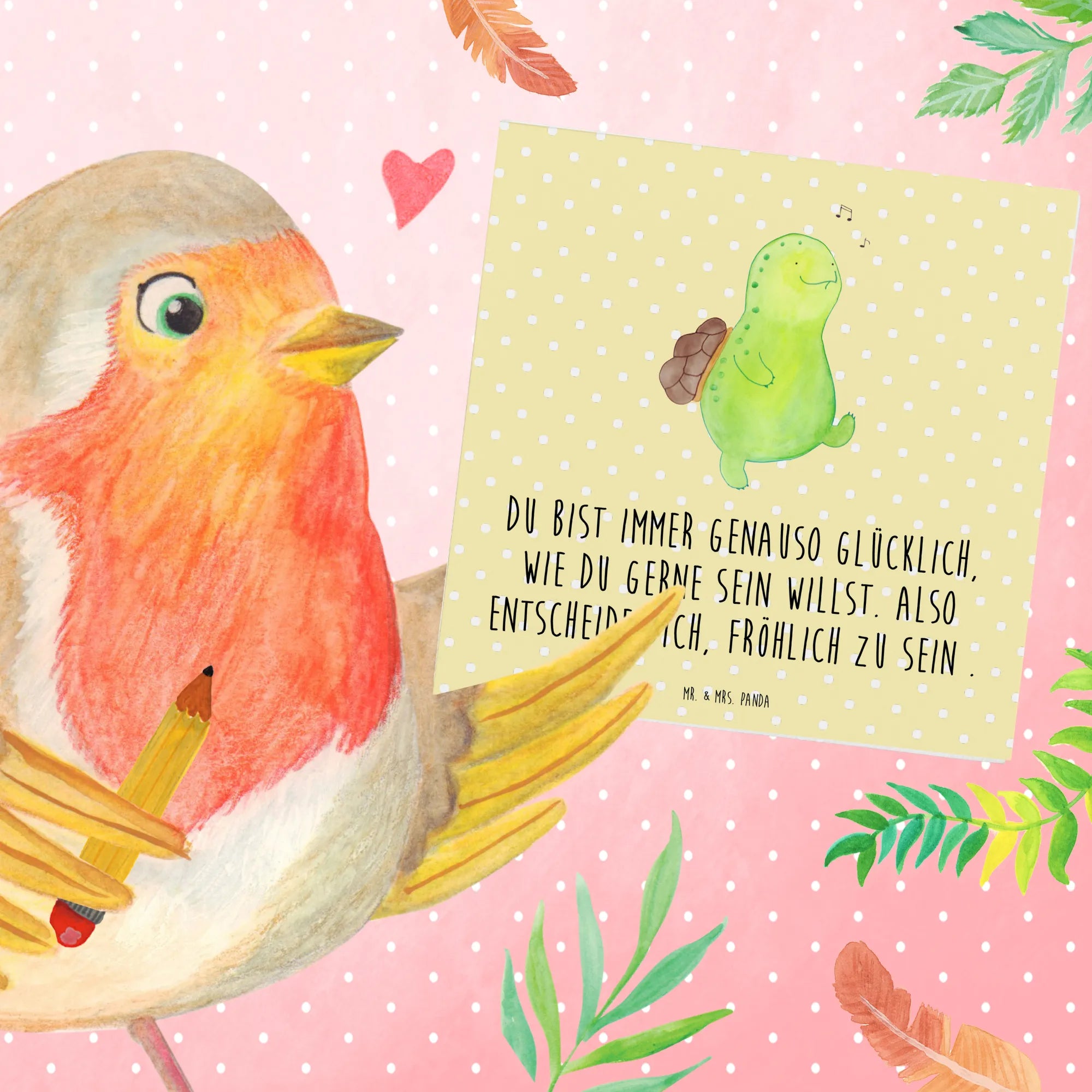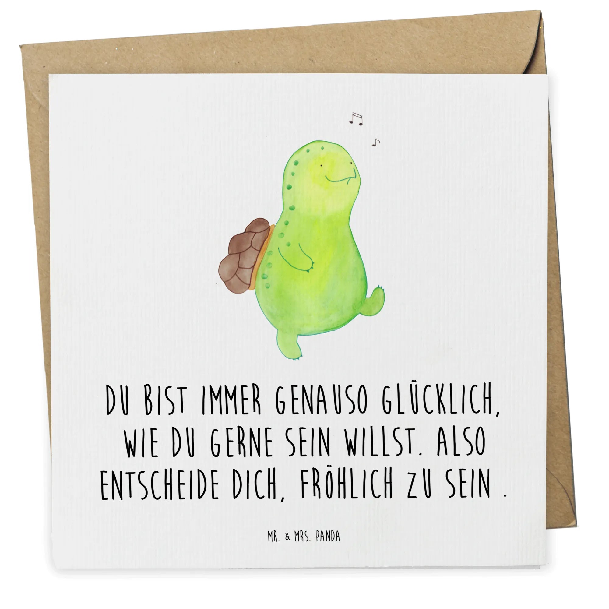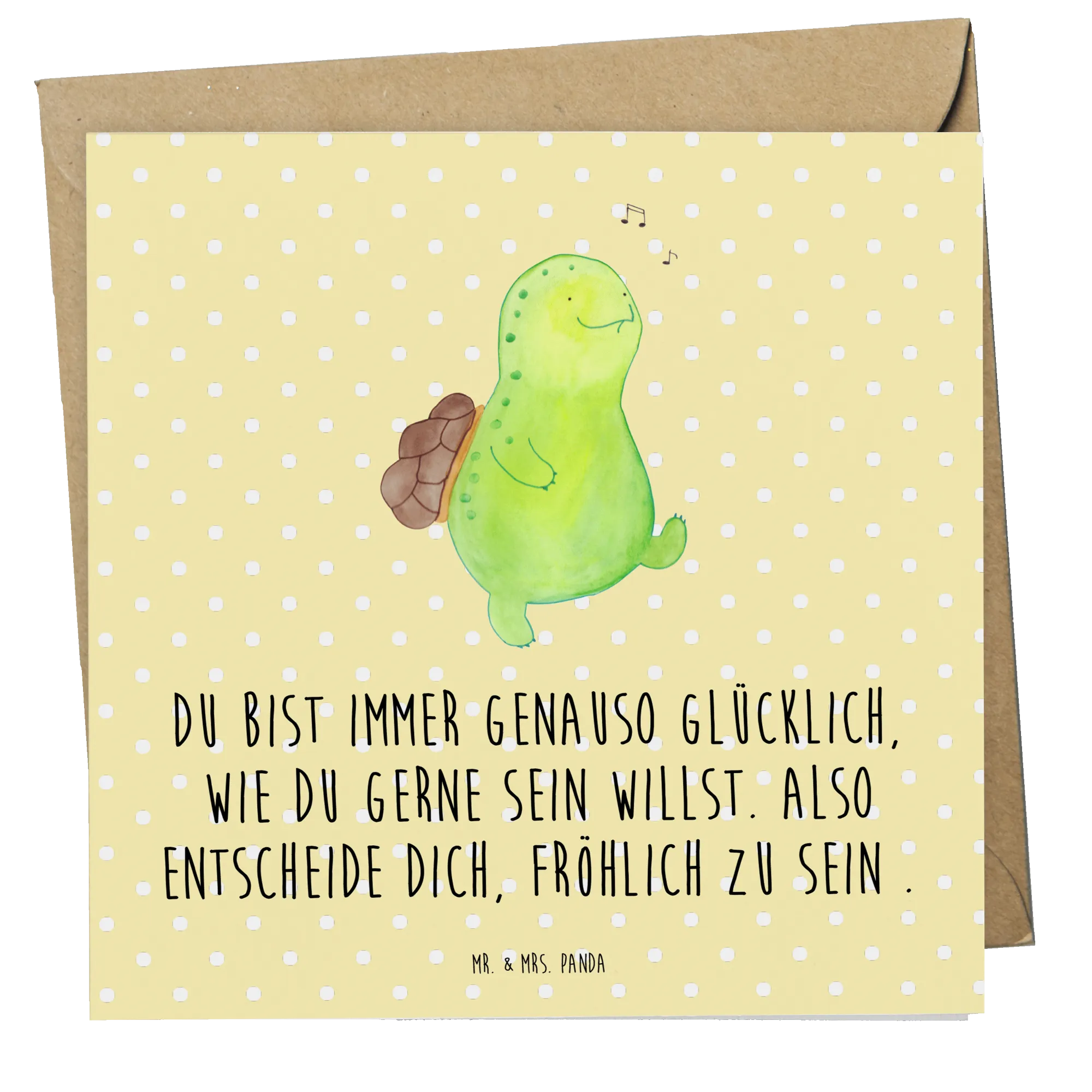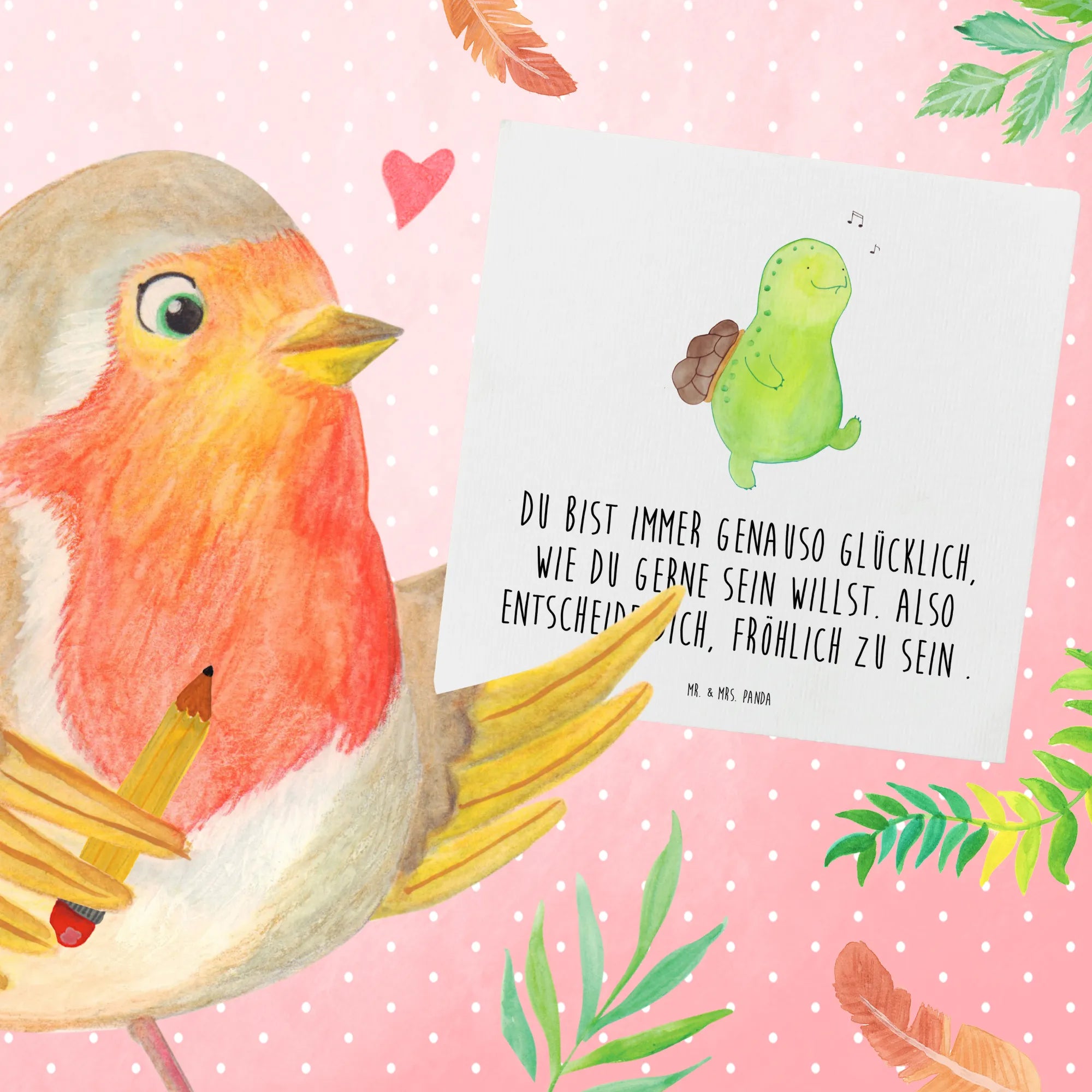 Die niedliche Schildkröte, die fröhlich ein Lied pfeift, symbolisiert Lebensfreude, Glück und die Entscheidung, fröhlich zu sein. Der eingängige Spruch 'Du bist immer genauso glücklich, wie du gerne sein willst. Also entscheide dich, fröhlich zu sein.' macht die Karte zu einem besonderen Geschenk, das inspirieren und motivieren kann, gerade in schwierigen Zeiten wie Trennung oder Neuanfang.
