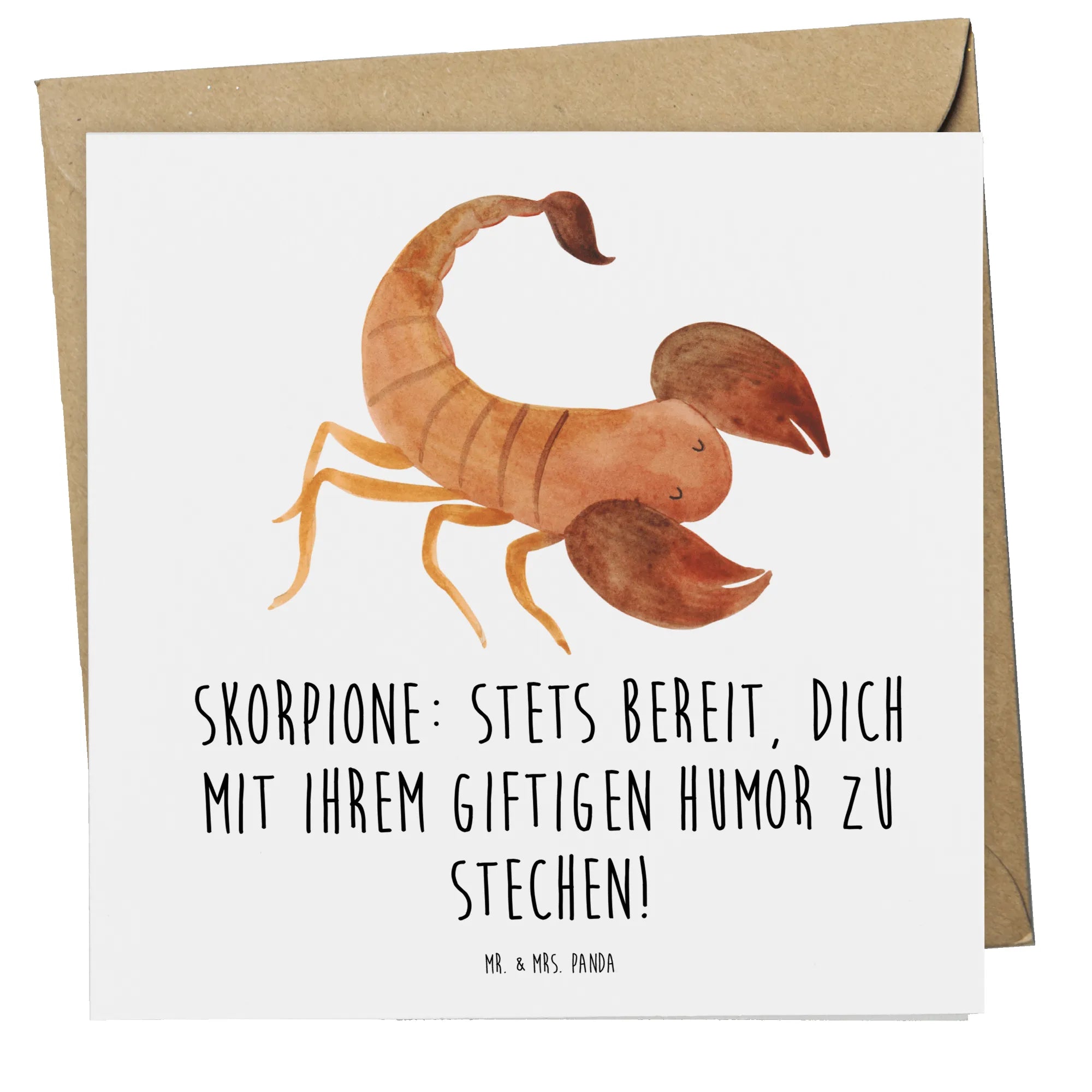 Das Motiv Skorpion sticht nicht nur durch seine ansprechende Gestaltung hervor, sondern kommt mit dem liebevollen Spruch "Skorpione: Stets bereit, dich mit ihrem giftigen Humor zu stechen!". Diese Worte bringen den typischen Skorpion-Humor auf den Punkt und sorgen für ein Schmunzeln bei jedem Empfang. Die Karte ist bedruckt mit einem zauberhaften und handgezeichneten Design von Mrs. Panda – jedes Motiv ist ein Unikat, das die Besonderheiten und Eigenschaften des Skorpions feiert. Ob für Freunde, Familie oder Kollegen, mit dieser Karte kannst du zeigen, dass du die Persönlichkeit des Beschenkten schätzt.