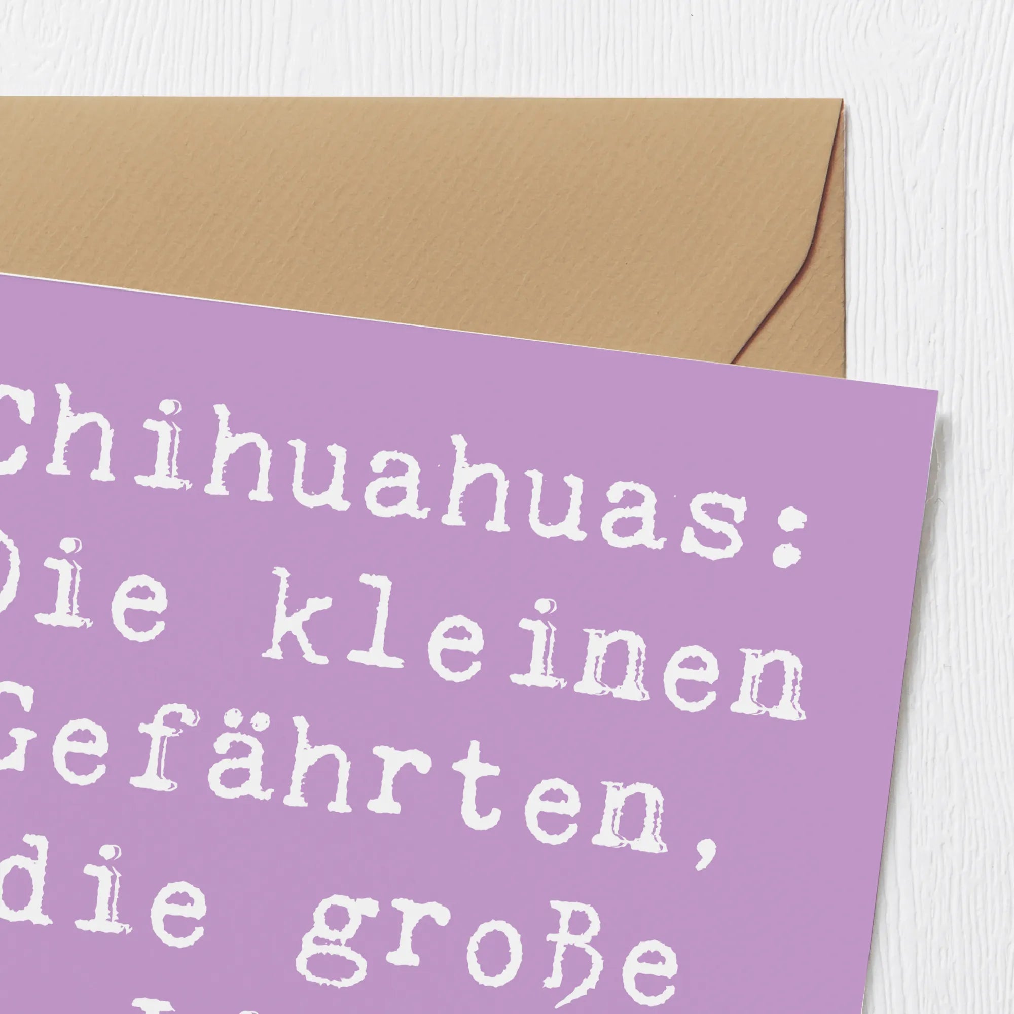 Die Vorderseite der Karte glänzt in edlem Hochglanz und ist mit einem gut gestalteten Spruch versehen: "Chihuahuas: Die kleinen Gefährten, die große Liebe schenken!" Dies macht sie ideal für Geburtstage, Hochzeiten, Jubiläen oder einfach nur als kleine Aufmerksamkeit für einen lieben Menschen.