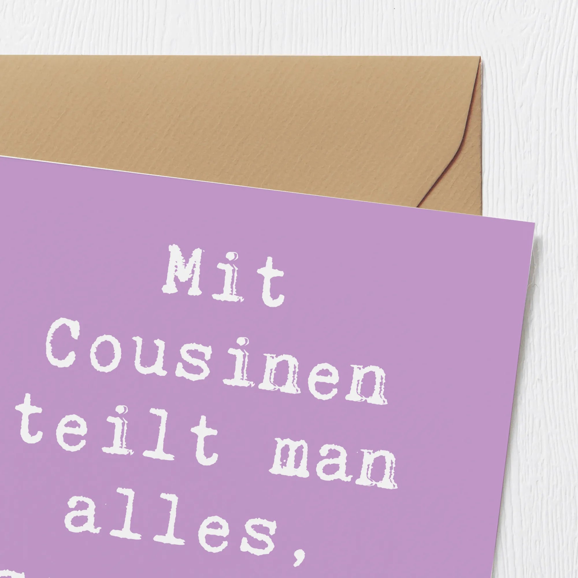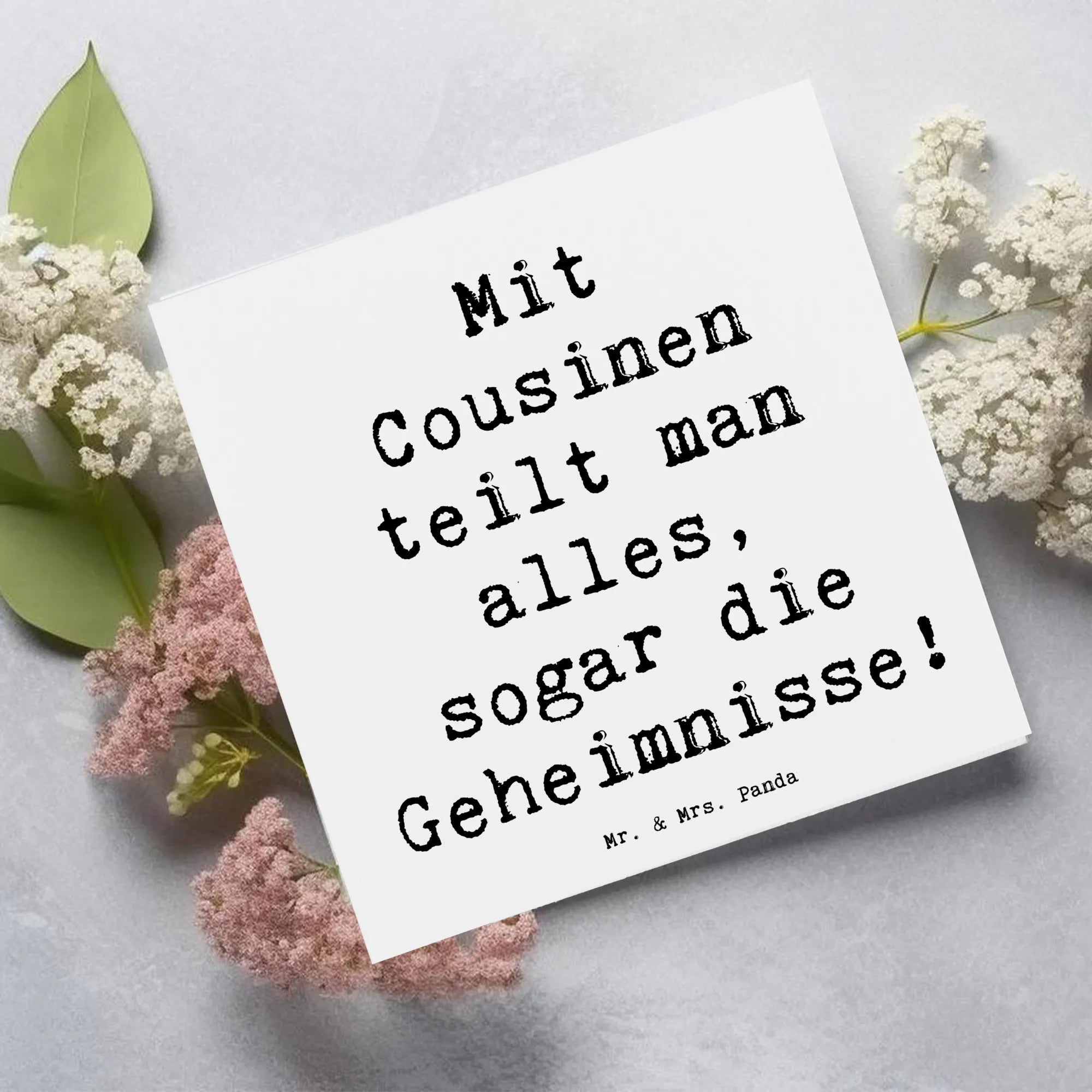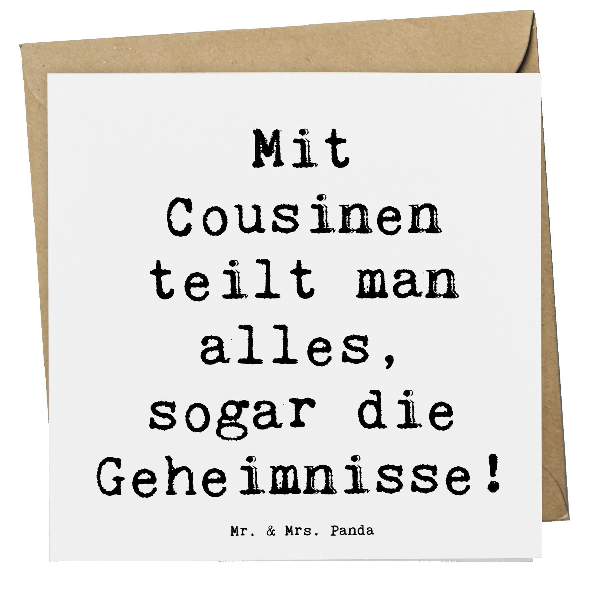 Mit dem Spruch: "Mit Cousinen teilt man alles, sogar die Geheimnisse!" verbindet die Karte die Emotionen und den Spaß, den wir in unseren Beziehungen haben. Diese Karte ist nicht nur ein Geschenk, sondern ein Symbol für all die schönen Momente, die Ihr zusammen geteilt habt.