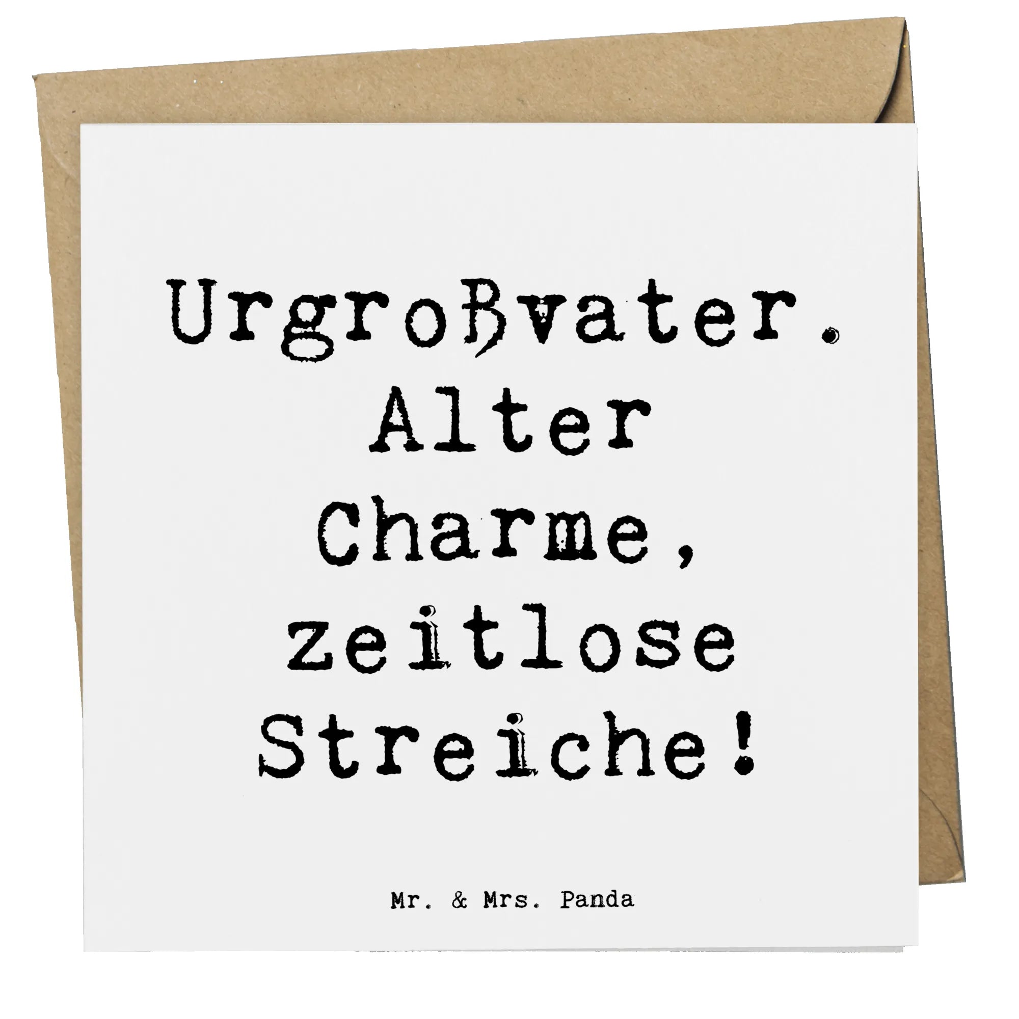 Die Karte hat einen edlen Umschlag, wodurch sie sich hervorragend für feierliche Anlässe eignet. Egal ob Geburtstagsgrüße, Hochzeitswünsche oder einfach mal ein Dankeschön, diese Karte kann immer verwendet werden. Der Spruch "Urgroßvater. Alter Charme, zeitlose Streiche!" auf der Vorderseite vermittelt auf liebevolle Weise die Wertschätzung für diese besonderen Familienmitglieder.