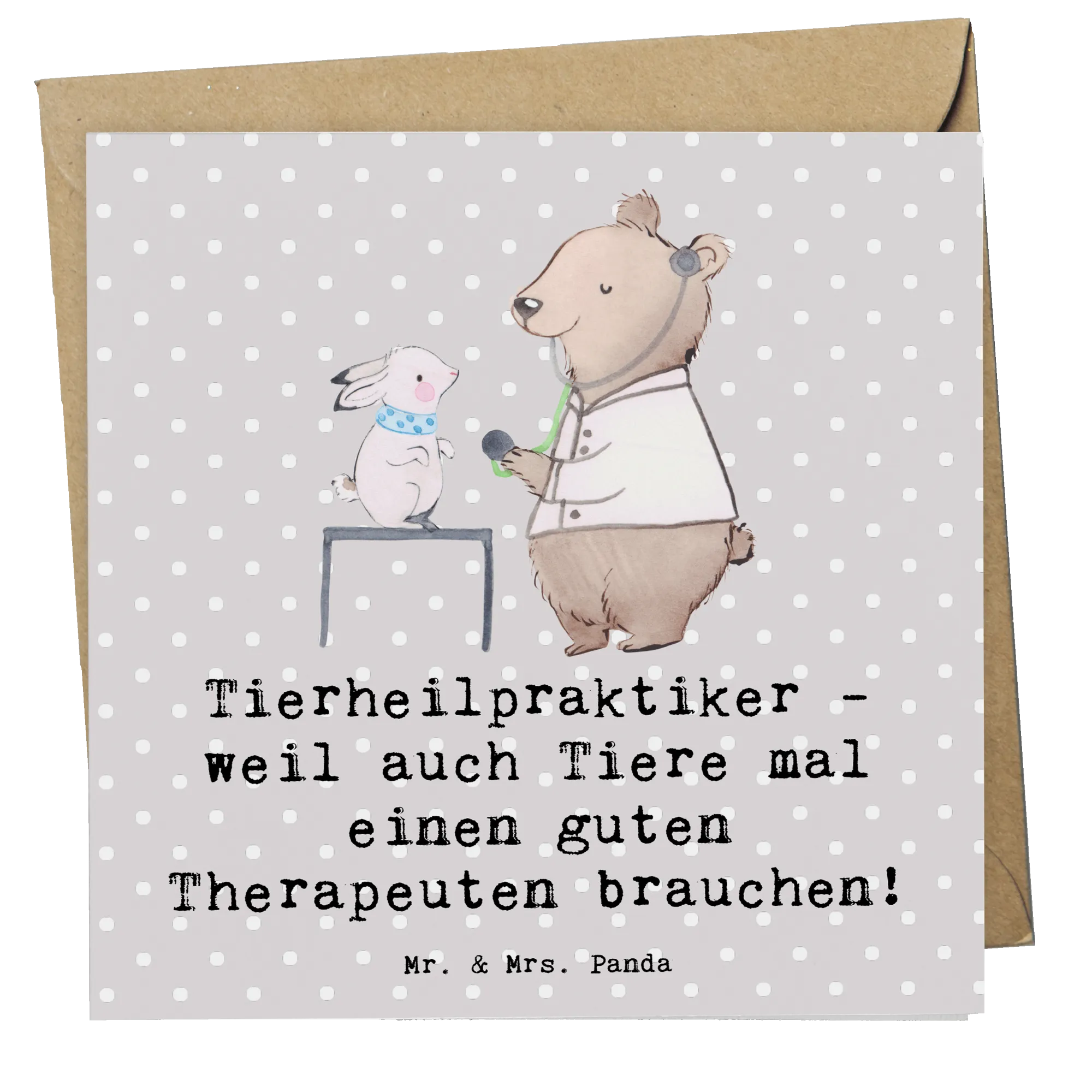 Die Vorderseite der Karte ist mit einem liebevollen Motiv bedruckt, das von Mrs. Panda handgezeichnet wurde. Das Bild zeigt einen niedlichen Tierheilpraktiker, der die Botschaft verkörpert, dass unsere vierbeinigen Freunde professionelle Hilfe verdienen.