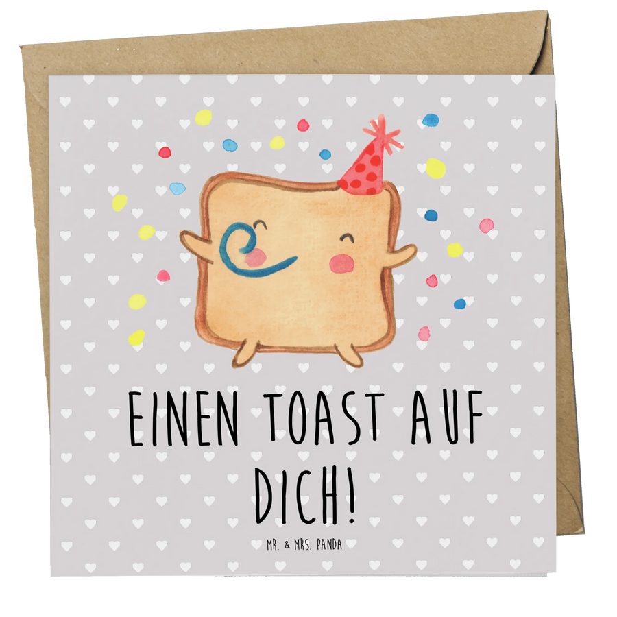 Der fröhliche Toast mit menschlichen Zügen, der einen Partyhut trägt, und das herzliche Motto „Einen Toast auf dich!“ verleihen der Karte eine festliche Note. Um den Toast herum umschwirren farbige Konfetti-Punkte, die die positive Stimmung perfekt unterstreichen.
