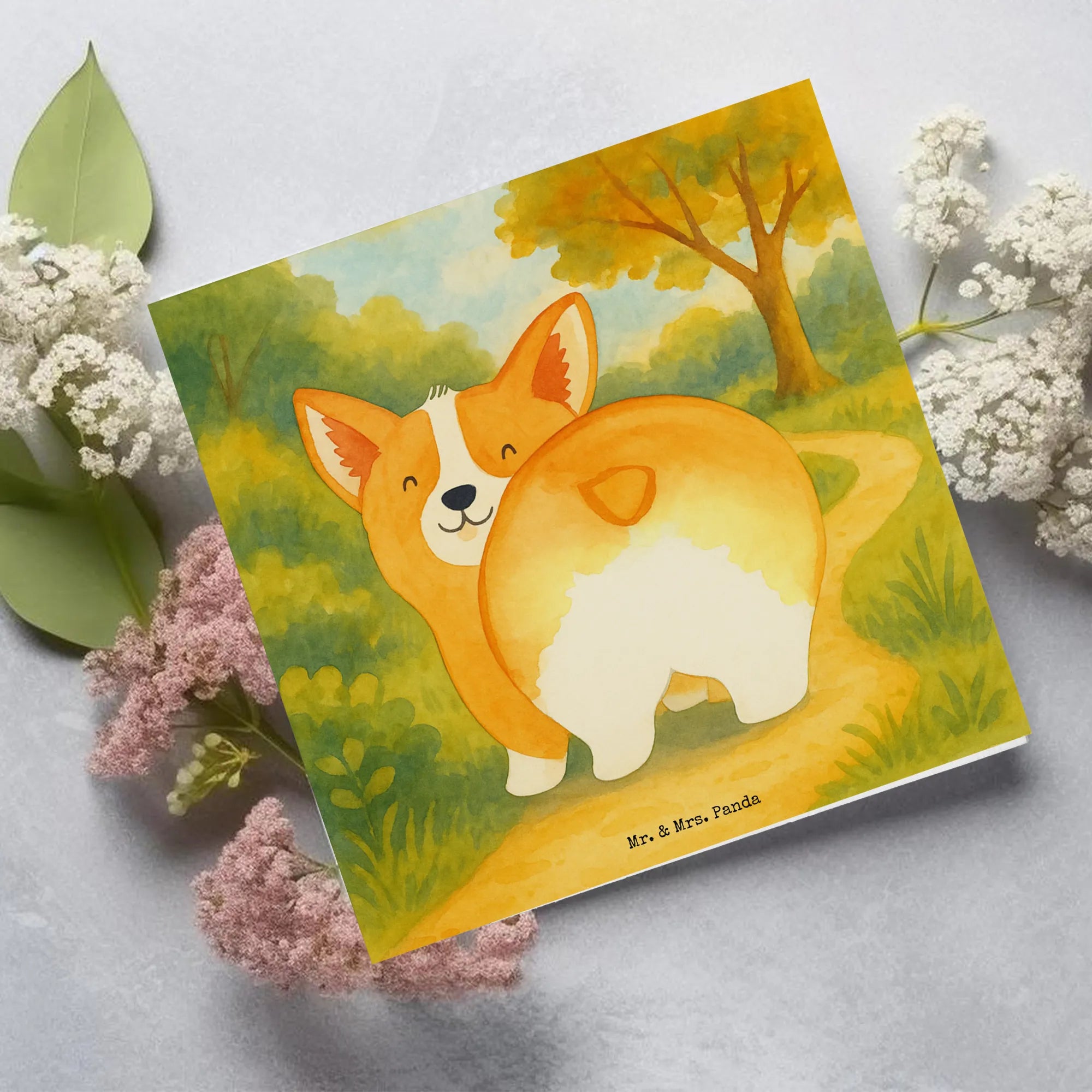 Unsere quadratische Deluxe Karte aus der Hunde Kollektion von Mr. & Mrs. Panda zeigt einen frechen Corgi, der seinen Po stolz in die Kamera hält. Das liebevoll von Mrs. Panda gezeichnete Aquarellmotiv zaubert jedem ein Lächeln ins Gesicht und macht die Karte zur perfekten Wahl für alle, die Hunde, Humor und schöne Papeterie lieben. 😊