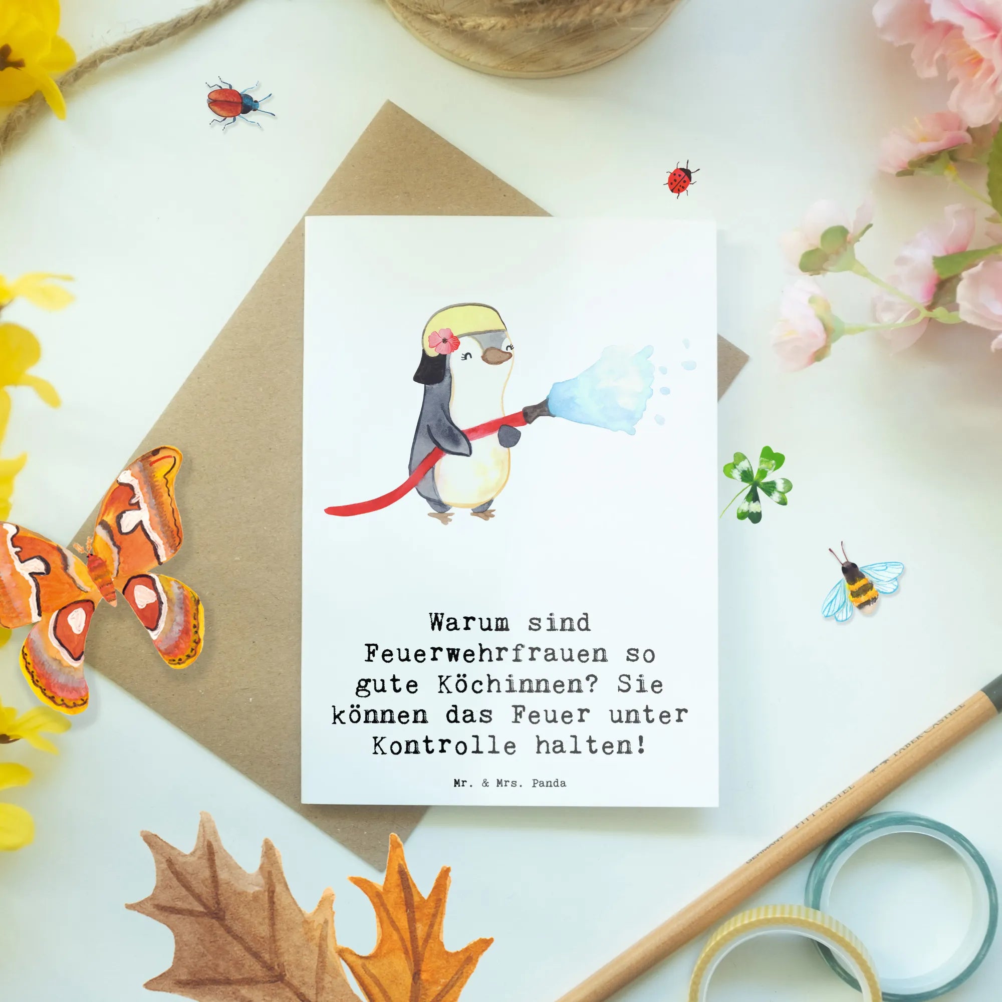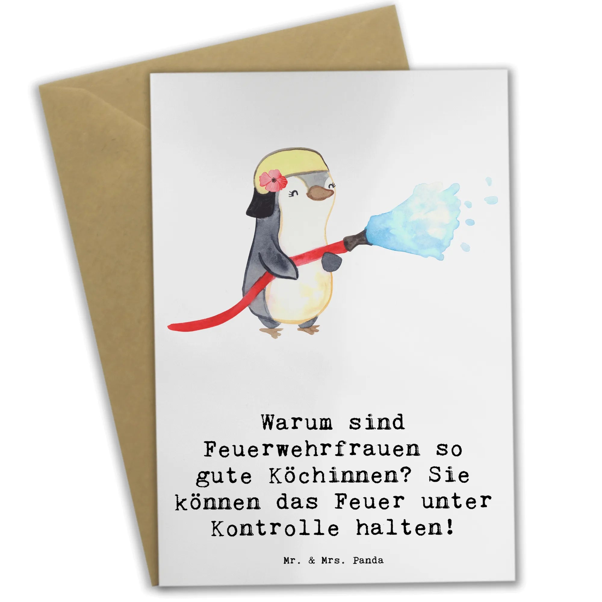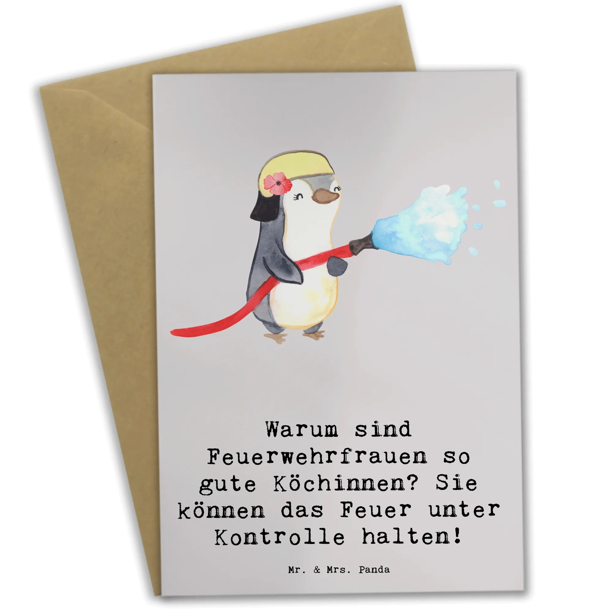 Die wunderschöne Grußkarte mit dem Motiv Feuerwehrfrau aus der vielseitigen Kollektion Berufe von Mr. & Mrs. Panda ist das perfekte Geschenk für Feuerwehrfrauen und all die Menschen, die ihre Leidenschaft für diesen heldenhaften Beruf schätzen. Jede Karte ist liebevoll gestaltet und verbindet ein charmantes Design mit einem witzigen Spruch: "Warum sind Feuerwehrfrauen so gute Köchinnen? Sie können das Feuer unter Kontrolle halten!"