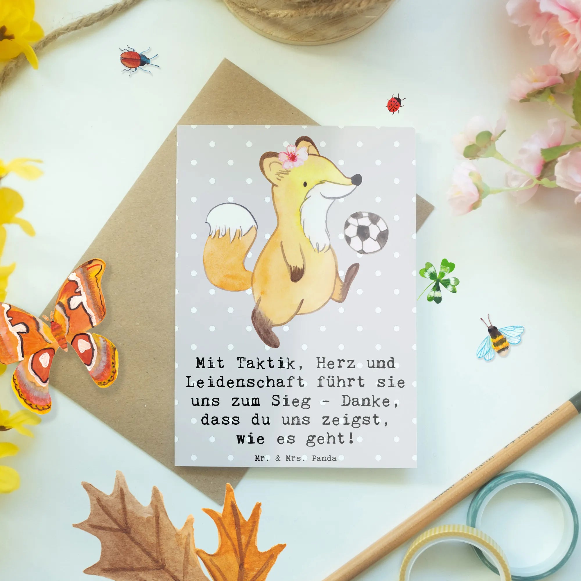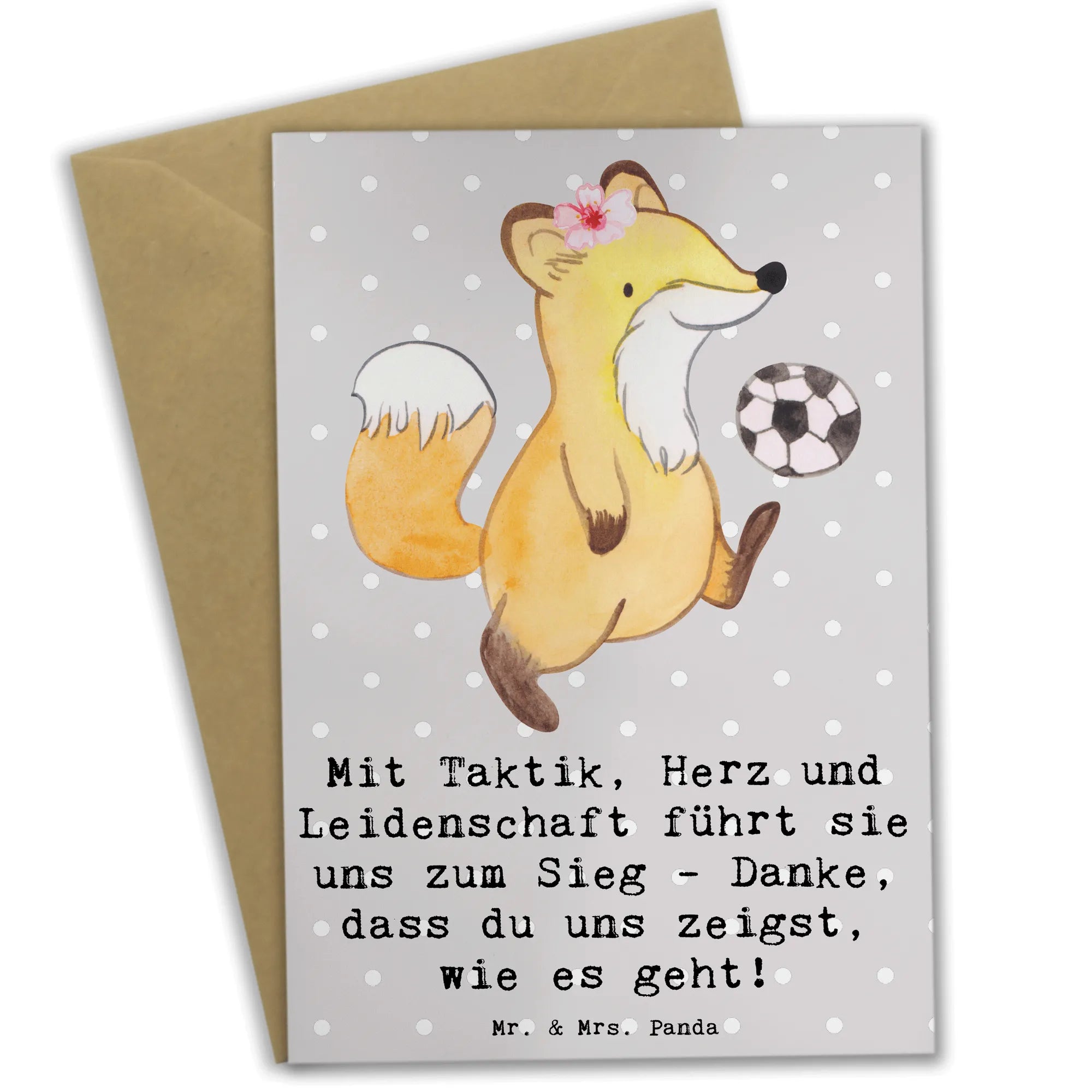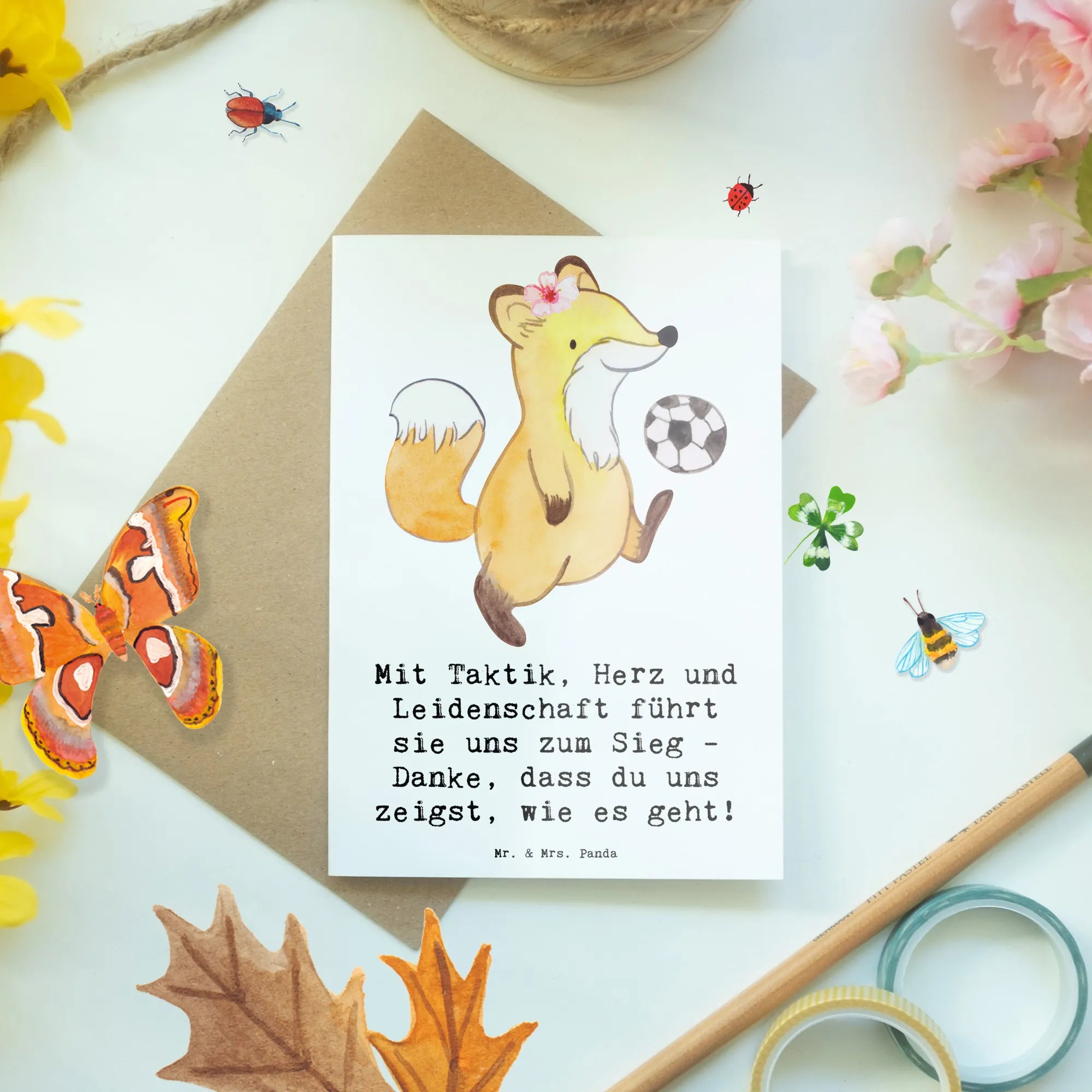 Bist du auf der Suche nach dem perfekten Geschenk für deine Trainerin? Unsere wunderschöne Grußkarte mit dem Motiv "Fußball Trainerin" aus der Sammlung "Sportarten Trainerin" von Mr. & Mrs. Panda ist genau das Richtige! Mit dem liebevoll gestalteten Spruch "Mit Taktik, Herz und Leidenschaft führt sie uns zum Sieg - Danke, dass du uns zeigst, wie es geht!" zeigst du deiner Trainerin, wie wichtig sie für dich ist.