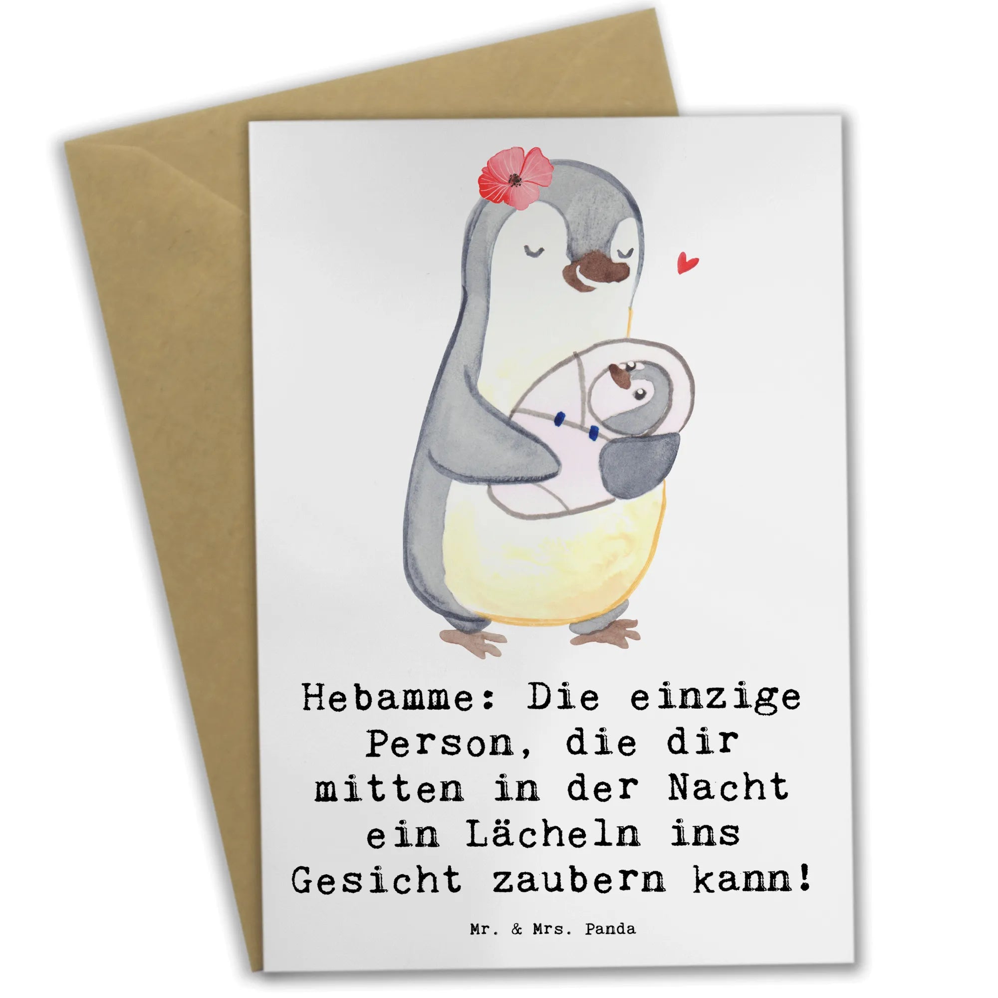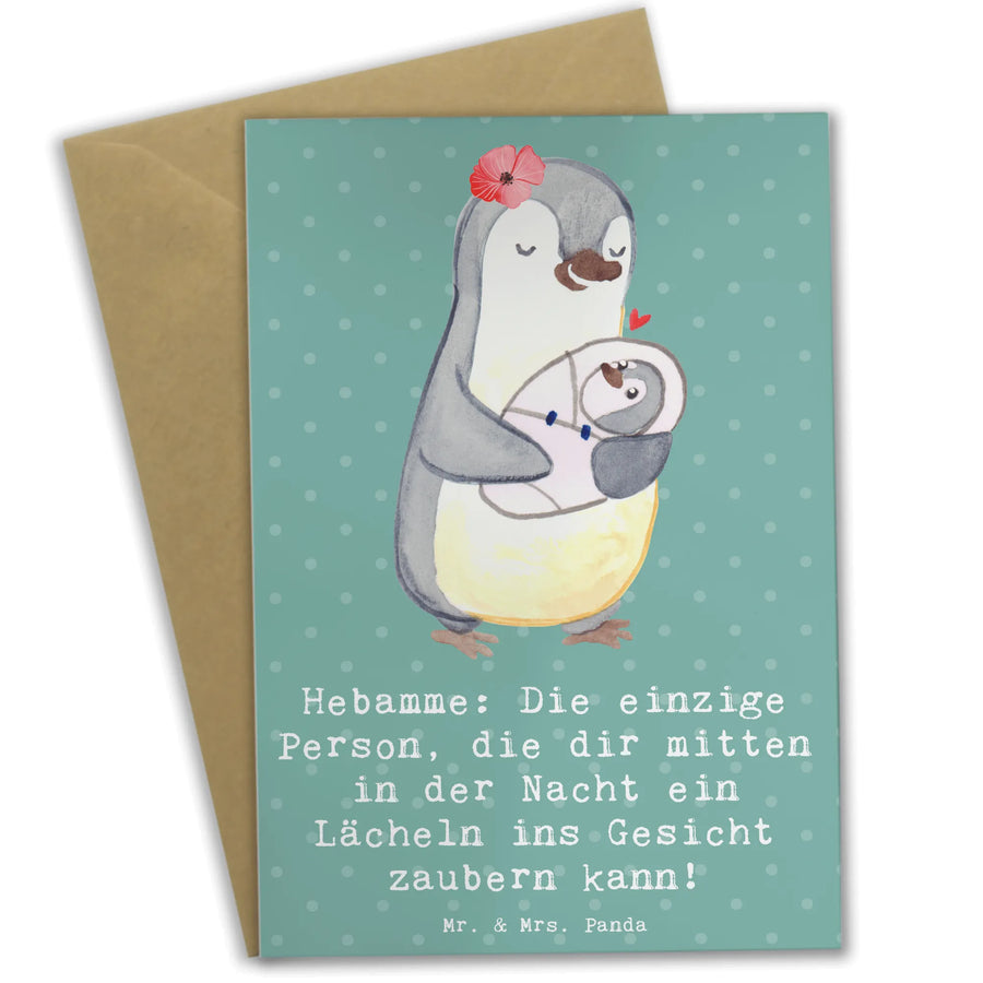Diese wunderschöne Grußkarte von Mr. & Mrs. Panda ist das perfekte Geschenk für Hebammen. Sie trägt den liebevollen Spruch: 'Hebamme: Die einzige Person, die dir mitten in der Nacht ein Lächeln ins Gesicht zaubern kann!' Diese herzlichen Worte bringen Dankbarkeit und Wertschätzung zum Ausdruck – ideal, um eine Geburtshelferin zu ehren, sei es an ihrem Geburtstag, zu Weihnachten oder als kleine Aufmerksamkeit zwischendurch.