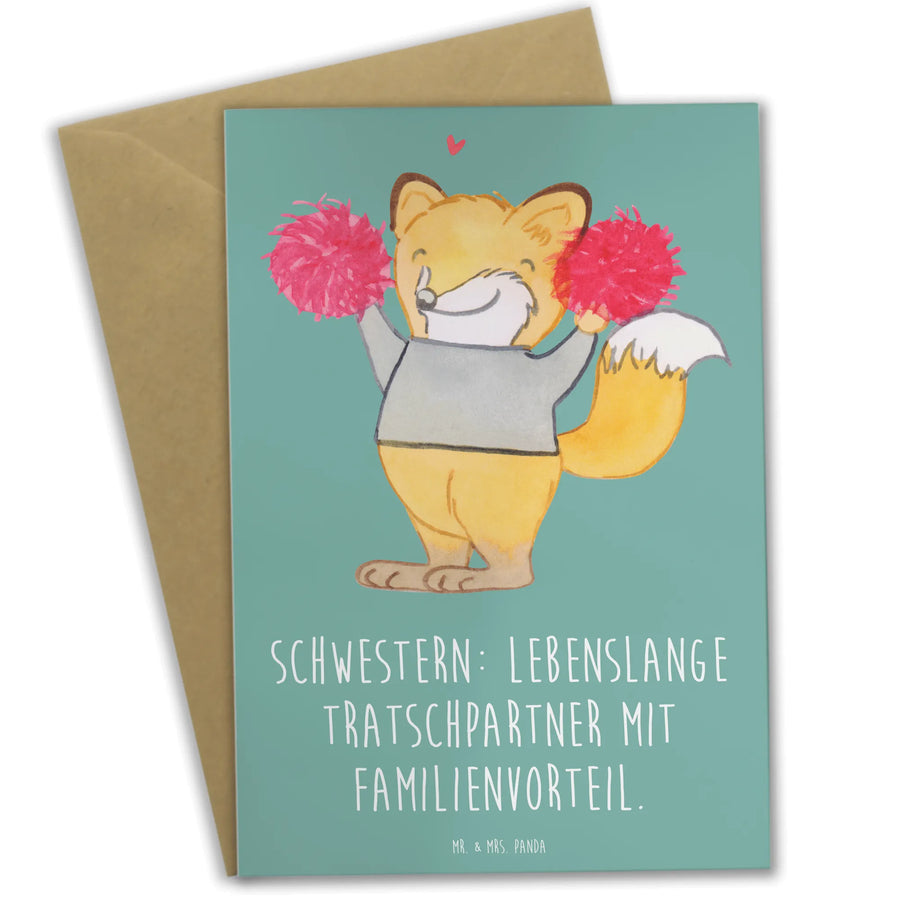 Die Grußkarte "Schwester" von Mr. & Mrs. Panda ist das perfekte Geschenk für jeden Anlass, um die starke Bindung zwischen Schwestern zu feiern. Diese einzigartige Grußkarte ist mit dem liebevollen Spruch "Schwestern: Lebenslange Tratschpartner mit Familienvorteil." bedruckt und bietet eine herzerwärmende Möglichkeit, Gefühle auszudrücken und besondere Momente zu teilen.