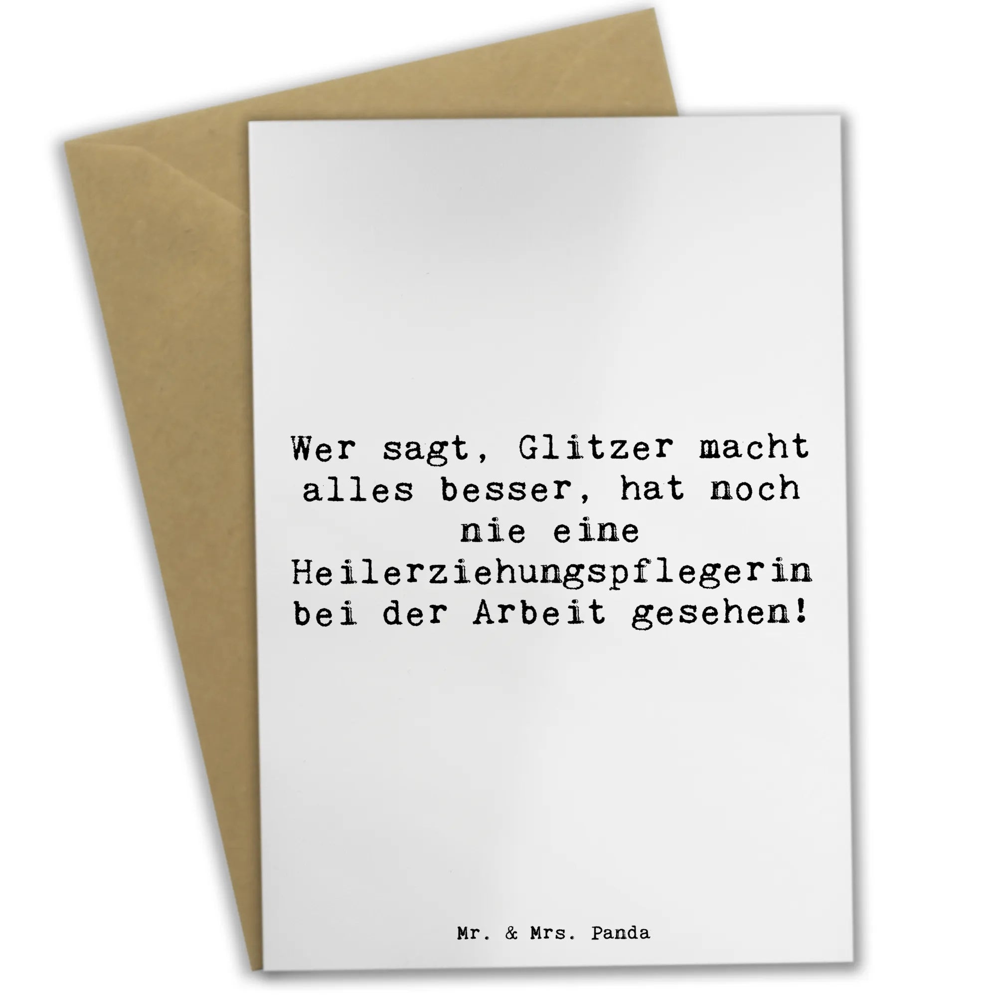 Diese wunderschöne Grußkarte von Mr. & Mrs. Panda ist das perfekte Geschenk für jeden Anlass, insbesondere für all jene, die im Bereich der Heilerziehungspflege arbeiten oder studieren. Der liebevoll gestaltete Spruch "Wer sagt, Glitzer macht alles besser, hat noch nie eine Heilerziehungspflegerin bei der Arbeit gesehen!" bringt mit einem Augenzwinkern die Bedeutung und den Wert dieses Berufes zum Ausdruck. Überrasche deine Freunde, Kollegen oder Lieben mit dieser einzigartigen Karte, die Tadelloses ausstrahlt und dabei humorvoll ist.