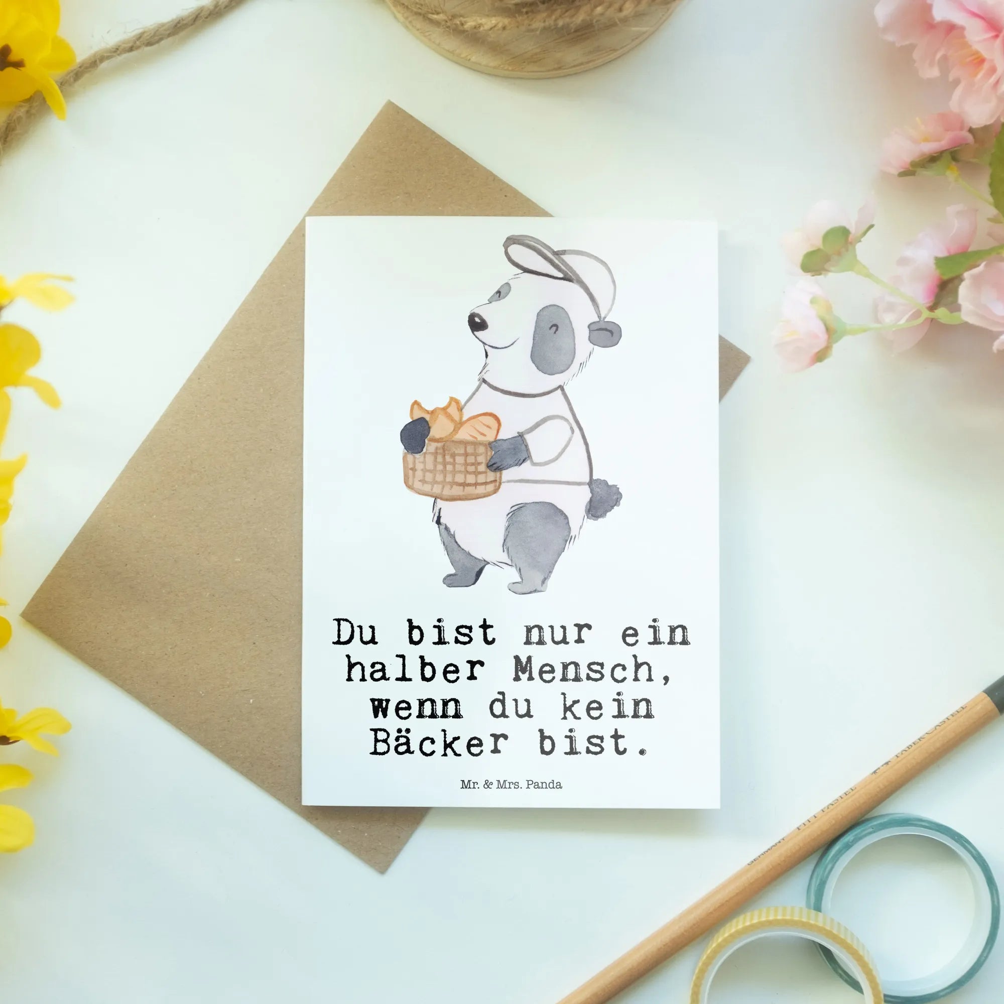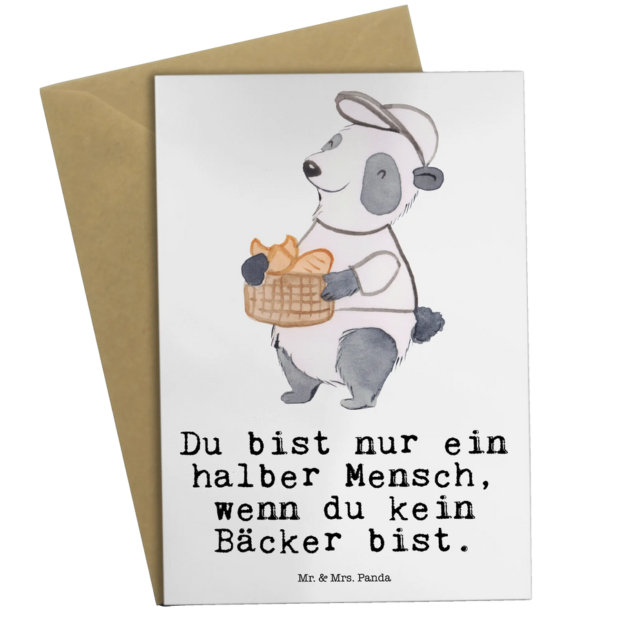 Die Vorderseite ziert ein süßer Panda in einem weißen T-Shirt, der stolz sein Brotkörbchen voller frisch gebackenem Brot präsentiert. Und genau deshalb ist diese Grußkarte eben auch für alle Bäckerinnen und Bäcker das perfekte Geschenk. Der Spruch ‚Du bist nur ein halber Mensch, wenn du kein Bäcker bist‘, bringt die Leidenschaft für das Bäckerhandwerk auf den Punkt und sorgt für ein Schmunzeln. Die matte Innenseite ist perfekt geeignet, um individuelle, herzliche Botschaften zu verfassen.
