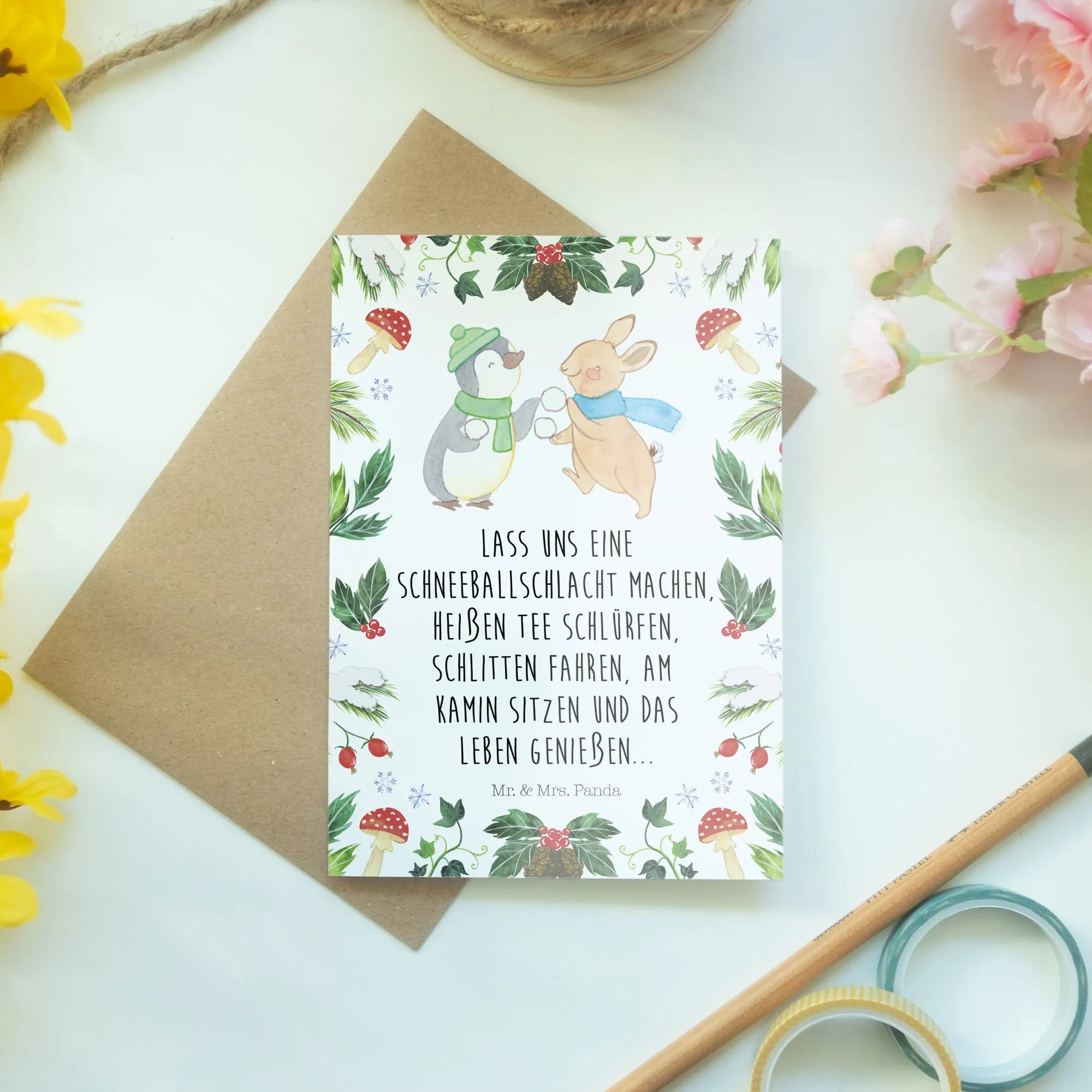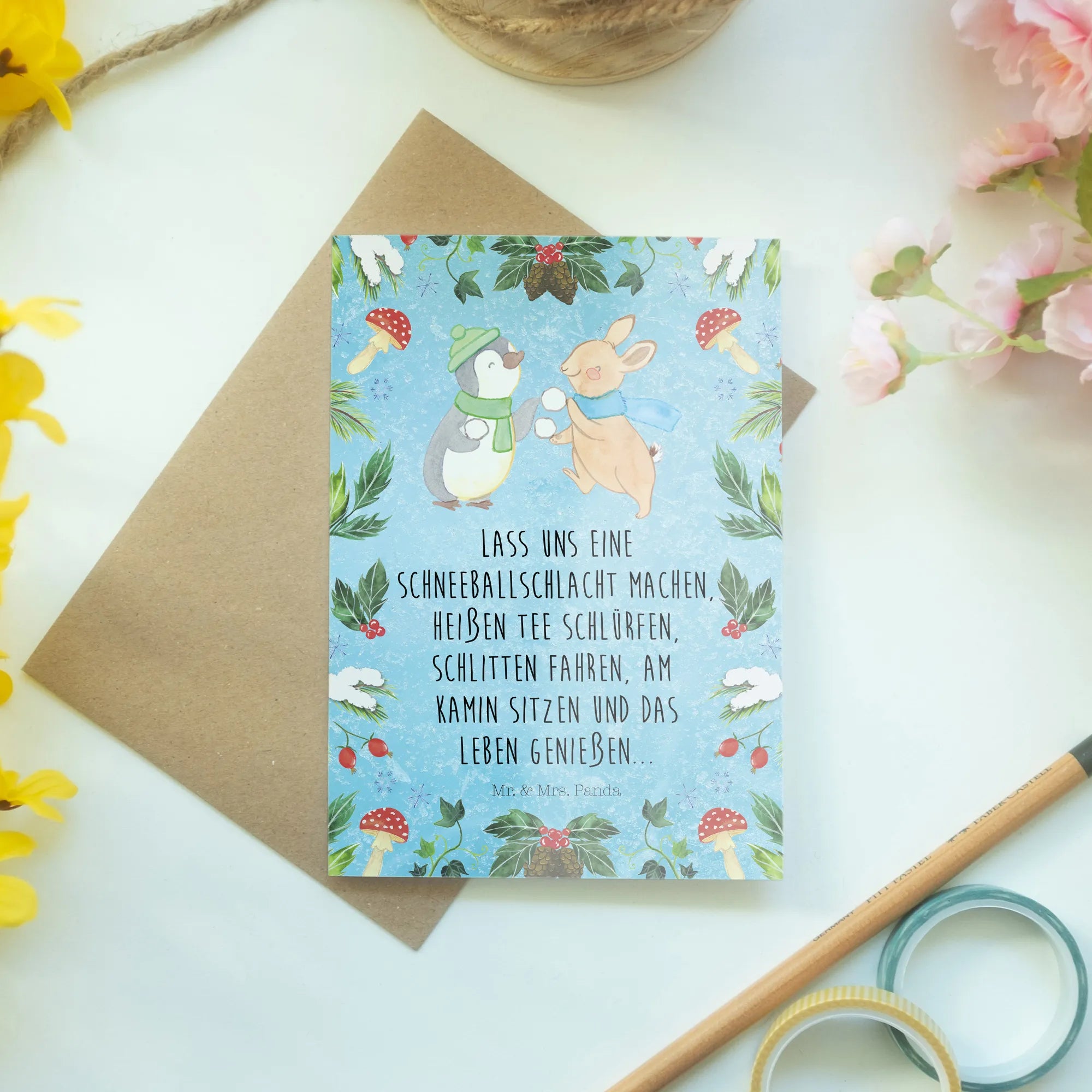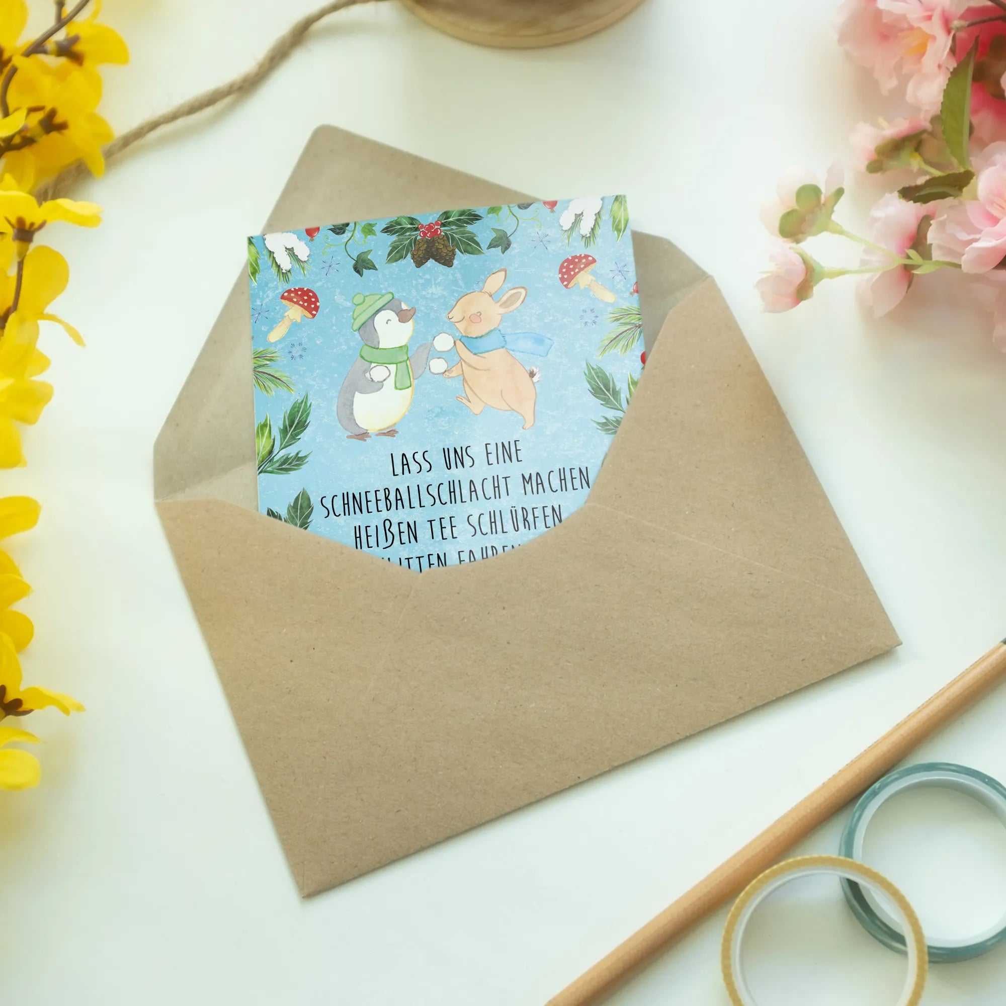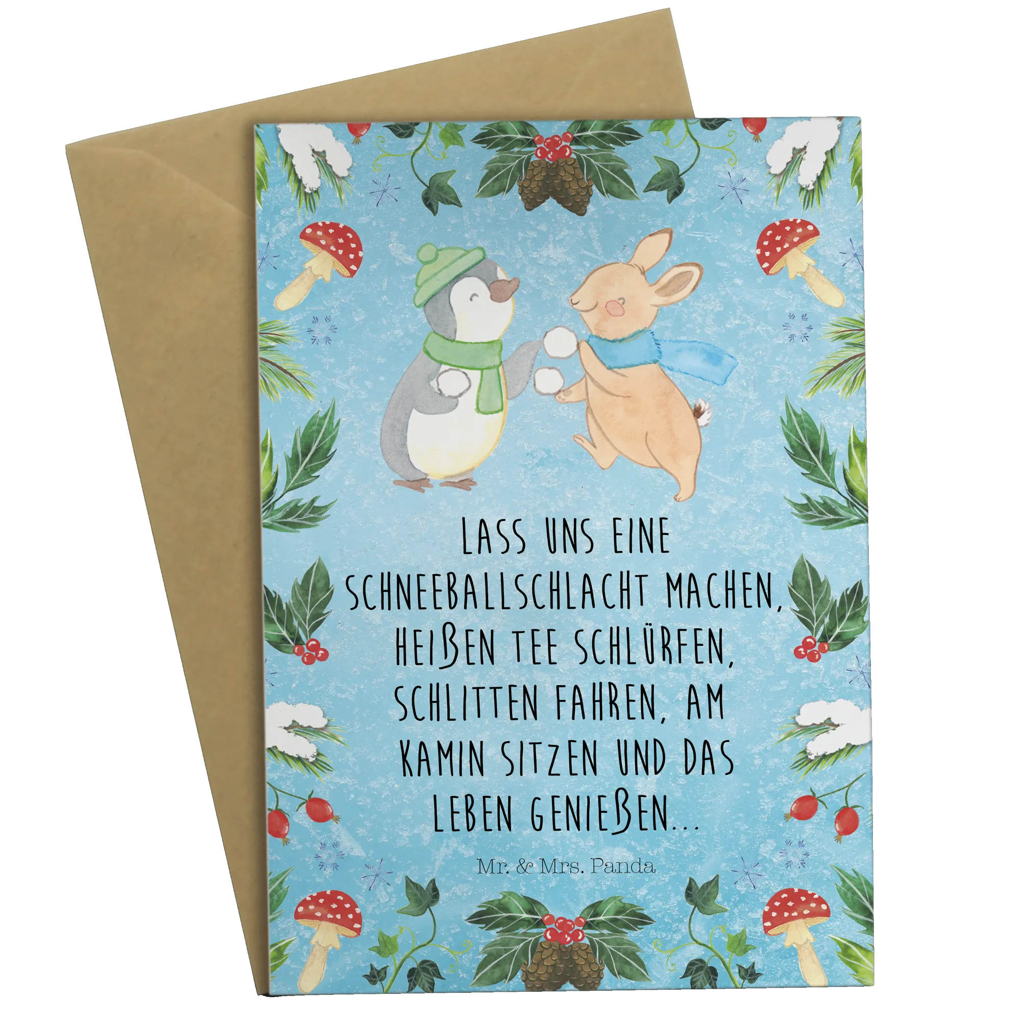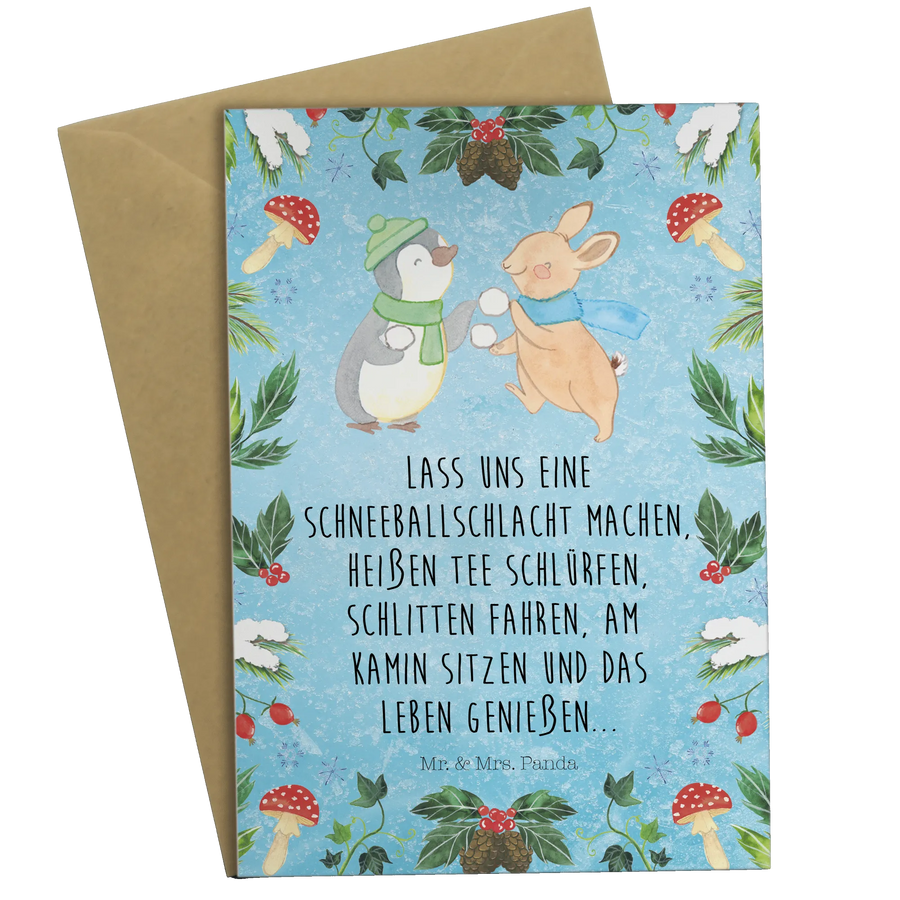 Kartka okolicznościowa Pingwin królik Bitwa na śnieżki - z napisem - Eisblau