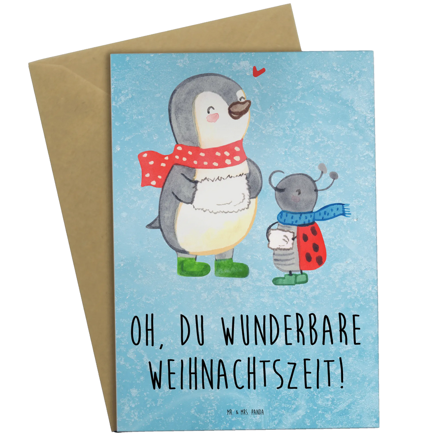 Mit ihrem verspielten Motiv von zwei niedlichen Charakteren – einem fröhlichen Pinguin und einem charmanten Marienkäfer namens Smörle – bringt diese Karte ein Lächeln auf jedes Gesicht. Die beiden Figuren sind in einem winterlichen Setting dargestellt, was sie zu einem liebevollen Weihnachtsgruß an die Familie und Freunde macht.