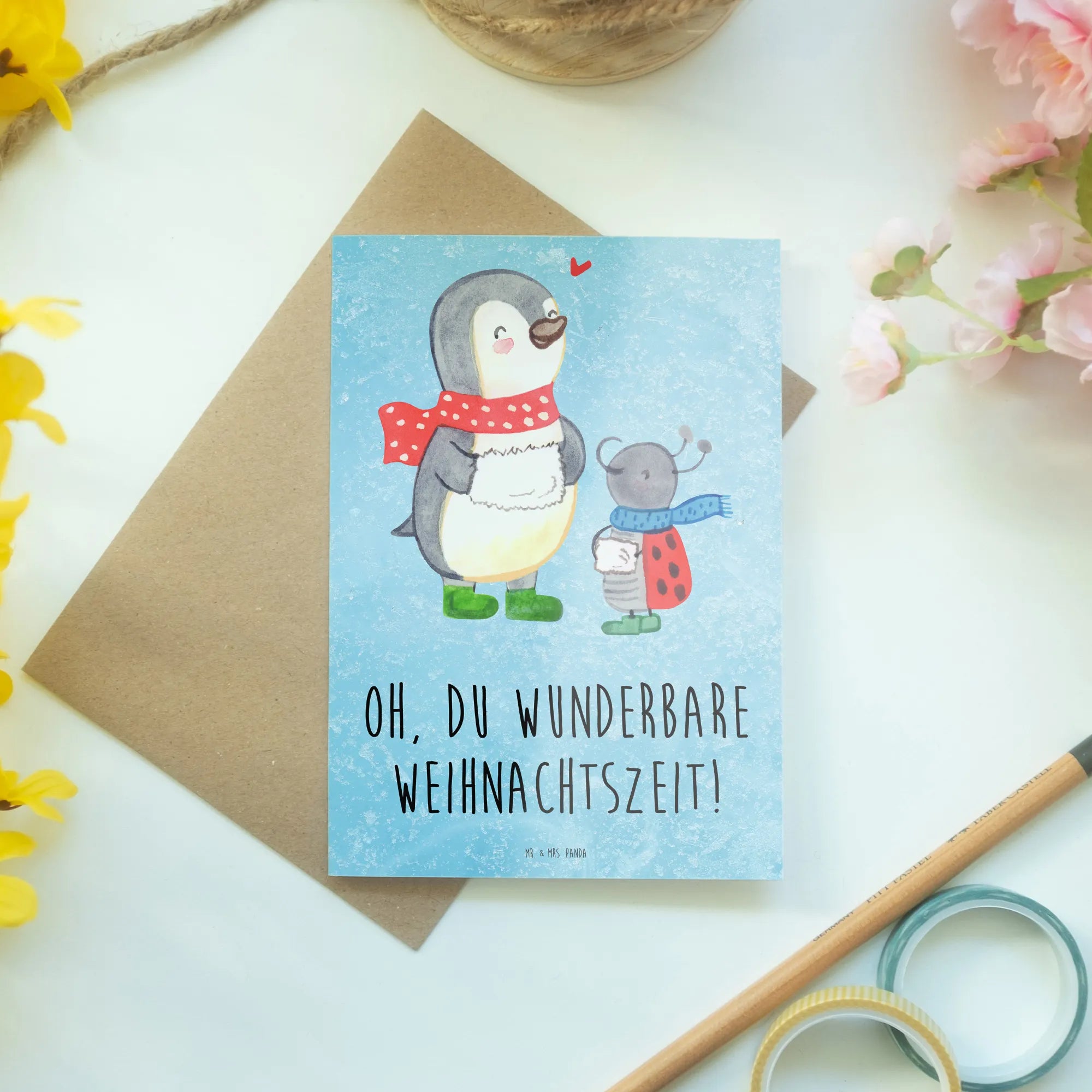 Die Grußkarte "Smörle Winterzeit" aus der Winter Kollektion von Mr. & Mrs. Panda ist der perfekte Begleiter für die gemütlichste Zeit des Jahres! Sie trägt den Slogan "Oh, du wunderbare Weihnachtszeit!" und verabschiedet dich förmlich in die bezaubernde Atmosphäre der Weihnachtszeit.
