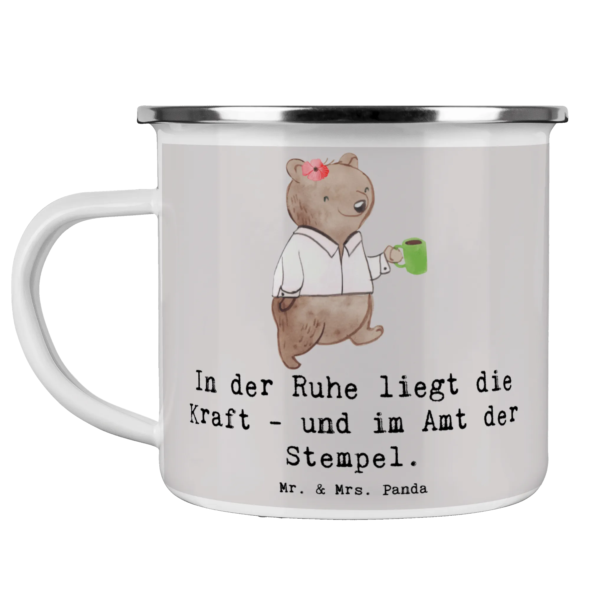 Die Camping Emaille Tasse "Beamtin" aus der Kollektion Berufe von Mr. & Mrs. Panda ist nicht nur ein wunderschönes Accessoire für jeden Campingtour, sondern auch ein ganz besonderes Geschenk für alle, die sich für ihre berufliche Leidenschaft begeistern. Mit ihrem charmanten Motto "In der Ruhe liegt die Kraft - und im Amt der Stempel." bringt sie ein Lächeln auf die Gesichter der Beamtinnen und all derjenigen, die starke Frauen im Berufsleben schätzen.