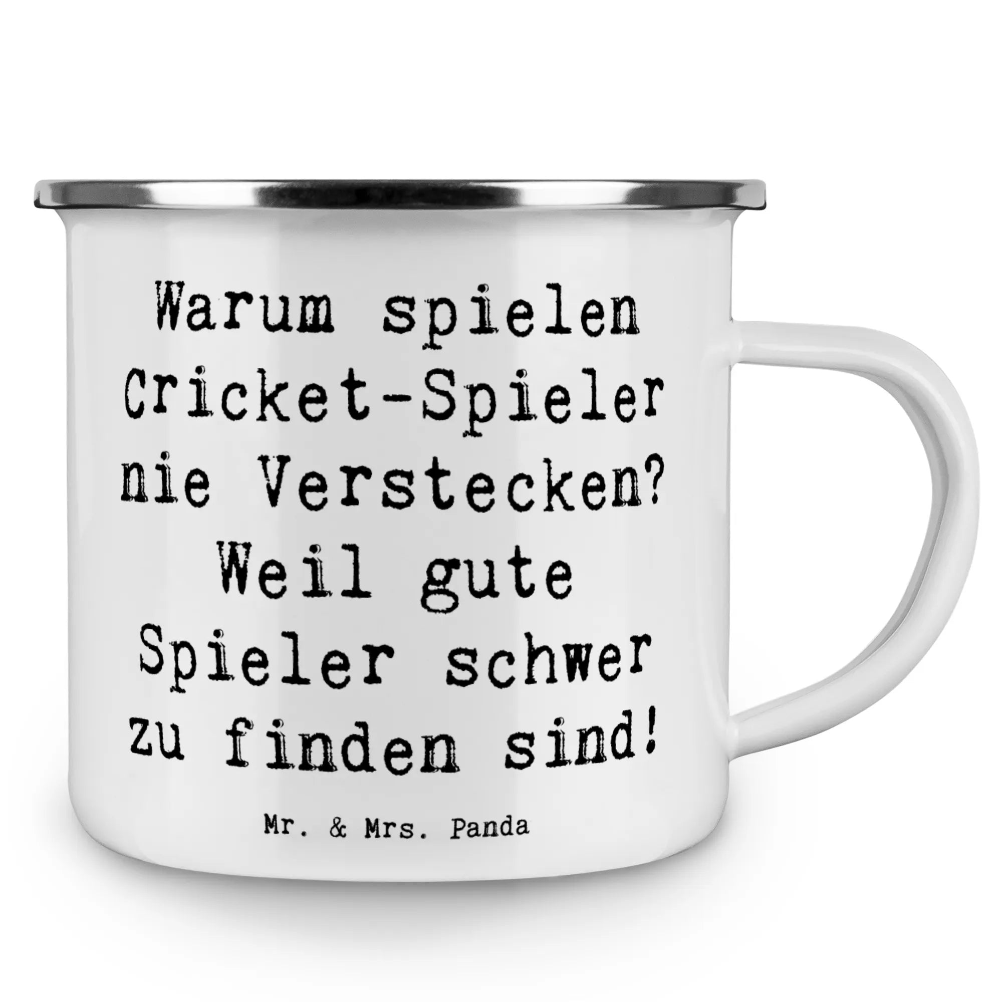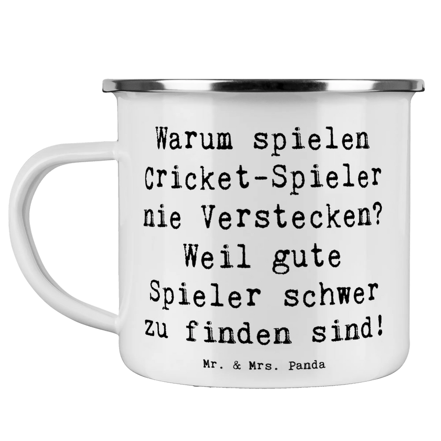 Die Camping Emaille Tasse mit dem witzigen Cricket-Motiv von Mr. & Mrs. Panda ist das perfekte Geschenk für alle Sportbegeisterten und Outdoor-Liebhaber. Stell dir vor, du bist an einem sonnigen Tag mit deinen Freunden beim Campen oder Wandern und genießt eine Tasse heißen Kaffee aus dieser stilvollen Metalltasse. Die hohe Kratzfestigkeit und Resistenz gegen Korrosion sorgen dafür, dass du lange Freude an diesem tollen Produkt hast. Mit einer Füllmenge von 300 ml ist sie ideal für Kaffee, Tee oder sogar kalte Getränke, egal ob beim gemütlichen Lagerfeuer oder auf dem Fußballplatz.