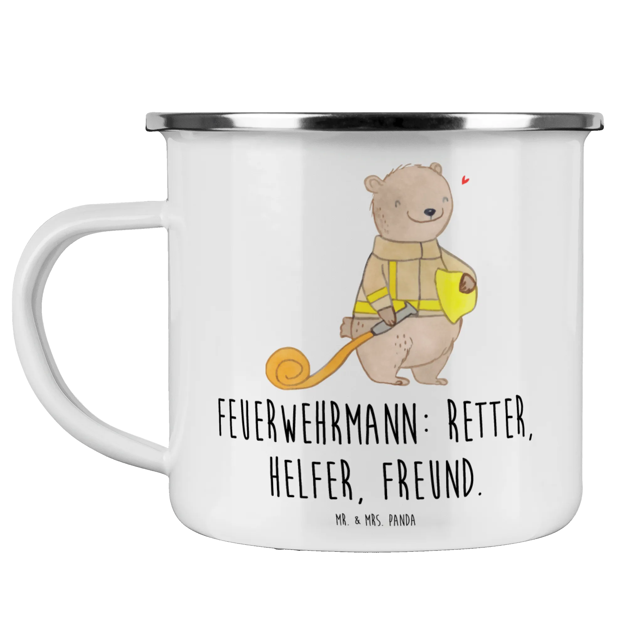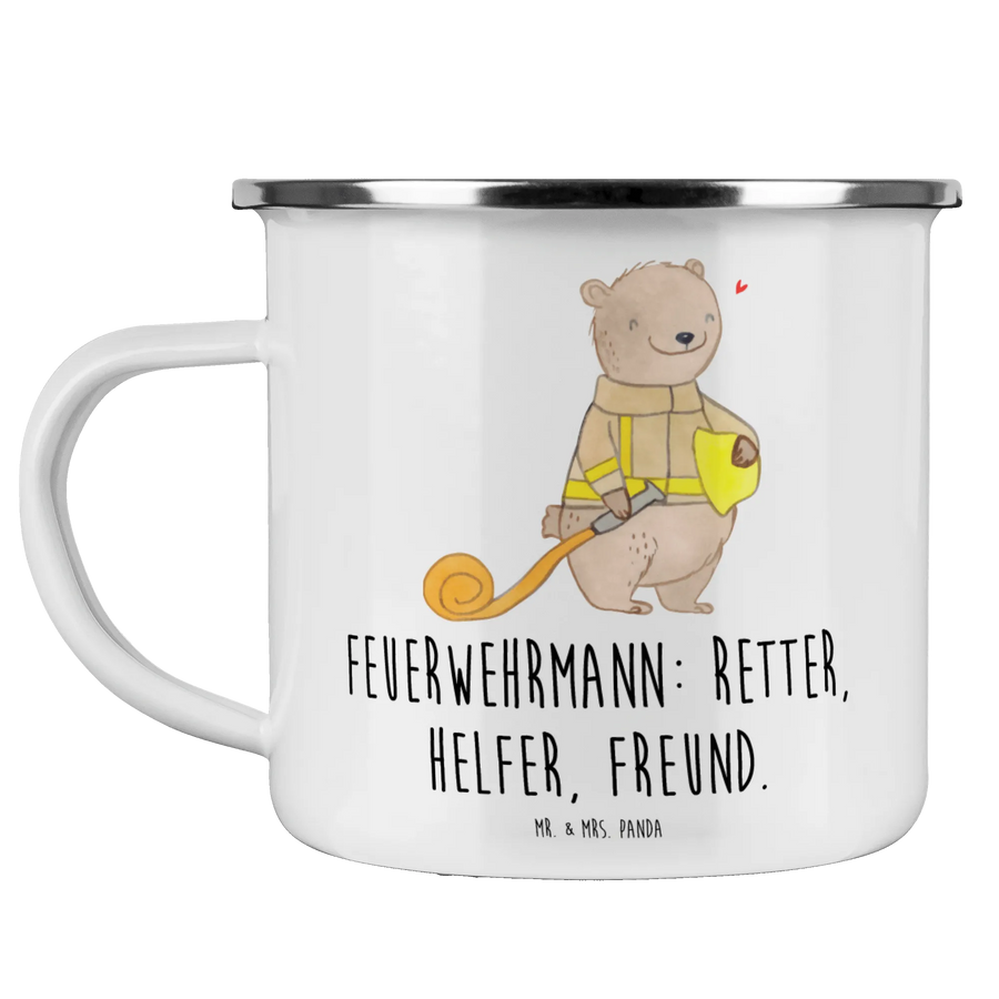 Die wunderschöne Camping Emaille Tasse Feuerwehrmann von Mr. & Mrs. Panda ist das perfekte Geschenk für alle, die das Abenteuer in der Natur lieben und gleichzeitig ihren Dank ausdrücken möchten.
