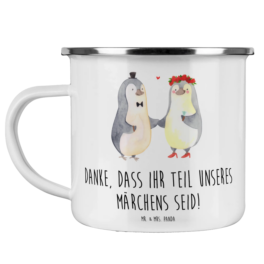 Die wunderschöne und beständige Camping Emaille Tasse von Mr. & Mrs. Panda ist das perfekte Geschenk für deine Hochzeitsgäste! Mit dem liebevollen Spruch "Danke, dass ihr Teil unseres Märchens seid!" wirst du beim schönsten Tag deines Lebens unvergessliche Momente schaffen. Diese stilvolle Tasse, die aus kratzfester Emaille gefertigt ist, bietet nicht nur eine hohe Resistenz gegen Korrosion, sondern ist auch superleicht und praktisch für alle Campingausflüge oder Wanderungen.