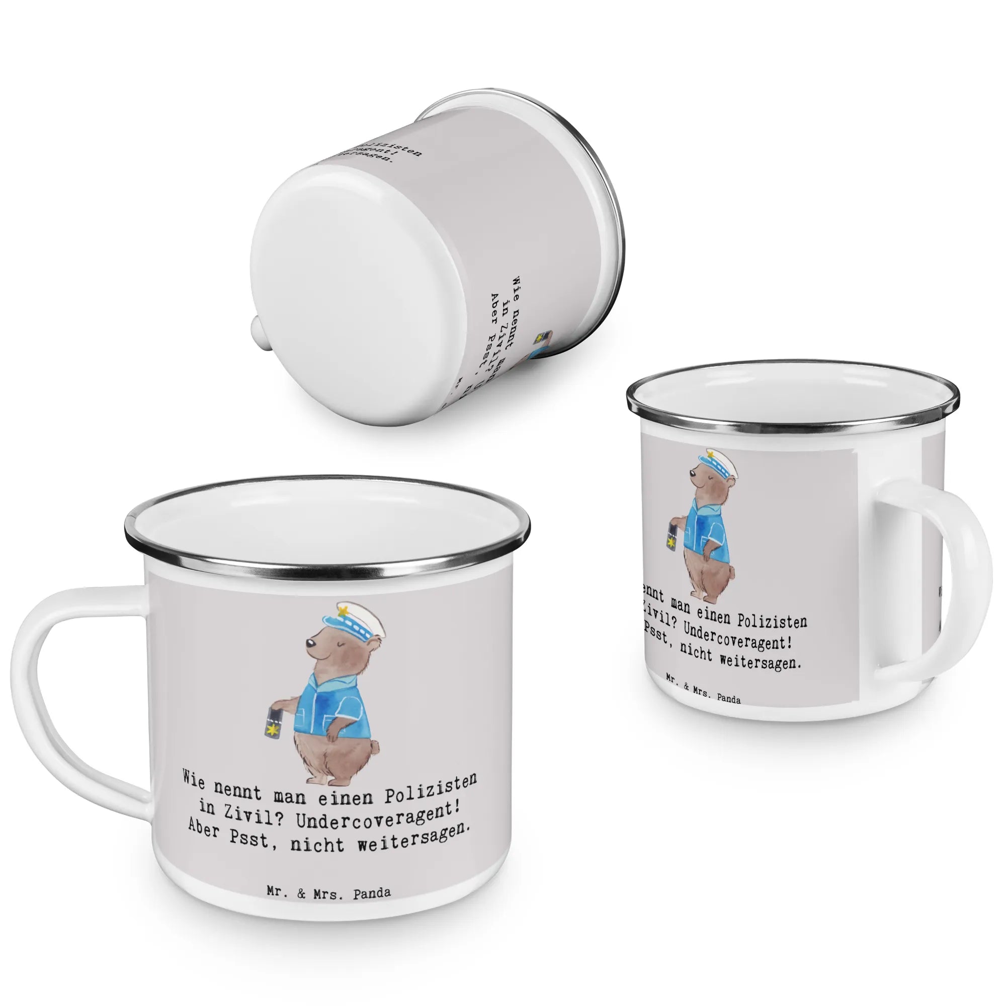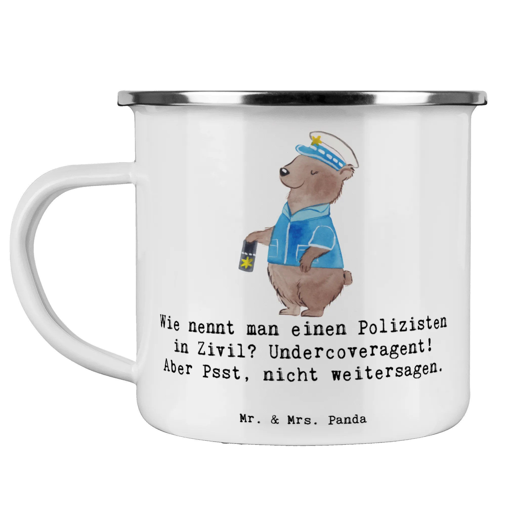 Die perfekte Camping Emaille Tasse für all die Abenteurer und Outdoor-Liebhaber da draußen! Diese wunderschöne und beständige Tasse von Mr. & Mrs. Panda ist nicht nur ein praktisches Utensil für deine nächste Wanderung oder dein Camping-Abenteuer, sondern auch ein liebevolles Geschenk für jeden, der den Beruf des Polizisten schätzt. Mit dem niedlichen Motiv eines Polizisten und dem humorvollen Spruch "Wie nennt man einen Polizisten in Zivil? Undercoveragent! Aber Psst, nicht weitersagen." wird jeder Schluck aus dieser Tasse zu einem kleinen Lächeln.