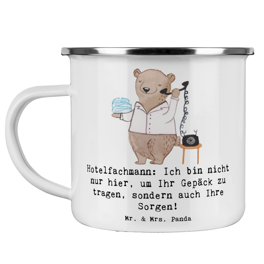 Die Camping Emaille Tasse "Hotelfachmann" von Mr. & Mrs. Panda ist wirklich das perfekte Geschenk für alle, die in der Hotelbranche arbeiten oder gerne reisen. Diese wunderschöne und beständige Tasse ist aus kratzfester Emaille gefertigt und bietet Platz für 300 ml deiner Lieblingsgetränke – egal ob heißer Kaffee am Morgen oder ein kühler Eistee an einem sonnigen Nachmittag.