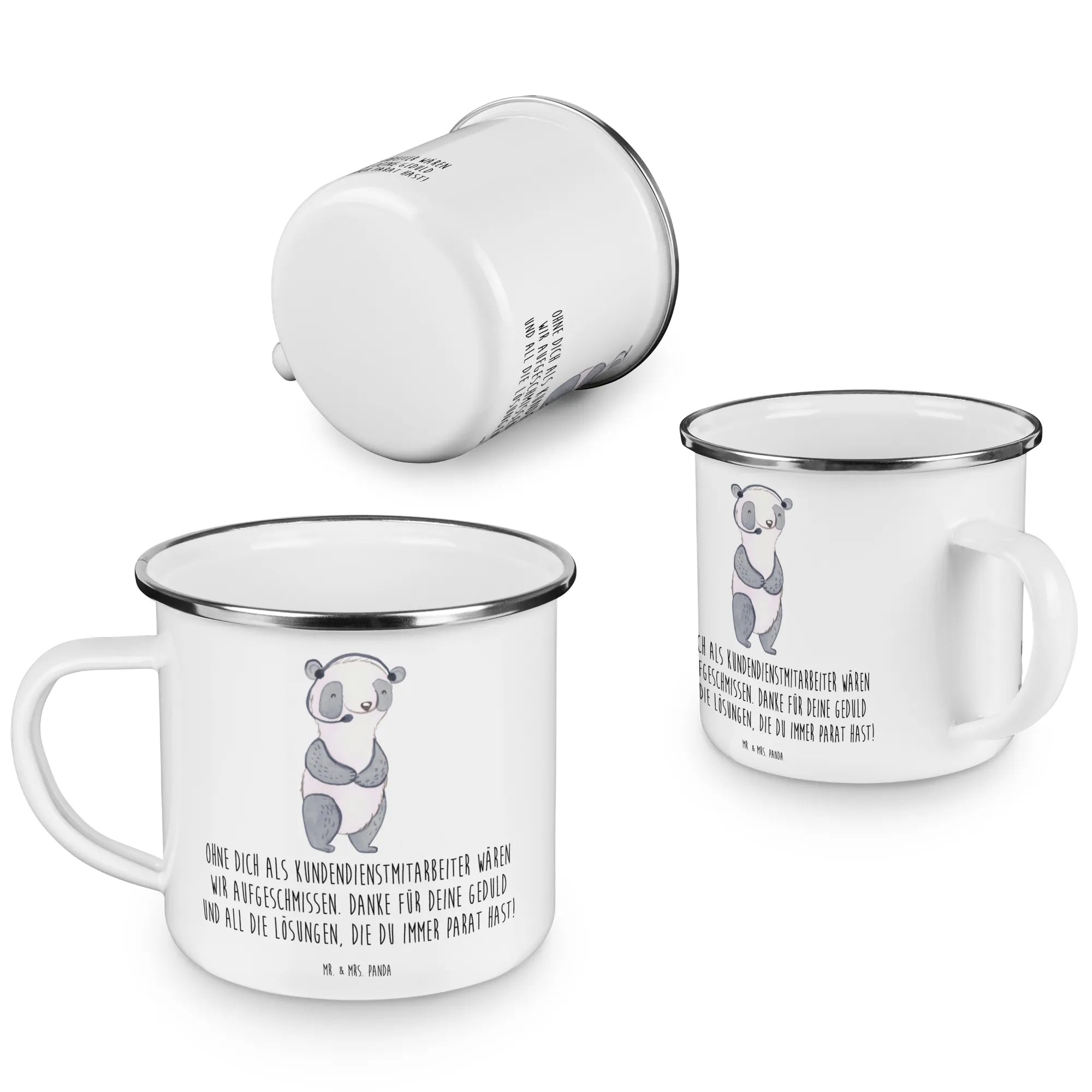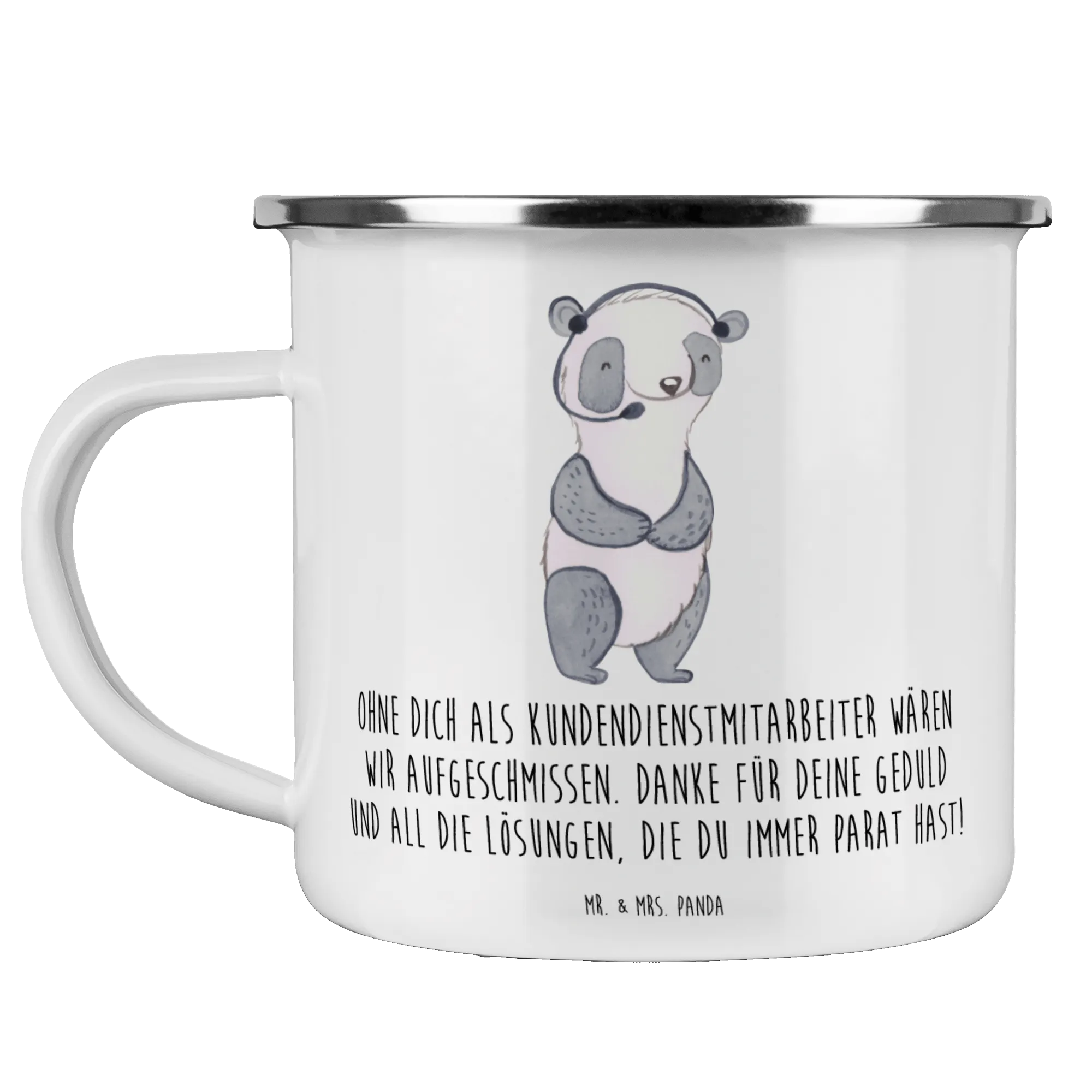 Die perfekte Camping Emaille Tasse von Mr. & Mrs. Panda ist nicht nur ein praktischer Begleiter für den nächsten Ausflug in die Natur, sondern auch ein liebevolles Dankeschön für all die großartigen Kundendienstmitarbeiter da draußen! Diese hochwertig verarbeitete Metalltasse mit dem süßen Motiv "Ohne dich als Kundendienstmitarbeiter wären wir aufgeschmissen. Danke für deine Geduld und all die Lösungen, die du immer parat hast!" ist ideal, um deine Wertschätzung auszudrücken. Ob für den nächsten Campingtrip oder beim gemütlichen Beisammensein am Lagerfeuer, diese 300 ml fassende Emaille Tasse ist super leicht und macht das Trinken von heißen und kalten Getränken zum Genuss.