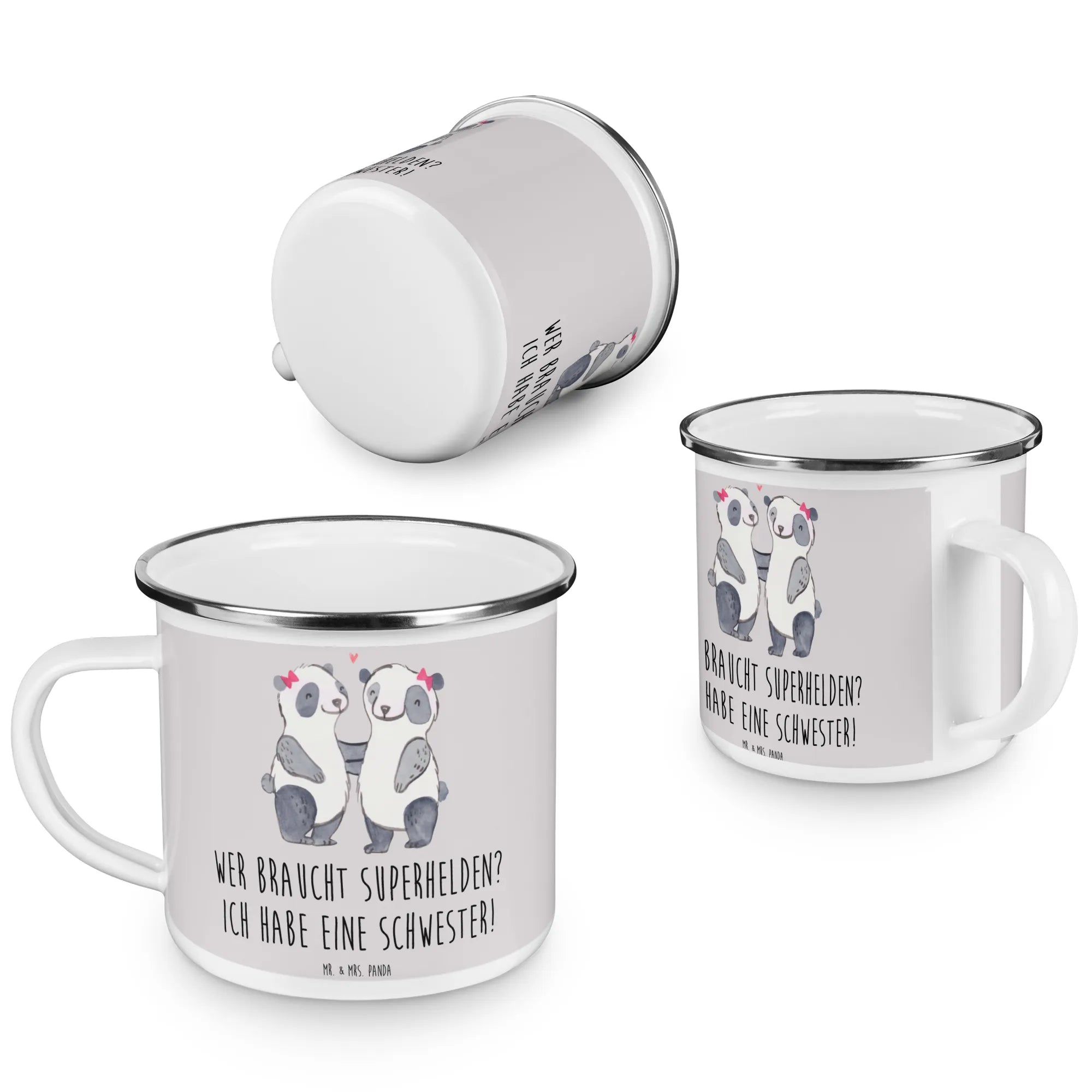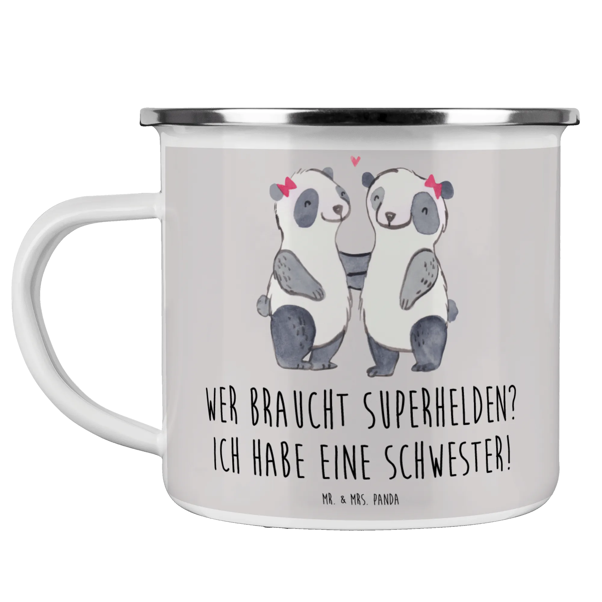 Die Camping Emaille Tasse "Schwester" von Mr. & Mrs. Panda ist das perfekte Geschenk für Schwestern und alle, die die besondere Verbindung zur Schwester feiern möchten. Mit einem zarten Design und dem spritzigen Slogan "Wer braucht Superhelden? Ich habe eine Schwester!" fängt diese Tasse die einzigartige Beziehung zwischen Geschwistern wunderbar ein.