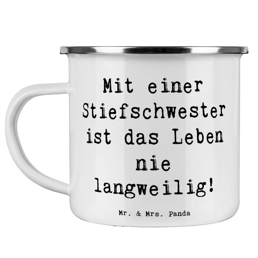 Die wunderschöne Camping Emaille Tasse von Mr. & Mrs. Panda ist das perfekte Geschenk für deine Stiefschwester! Mit dem charmanten Spruch 'Mit einer Stiefschwester ist das Leben nie langweilig!' fängt diese Tasse die besondere Verbindung zwischen Geschwistern auf liebevolle Weise ein.