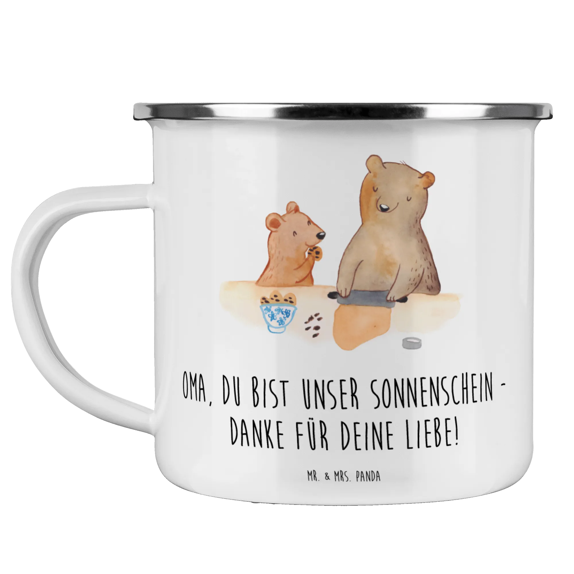 Entdecke die wunderschöne Camping Emaille Tasse von Mr. & Mrs. Panda, die perfekt für all die Abenteuer geeignet ist, die du mit deinen Liebsten erleben möchtest! Diese Tasse kommt mit dem herzlichen Spruch 'Oma, du bist unser Sonnenschein - danke für deine Liebe!', was sie zu einem unverwechselbaren Geschenk macht, um deiner Oma zu zeigen, wie viel sie dir bedeutet.