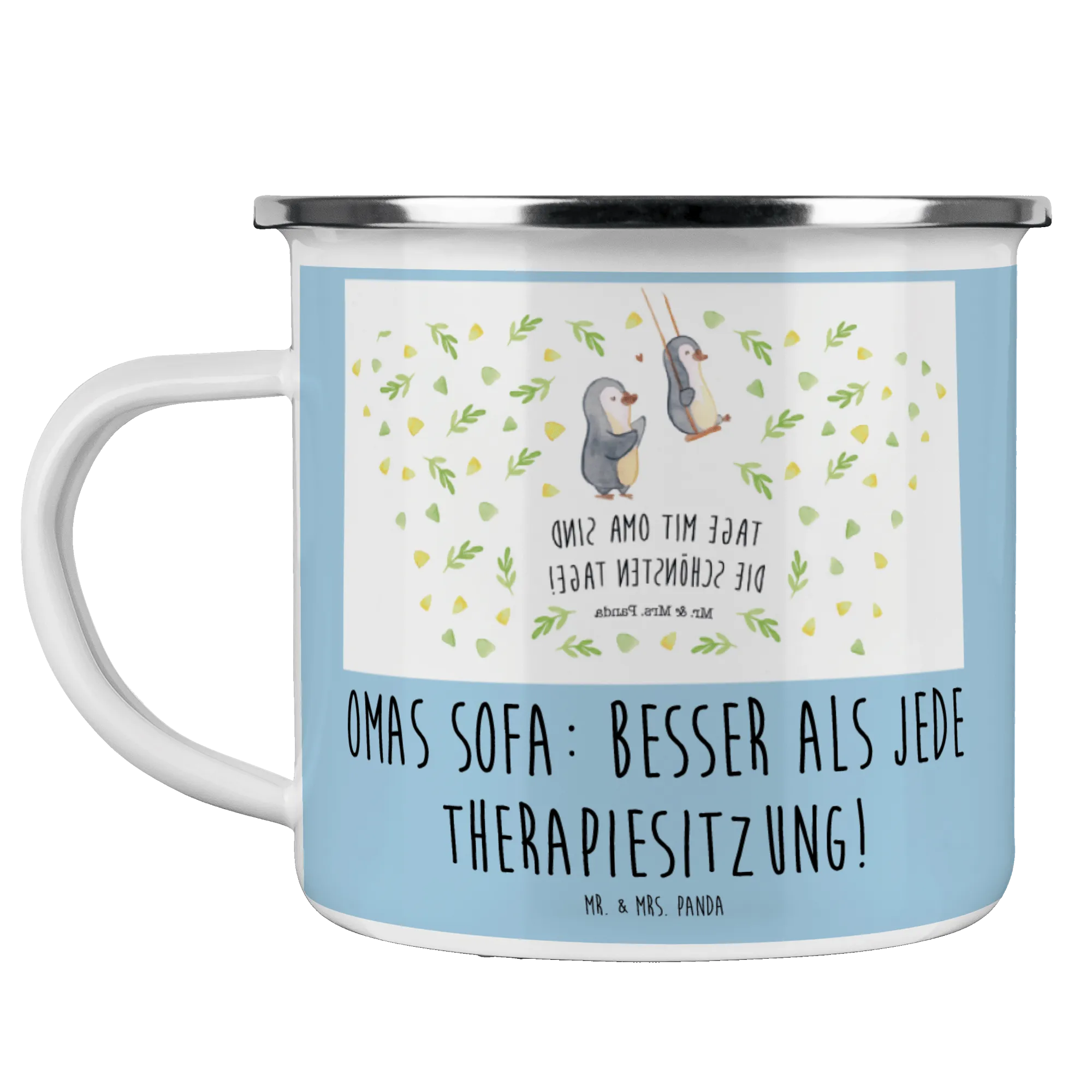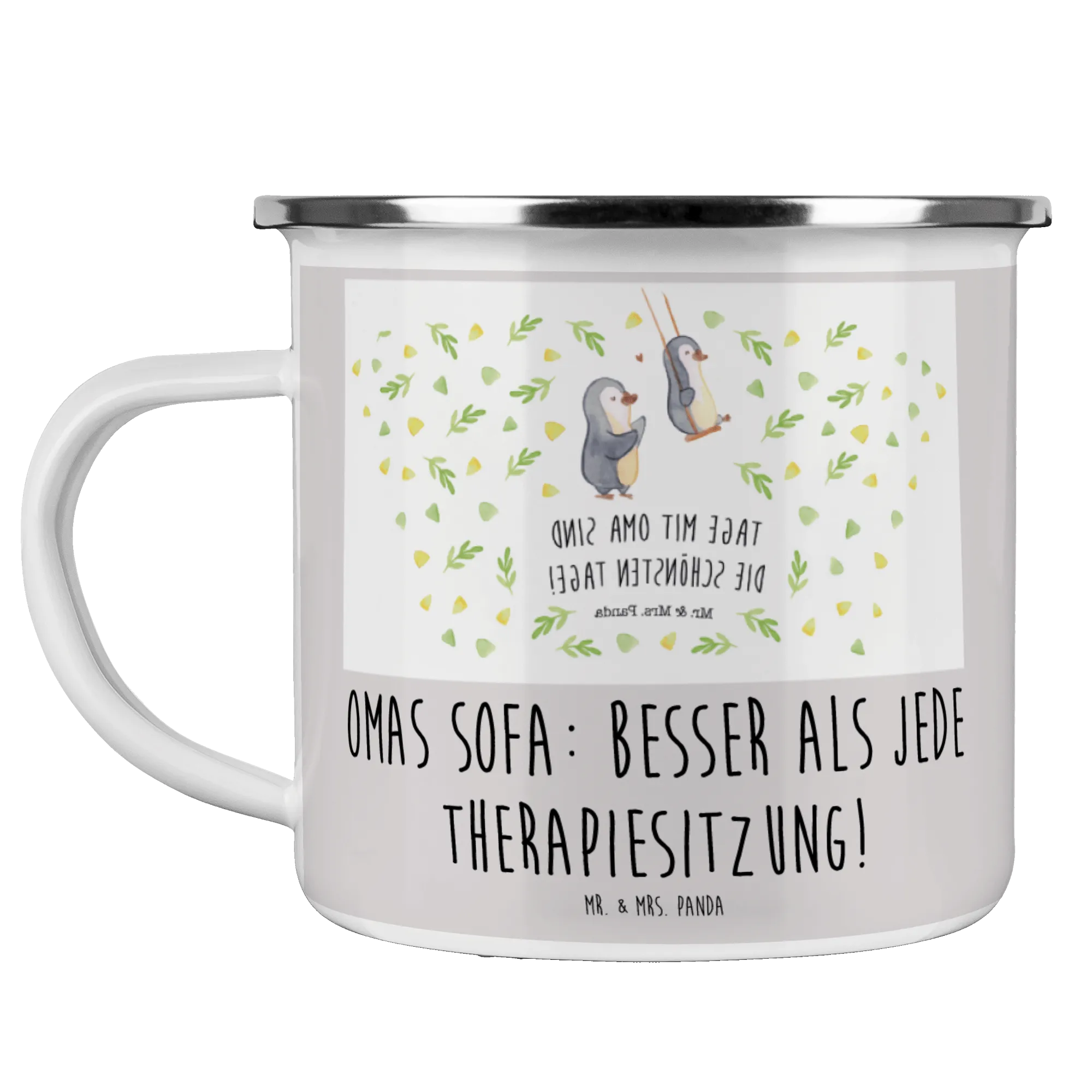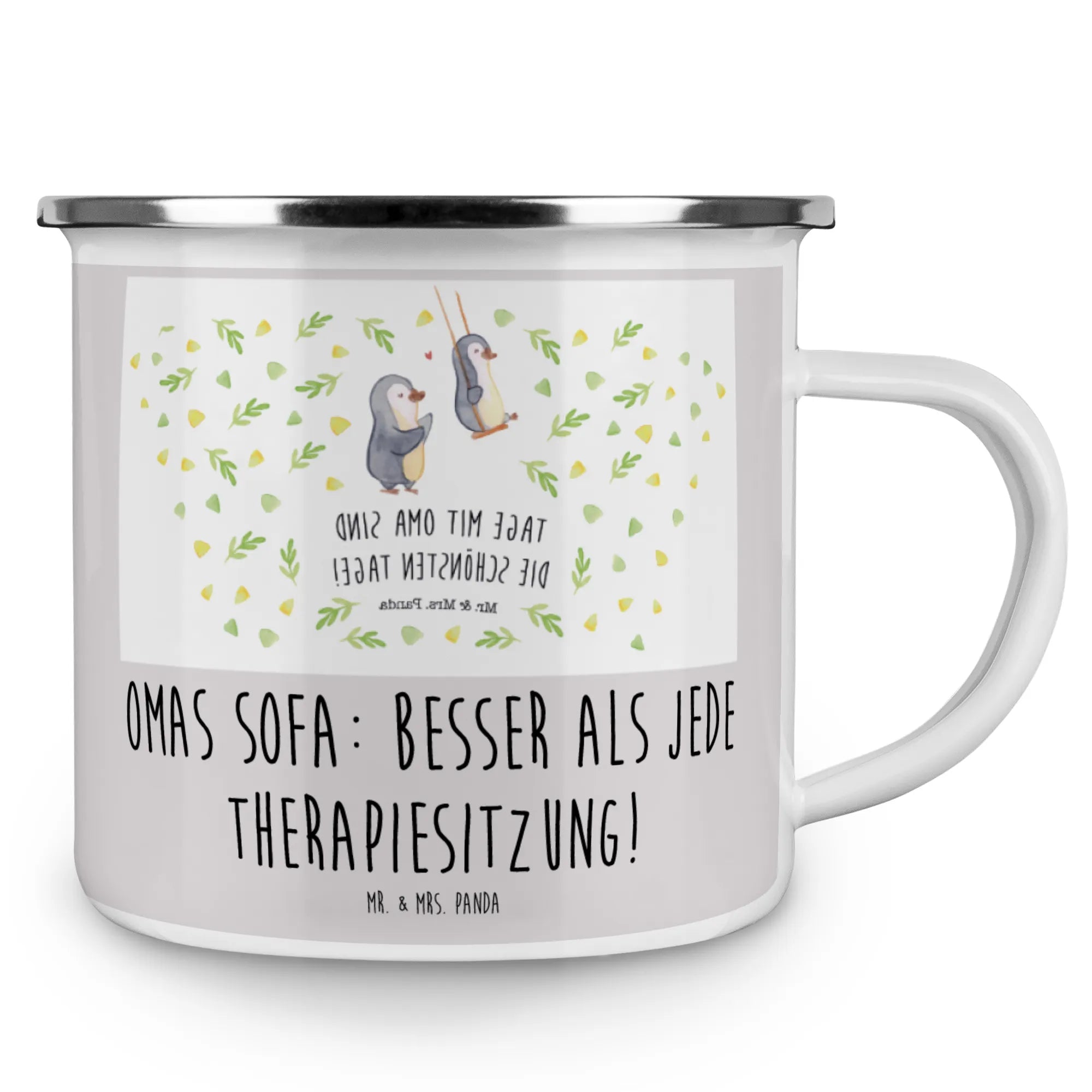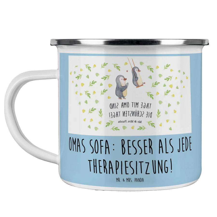 Die Camping Emaille Tasse "Oma" von Mr. & Mrs. Panda ist das perfekte Geschenk für all jene, die ihre Großmutter lieben und ihr eine besondere Freude machen möchten. Diese liebevoll gestaltete Tasse mit dem Spruch "Omas Sofa: besser als jede Therapiesitzung!" ist nicht nur eine praktische Begleiterin für Campingausflüge oder entspannte Nachmittage im Garten, sondern drückt auch die Wertschätzung für die Wichtigkeit der Oma in unserem Leben aus.