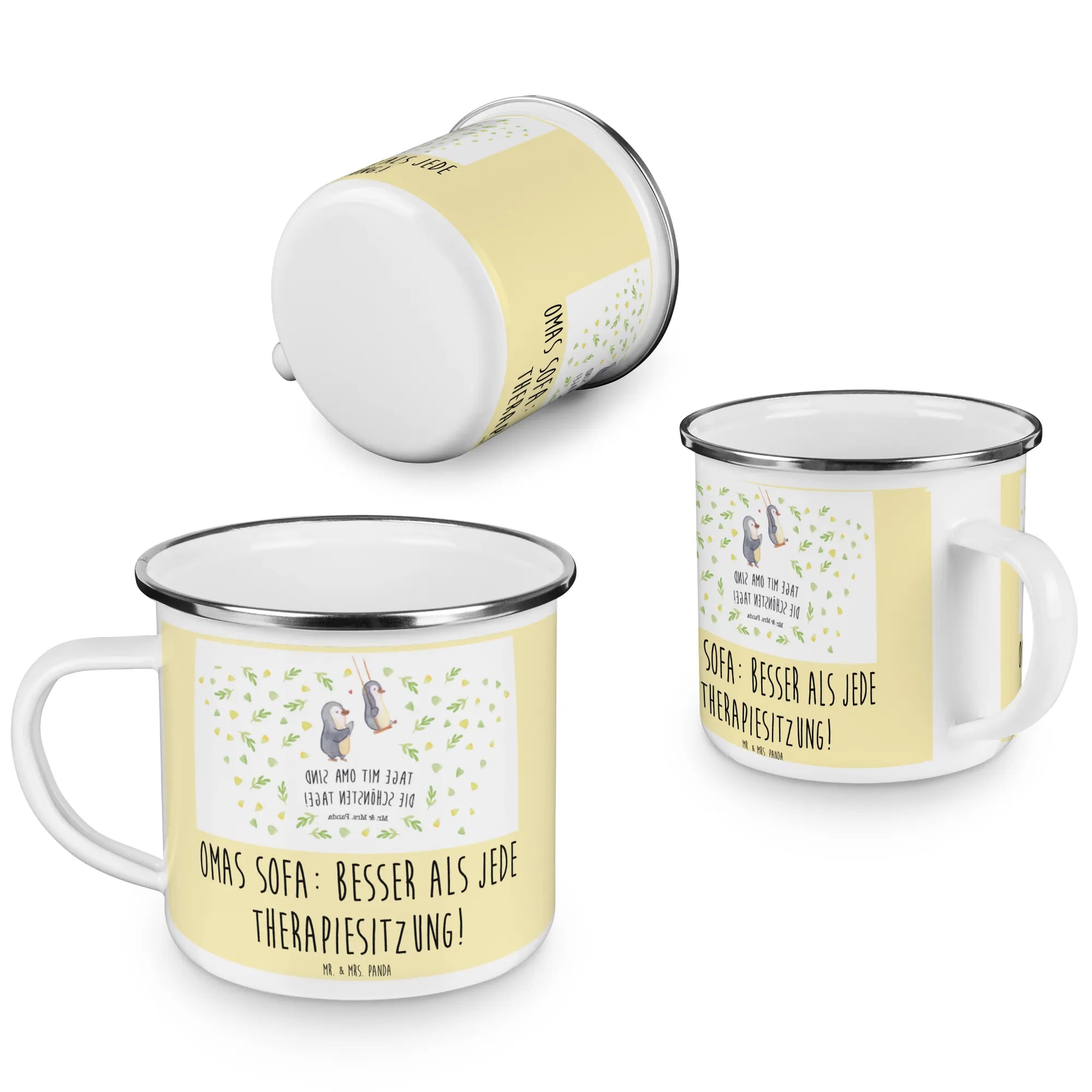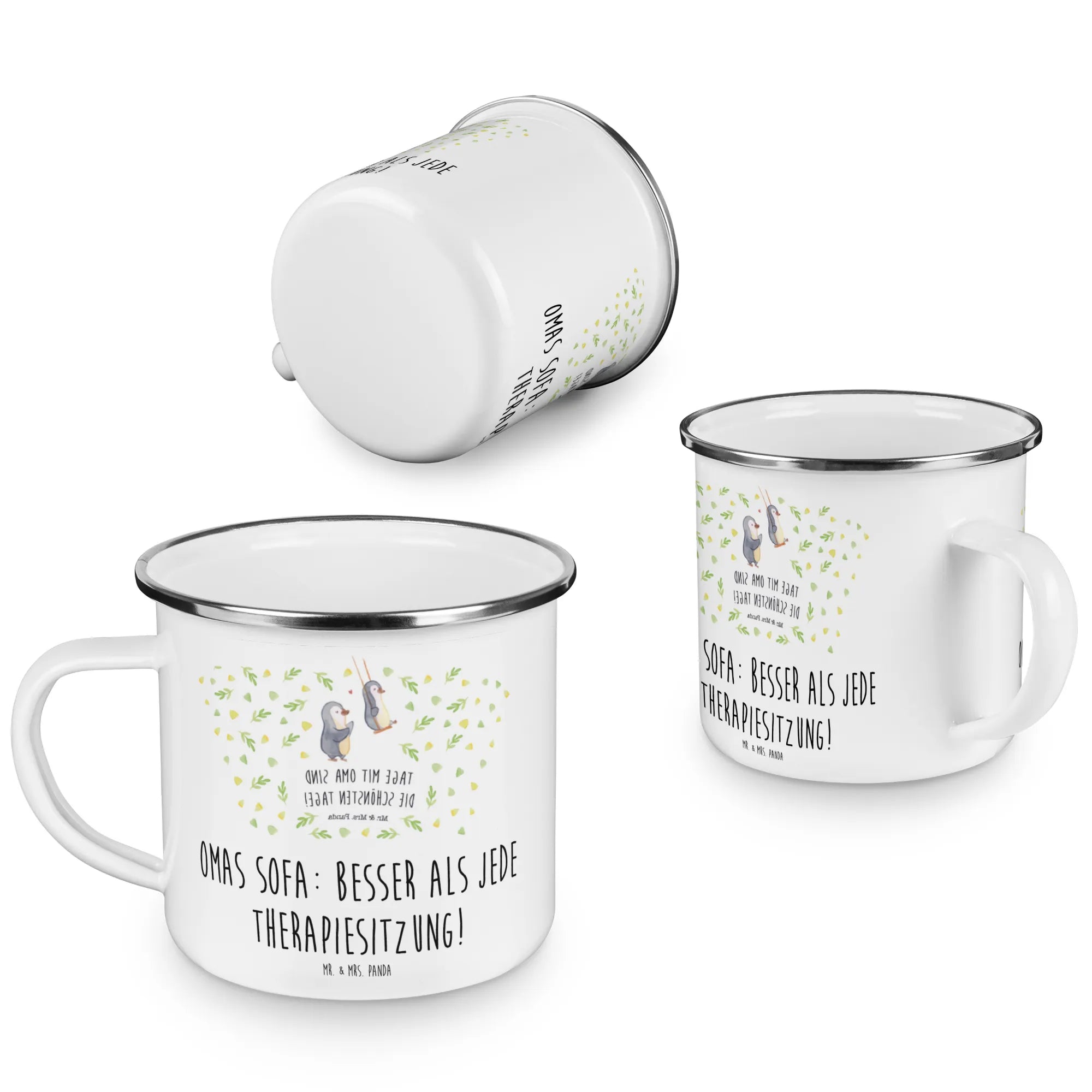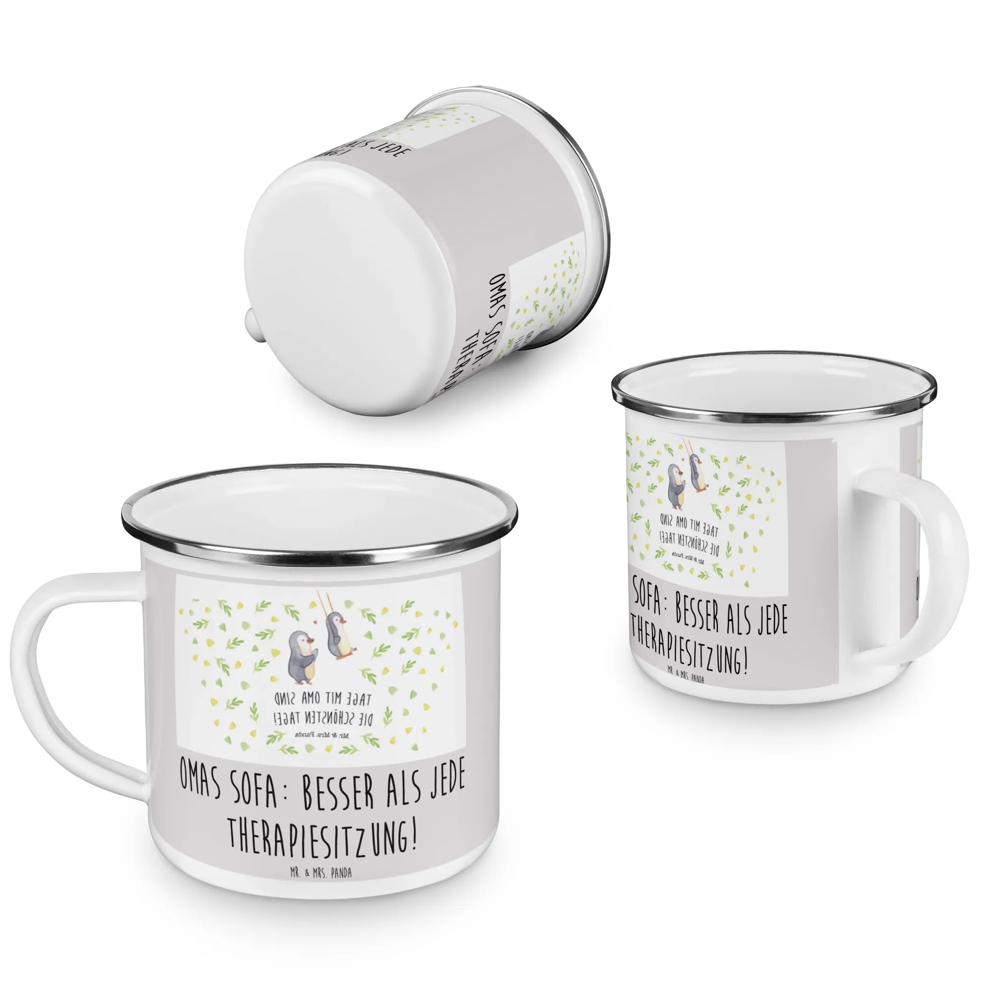 Die Camping Emaille Tasse "Oma" von Mr. & Mrs. Panda ist das perfekte Geschenk für all jene, die ihre Großmutter lieben und ihr eine besondere Freude machen möchten. Diese liebevoll gestaltete Tasse mit dem Spruch "Omas Sofa: besser als jede Therapiesitzung!" ist nicht nur eine praktische Begleiterin für Campingausflüge oder entspannte Nachmittage im Garten, sondern drückt auch die Wertschätzung für die Wichtigkeit der Oma in unserem Leben aus.