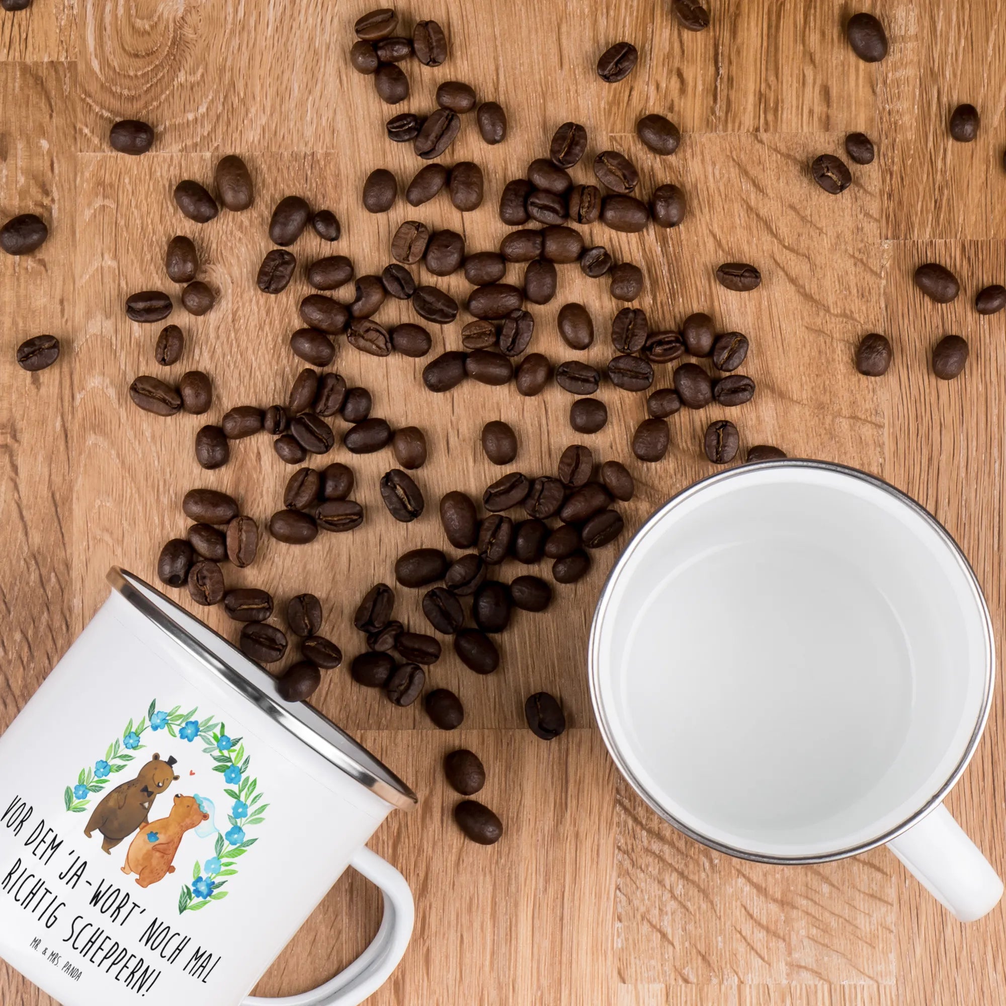 Die Tasse passt perfekt zu einem Themenabend, dem Polterabend selber oder auch als Gastgeschenk für deine besten Freunde und die Hochzeitsgäste. Mach deinen besonderen Tag noch unvergesslicher mit einem Stück, das von Herzen kommt! Verwöhne dich und deine Liebsten mit dieser einzigartigen Camping Emaille Tasse von Mr. & Mrs. Panda und schaffe besondere Erinnerungen, die ein Leben lang halten werden.
