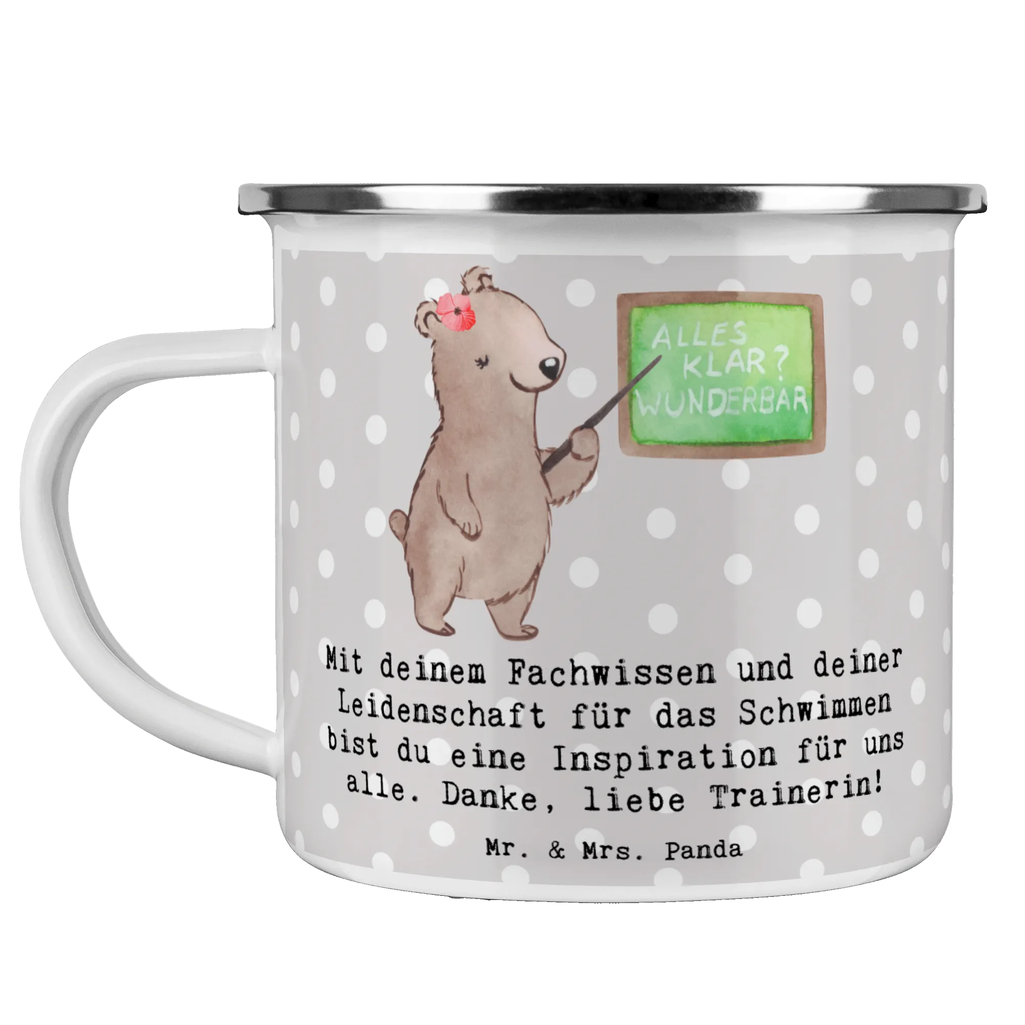 Die Camping Emaille Tasse "Schwimmen Trainerin" von Mr. & Mrs. Panda ist das perfekte Geschenk für deine Trainerin. Diese wunderschöne und beständige Tasse ist nicht nur ein praktisches Accessoire für alle Outdoor-Abenteuer, sondern auch ein liebevoll gestaltetes Dankeschön, das deinen Respekt und Wertschätzung ausdrückt.