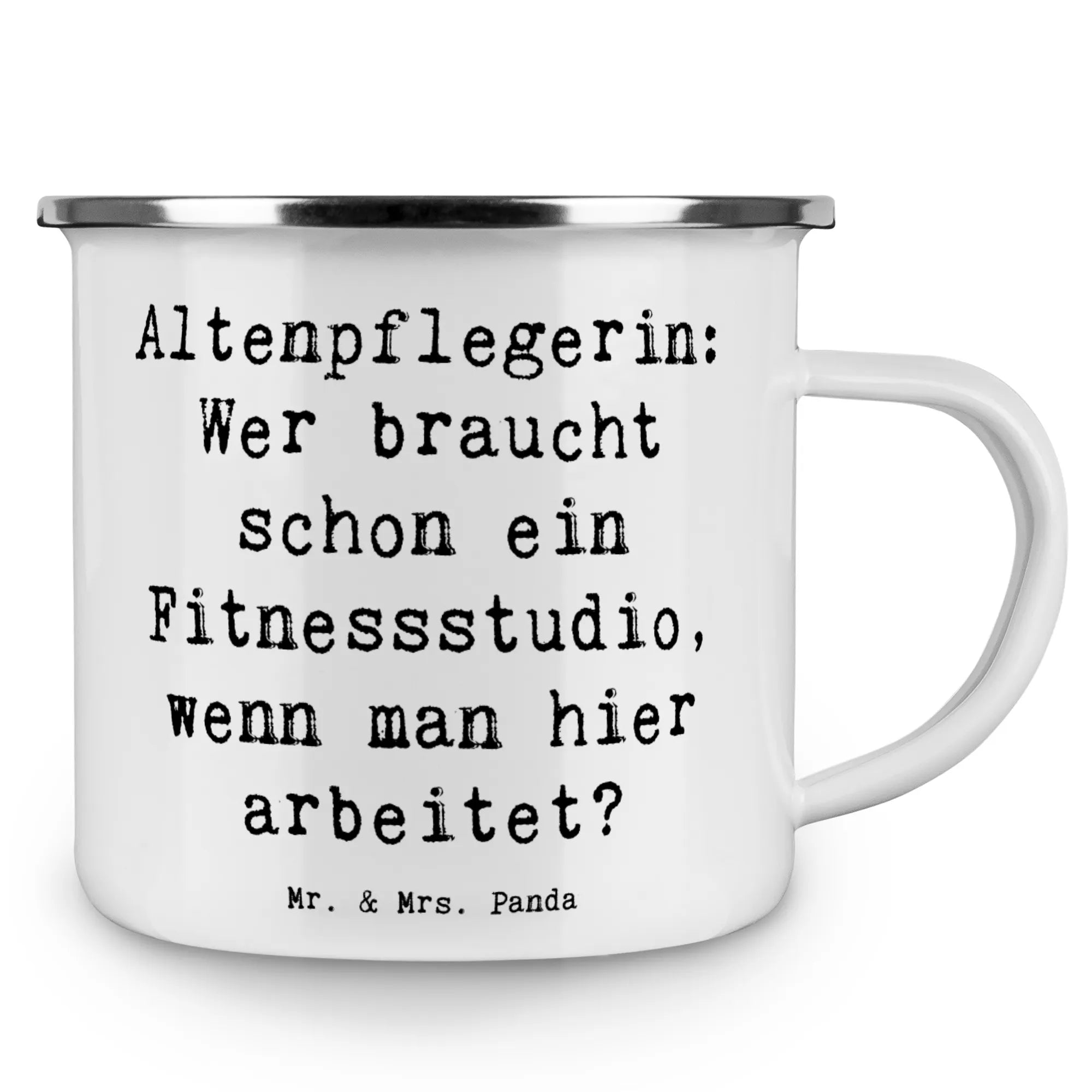 Die Camping Emaille Tasse "Altenpflegerin" von Mr. & Mrs. Panda ist das perfekte Geschenk für alle, die im Altenpflegeberuf tätig sind. Mit einem liebevollen Design und dem witzigen Spruch "Altenpflegerin: Wer braucht schon ein Fitnessstudio, wenn man hier arbeitet?" bringt diese Tasse ein Lächeln in den Alltag eines jeden Altenpflegers oder jeder Altenpflegerin.