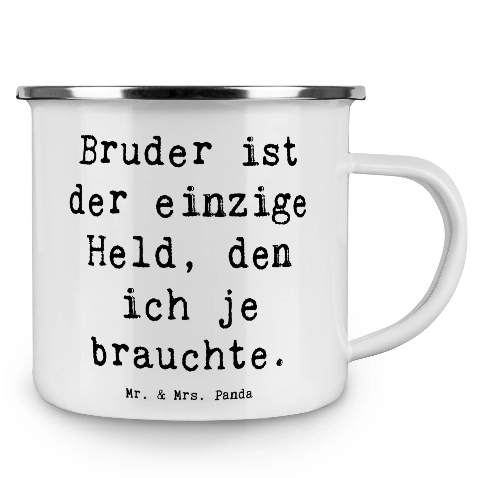 Die Camping Emaille Tasse von Mr. & Mrs. Panda mit dem tollen Motiv "Bruder ist der einzige Held, den ich je brauchte" ist das perfekte Geschenk für Geschwister und all jene, die eine besondere Verbindung zu ihrem Bruder haben. Diese wunderschöne und beständige Tasse vereint Funktionalität und Emotion. Ob beim Camping, beim Wandern oder einfach bei einem gemütlichen Frühstück auf dem Balkon – dieser Campingbecher ist immer dabei und sorgt dafür, dass du deinen Kaffee oder Tee in vollen Zügen genießen kannst. Mit einer Füllmenge von 300 ml und einem Gewicht von nur 172 g ist diese Metalltasse superleicht und trotzdem robust. Die kratzfeste Emaille sorgt dafür, dass dein neuer Lieblingsbecher lange schön bleibt, auch wenn er mal in den Rucksack gestopft wird.