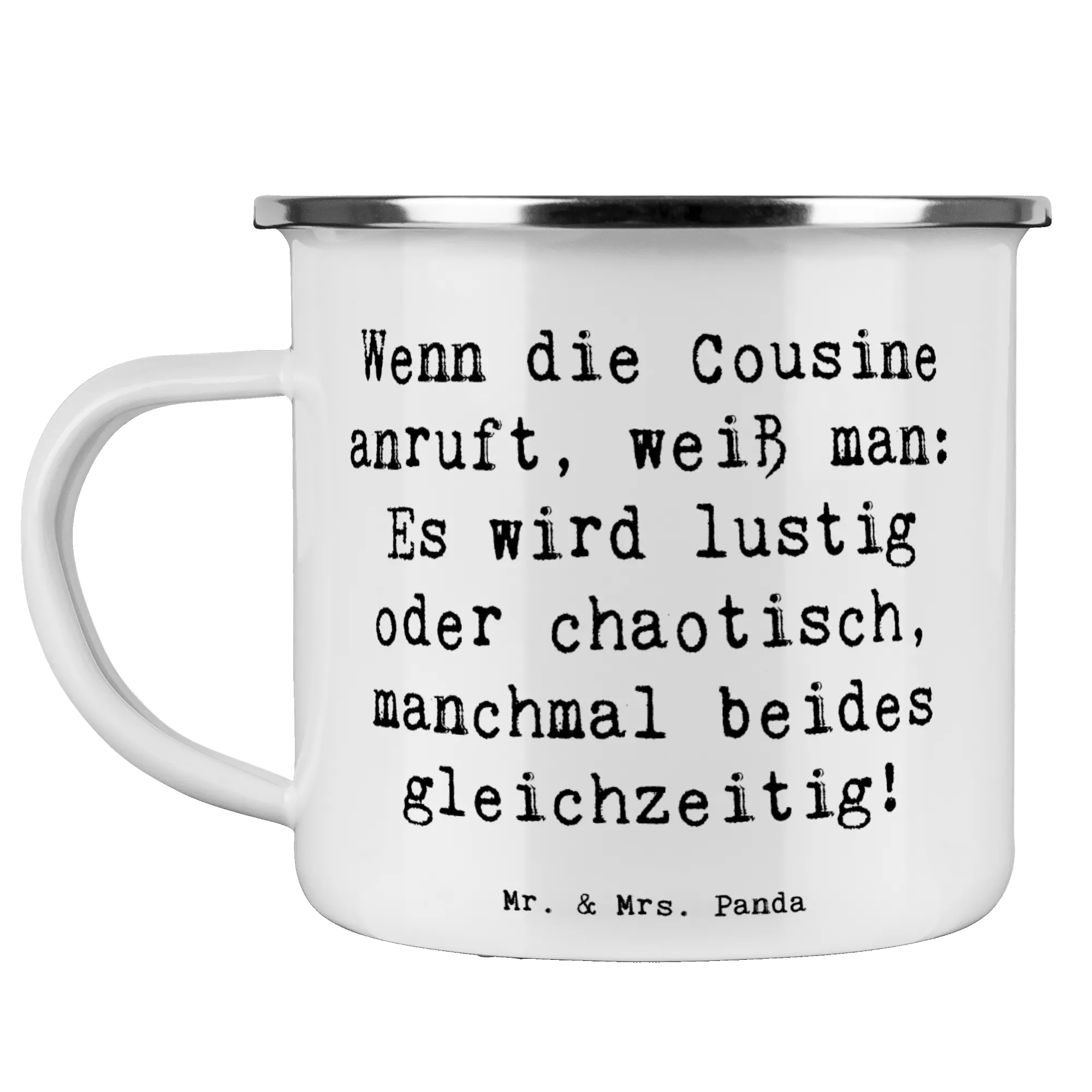 Die wunderschöne Camping Emaille Tasse von Mr. & Mrs. Panda ist der perfekte Begleiter für alle Abenteuer in der Natur und ein liebevolles Geschenk für Deine Cousine! Mit dem spritzigen Motto 'Wenn die Cousine anruft, weiß man: Es wird lustig oder chaotisch, manchmal beides gleichzeitig!' zaubert sie jedem ein Lächeln ins Gesicht.