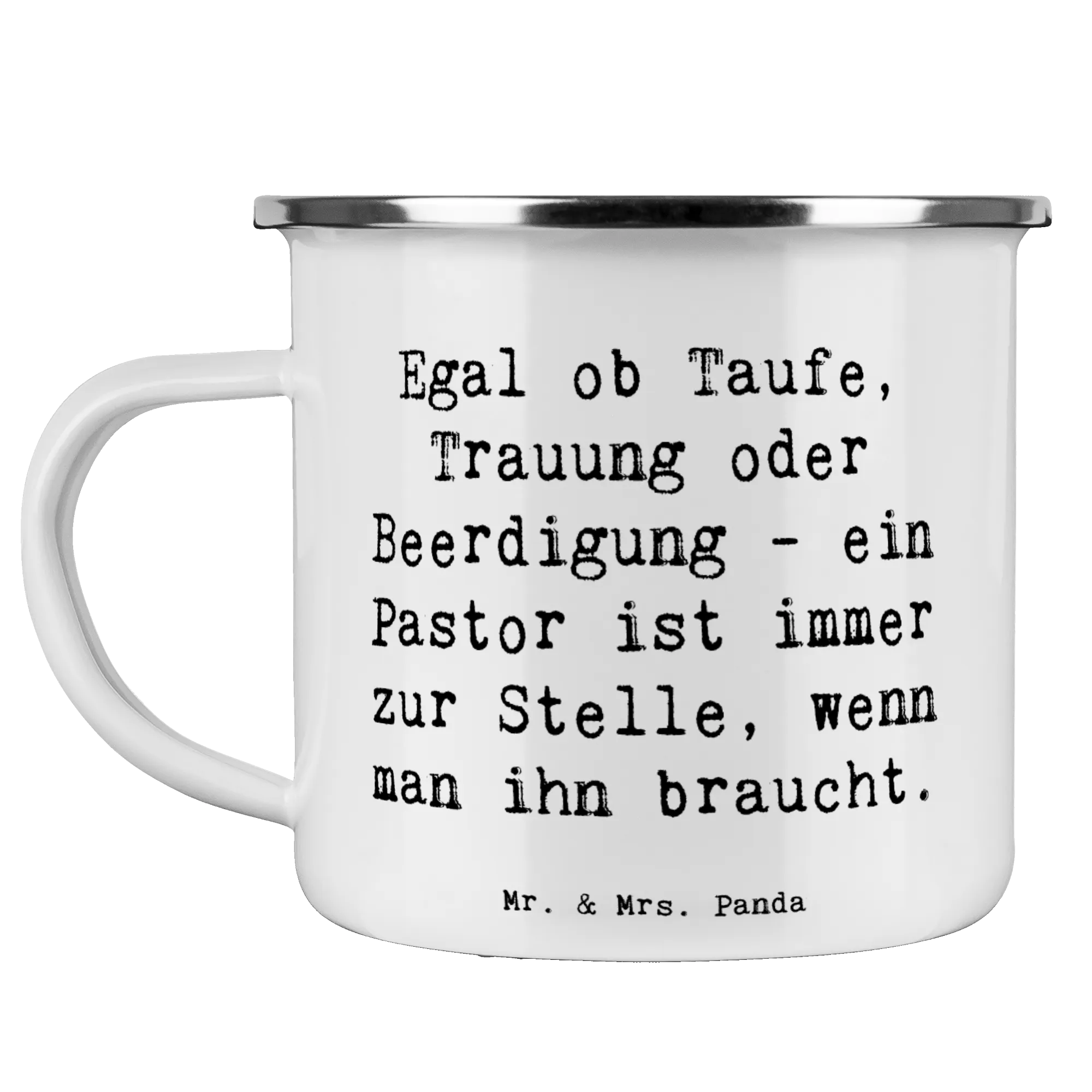 Camping Emaille Tasse Spruch Egal ob Taufe, Trauung oder Beerdigung - ein Pastor ist immer zur Stelle, wenn man ihn braucht.