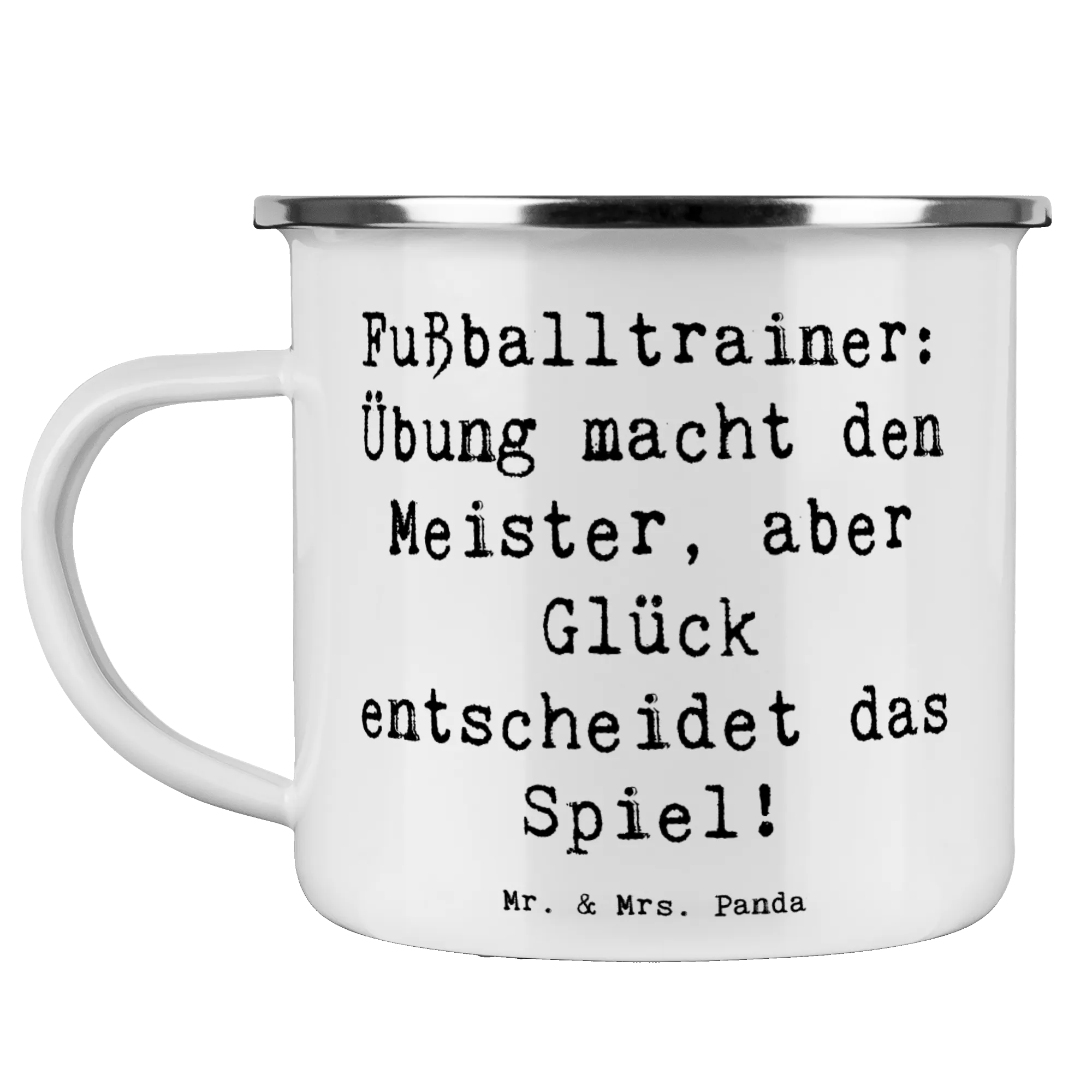 Die Camping Emaille Tasse von Mr. & Mrs. Panda mit dem liebevollen Motiv "Fußballtrainer: Übung macht den Meister, aber Glück entscheidet das Spiel!" ist das perfekte Geschenk für alle Fußballtrainer und Sportbegeisterte.