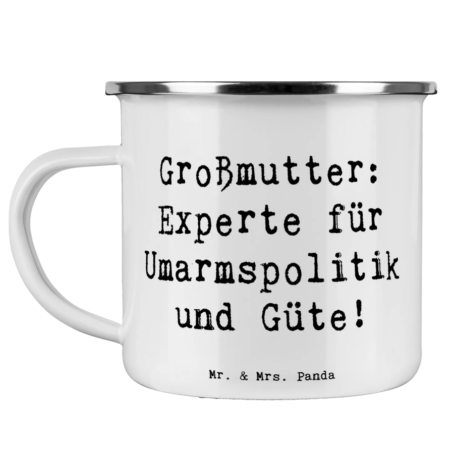 Die Camping Emaille Tasse mit dem liebevollen Motiv Großmutter von Mr. & Mrs. Panda ist das perfekte Geschenk für alle, die ihren Großeltern mit einer besonderen Aufmerksamkeit danken möchten. Wenn Du an Deine Großmutter denkst, kommt Dir sicher sofort ihr strahlendes Lächeln in den Sinn, das Dich in jedem Moment des Lebens begleitet hat.
