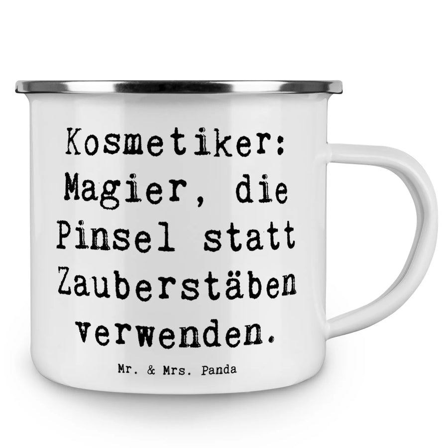 Die Camping Emaille Tasse mit dem Spruch "Kosmetiker: Magier, die Pinsel statt Zauberstäben verwenden" ist das ideale Geschenk für alle Kosmetiker und Make-up-Artists, die gerne in der Natur unterwegs sind.