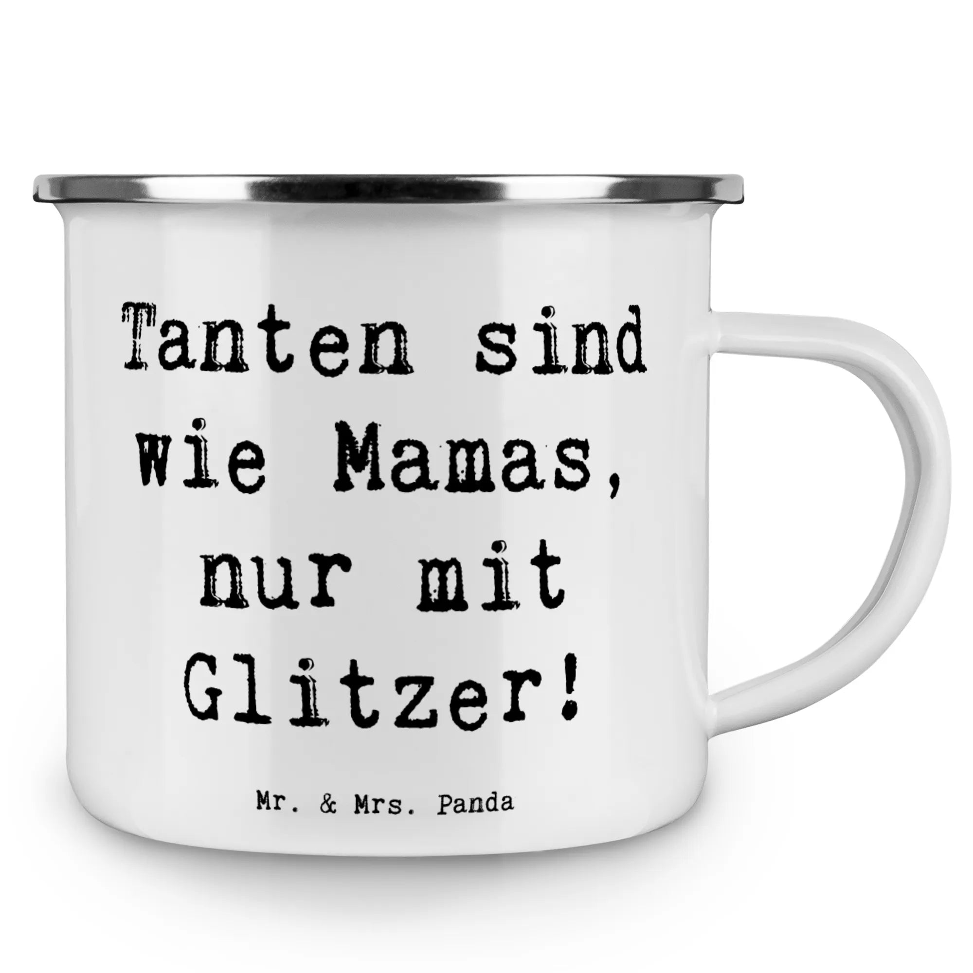 Die Camping Emaille Tasse "Tanten sind wie Mamas, nur mit Glitzer!" von Mr. & Mrs. Panda ist das ideale Geschenk für deine Tante, die dir am Herzen liegt. Mit dieser bezaubernden Tasse machst du ihr nicht nur eine Freude, sondern feierst auch die besondere Beziehung, die ihr zueinander habt. Ob beim nächsten Campingausflug, einer Wanderung oder einfach beim gemütlichen Kaffeeklatsch zu Hause – diese Metalltasse ist der perfekte Begleiter für jede Gelegenheit. Sie besteht aus kratzfester Emaille und hält sowohl heiße als auch kalte Getränke warm oder kühl. Mit einer Füllmenge von 300 ml ist sie praktisch für unterwegs und leicht zu transportieren.