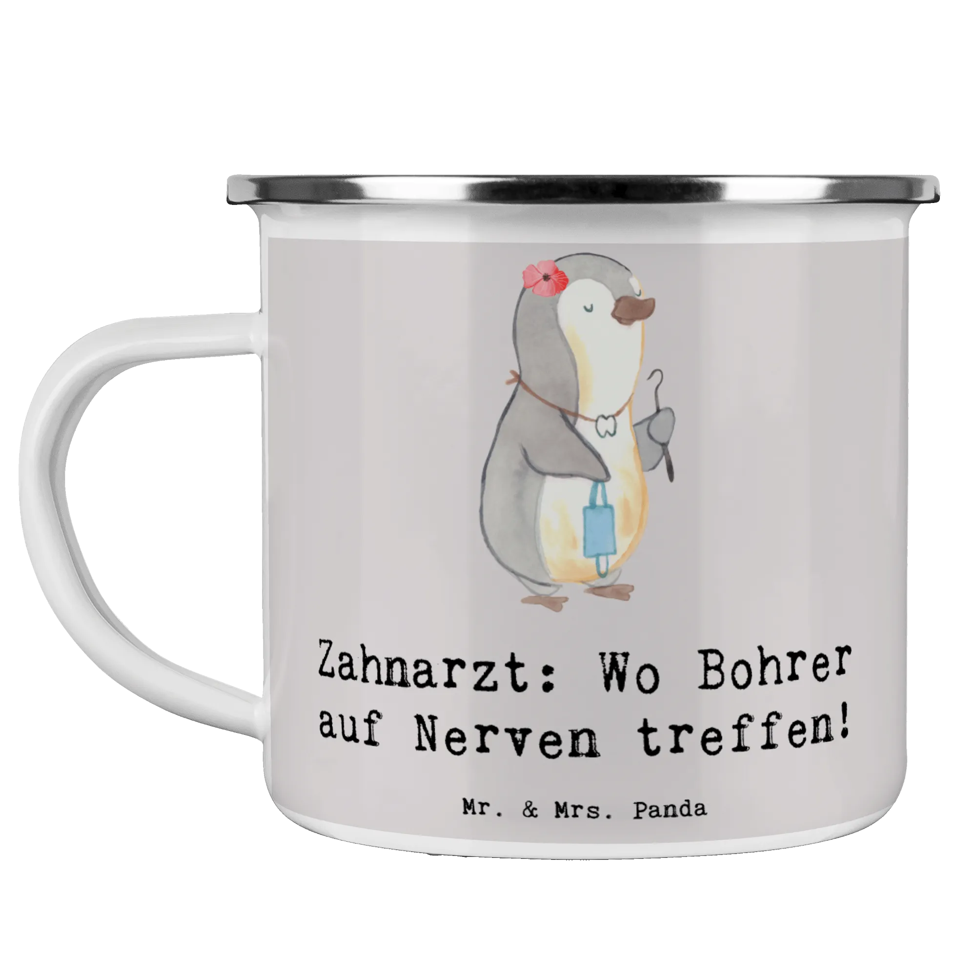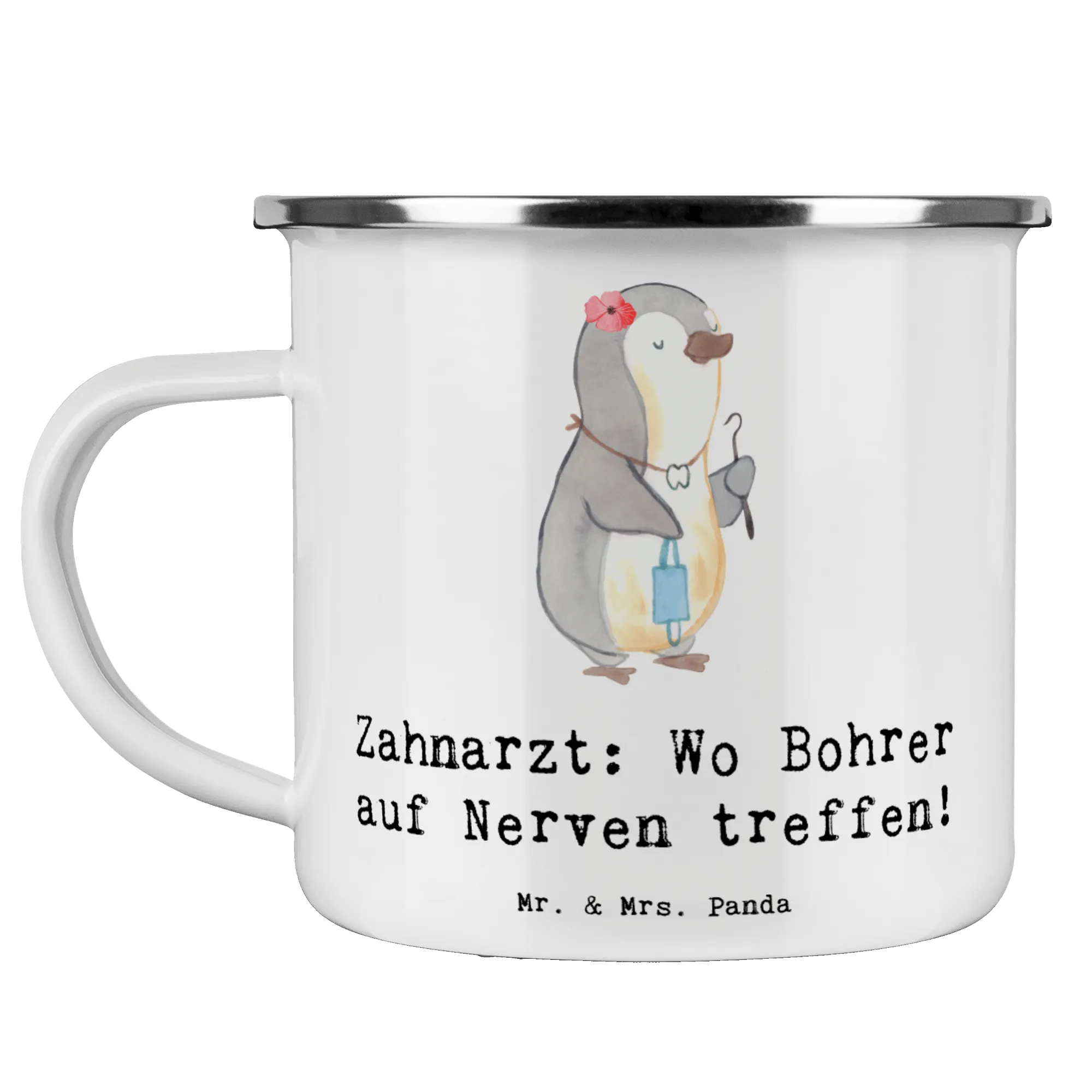 Die Mr. & Mrs. Panda Camping Emaille Tasse mit dem niedlichen Motiv "Zahnarzt: Wo Bohrer auf Nerven treffen!" ist nicht nur ein praktisches Accessoire für unterwegs, sondern auch das perfekte Geschenk für Zahnarzt-Profis und deren Fans! Ob beim Camping, im Garten oder auf einer Wanderung – diese Tasse macht jeden Schluck zu einem besonderen Erlebnis.