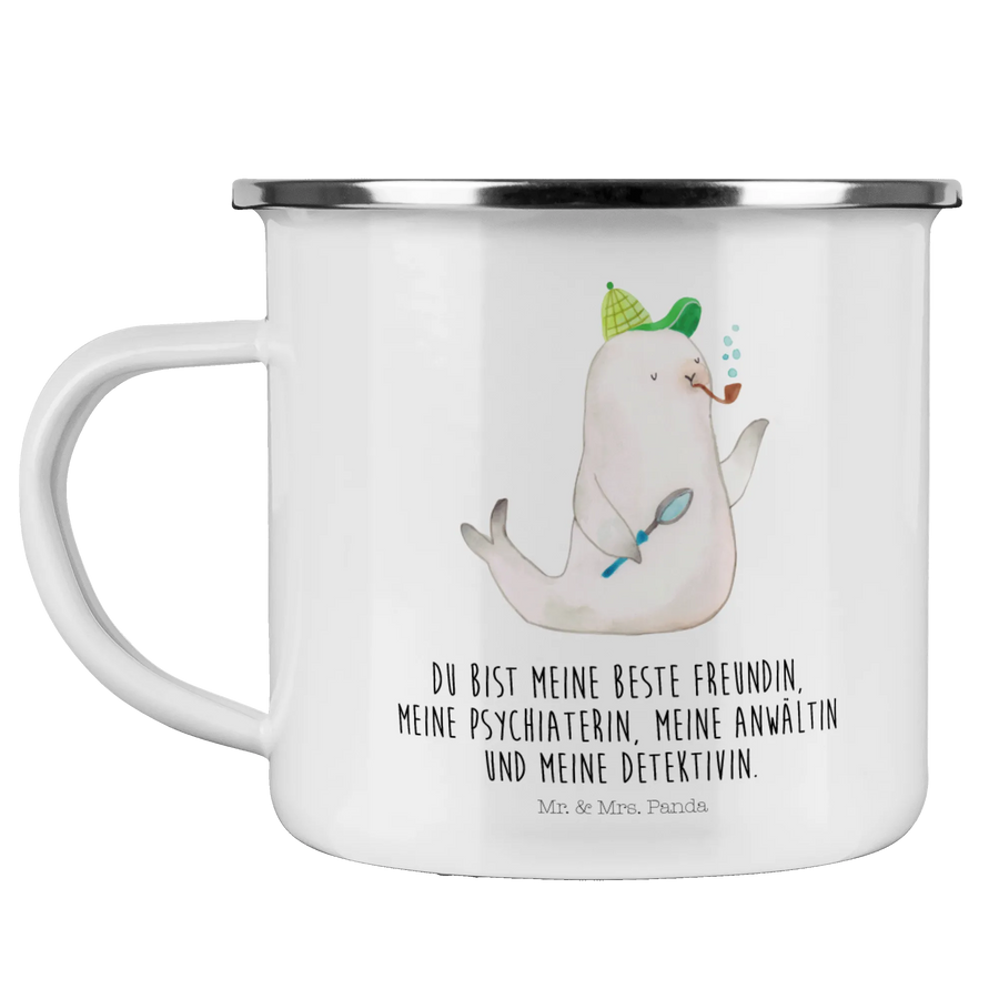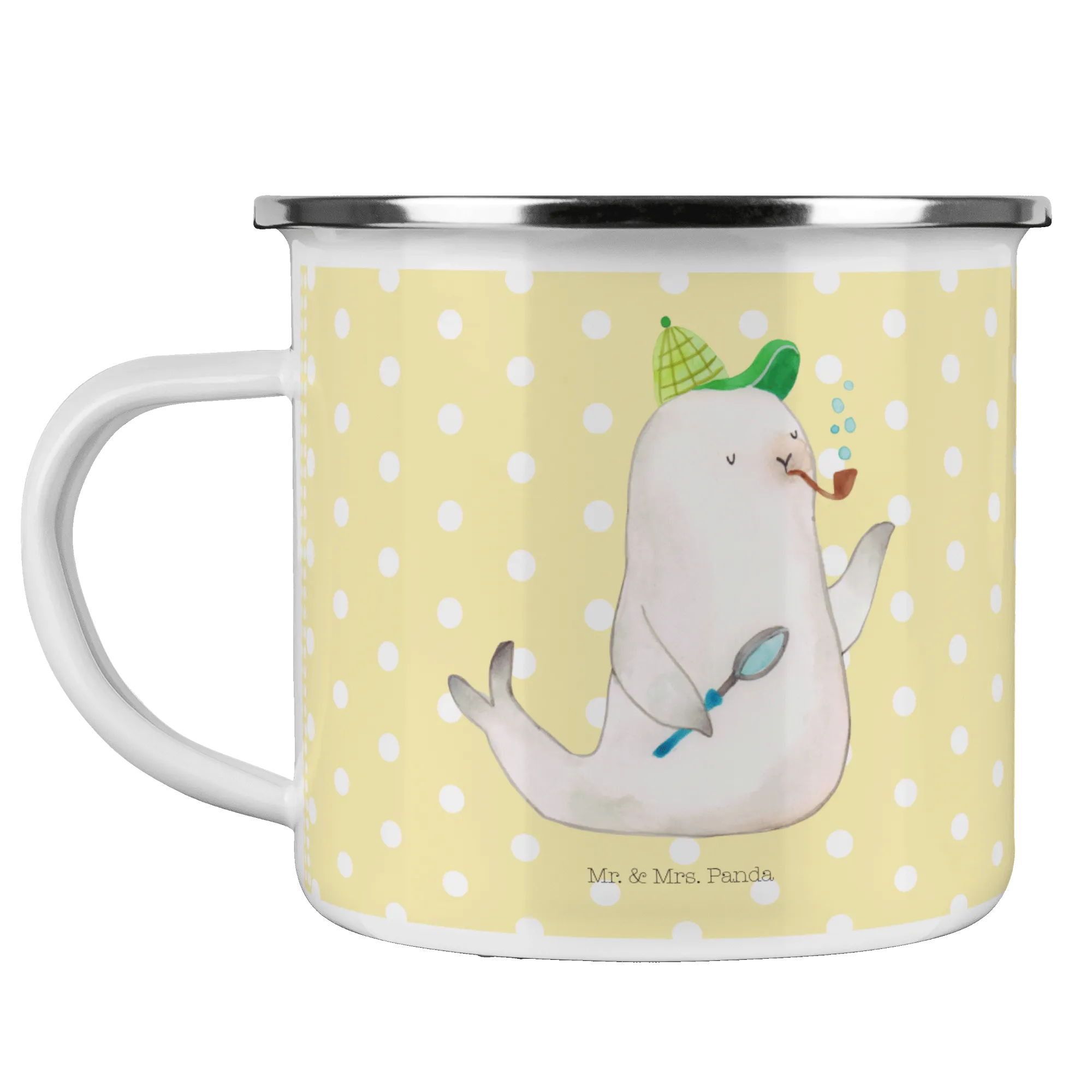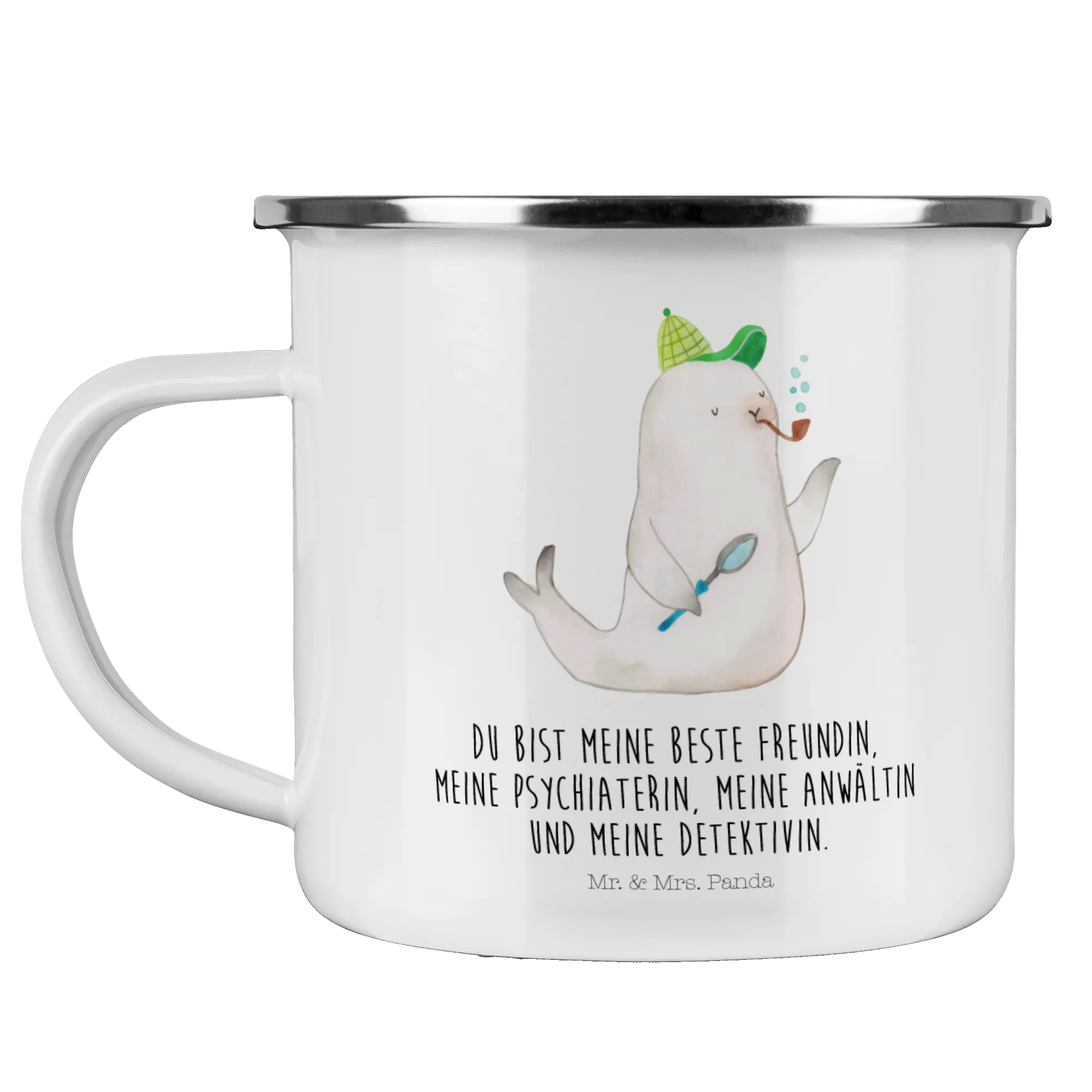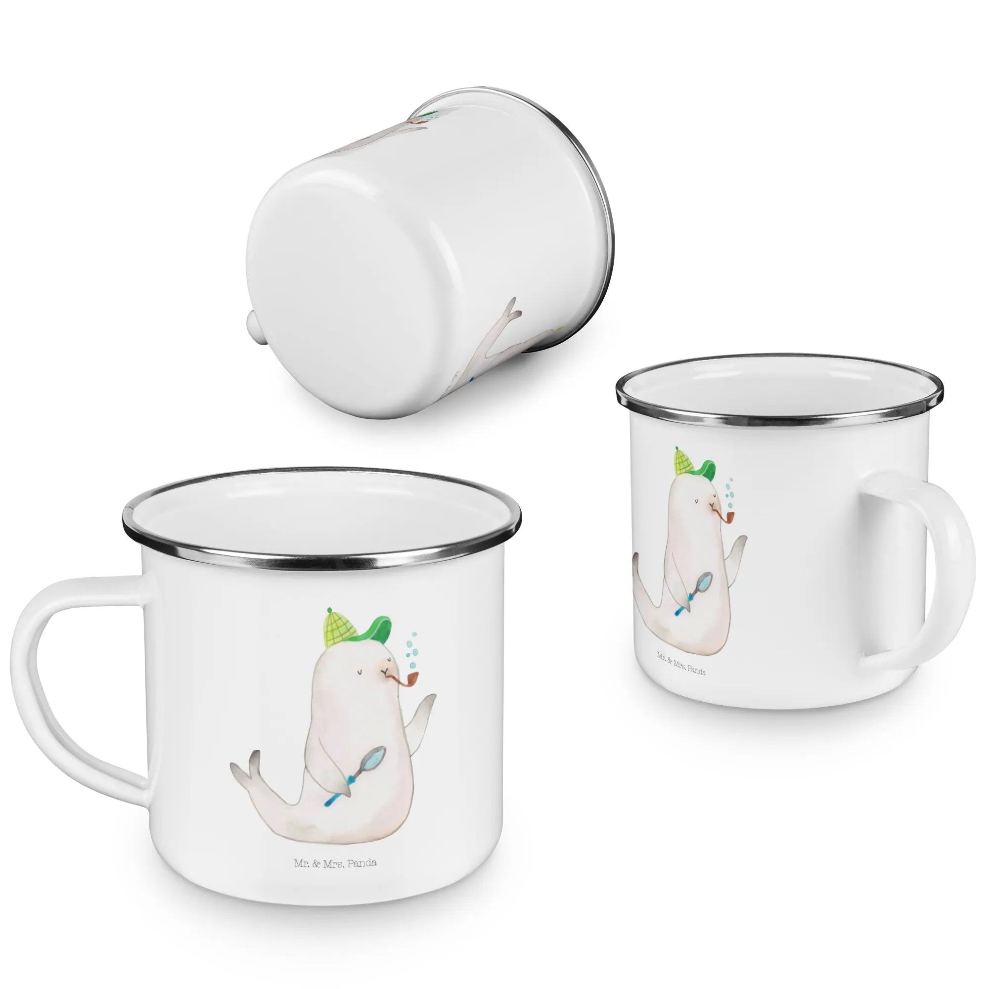 Kempingowy kubek emaliowany foka Sherlock - z napisem - biały
