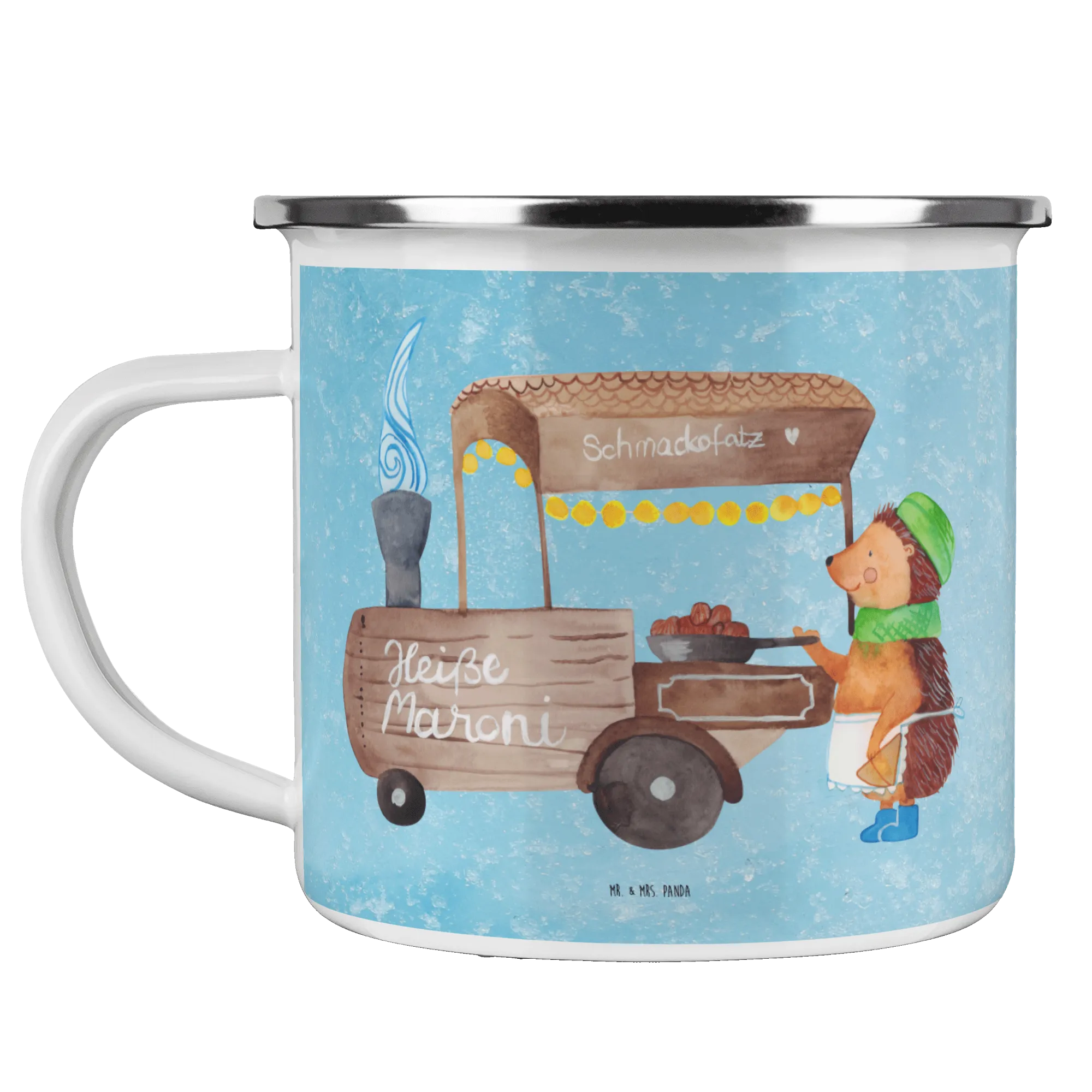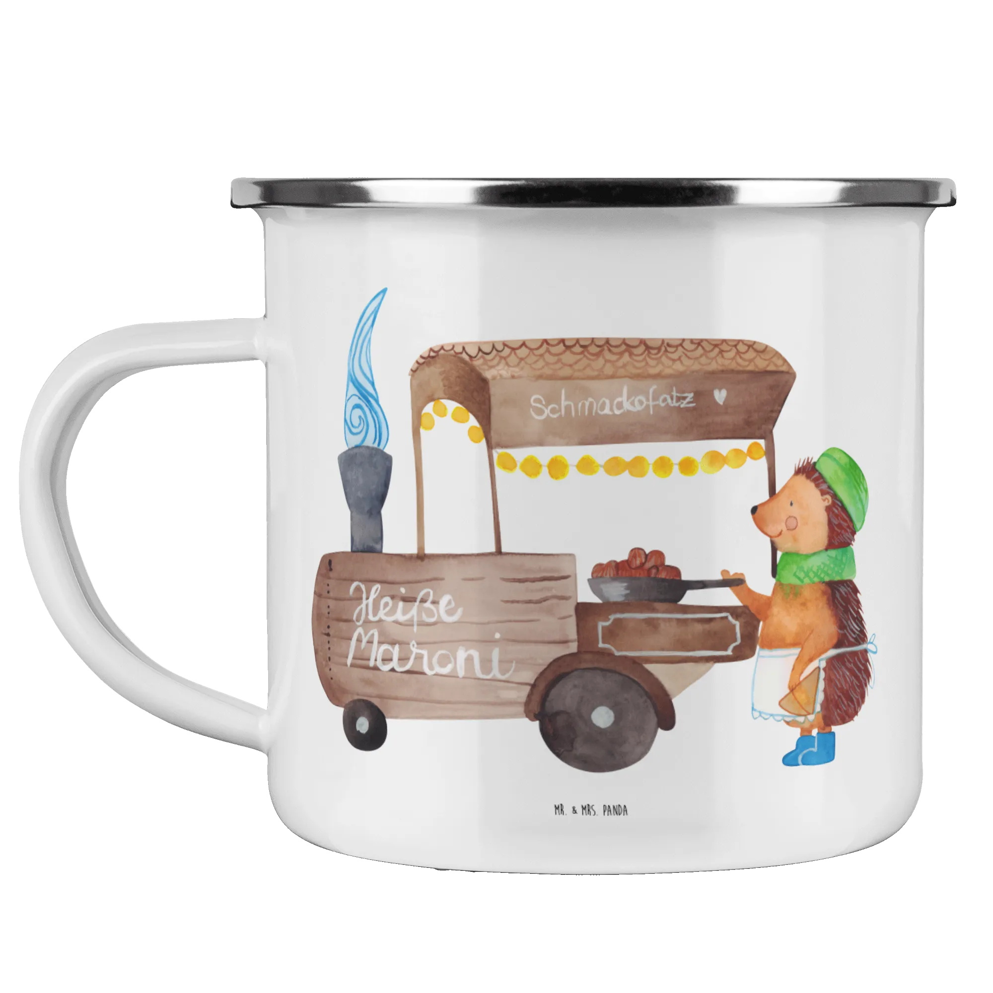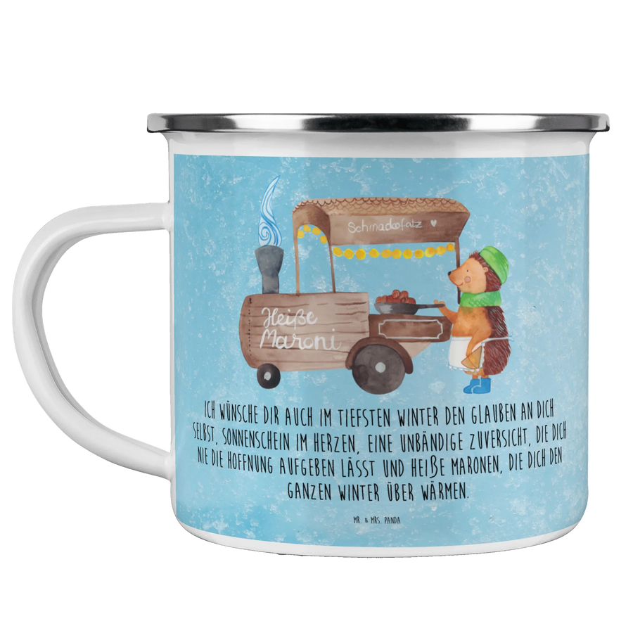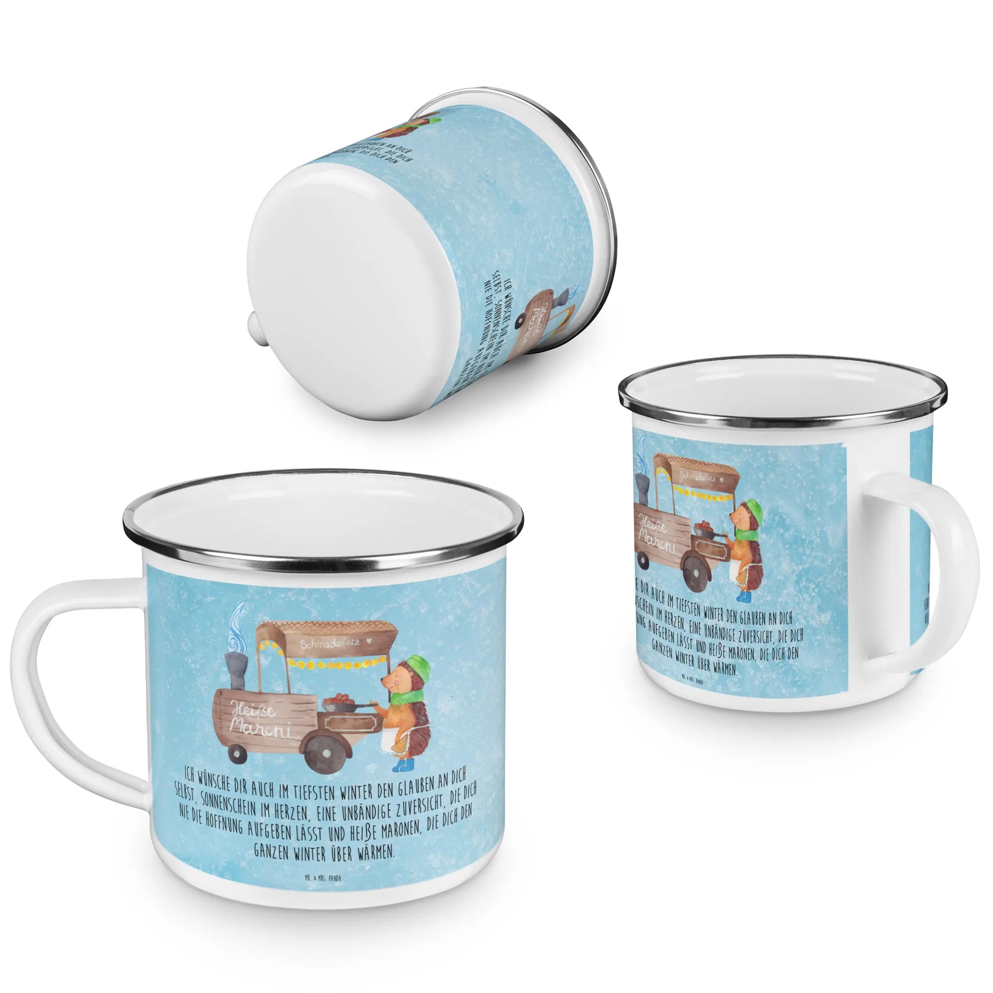 Entdecke die bezaubernde Camping Emaille Tasse "Igel Maronen" aus der Winter Kollektion von Mr. & Mrs. Panda!