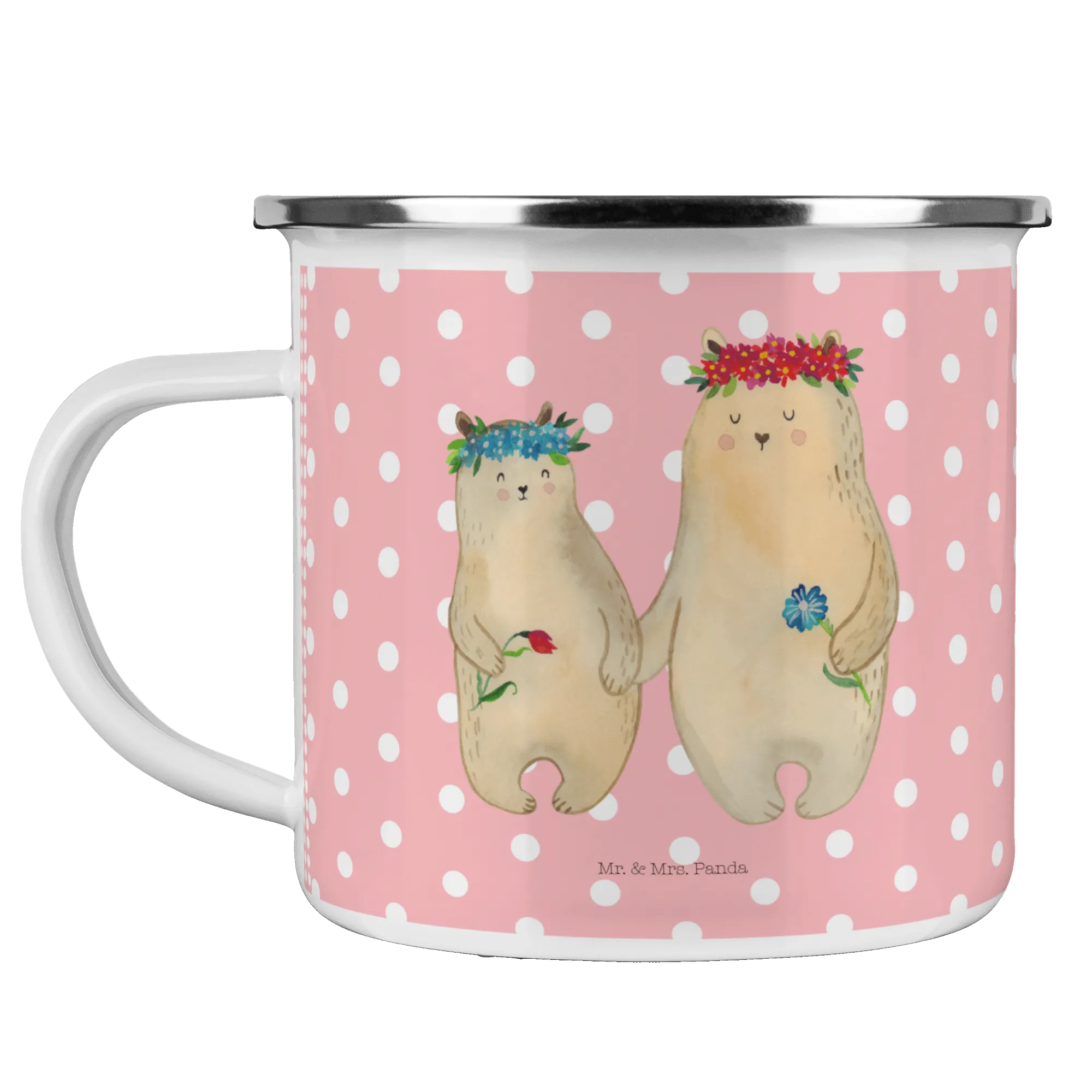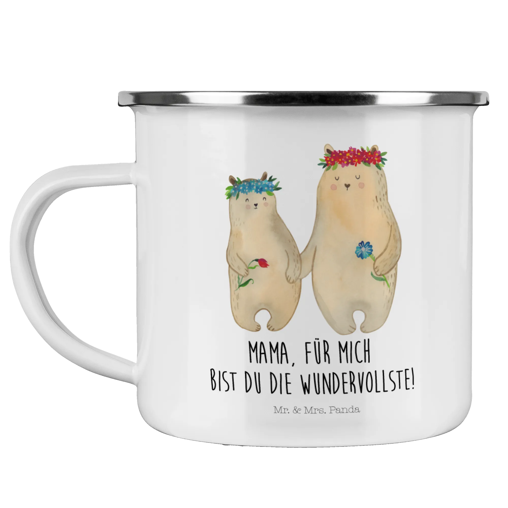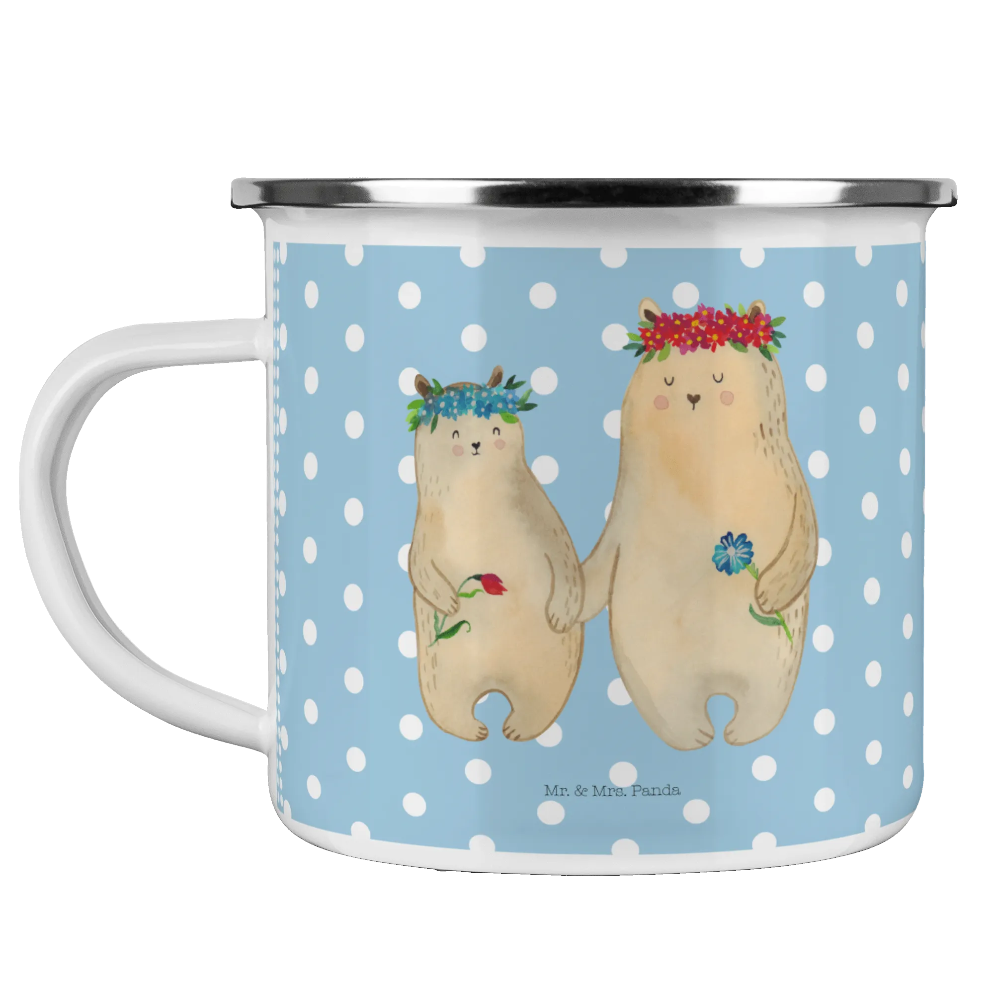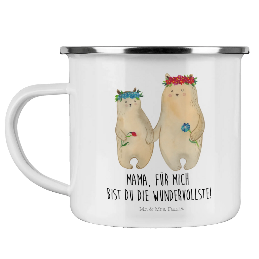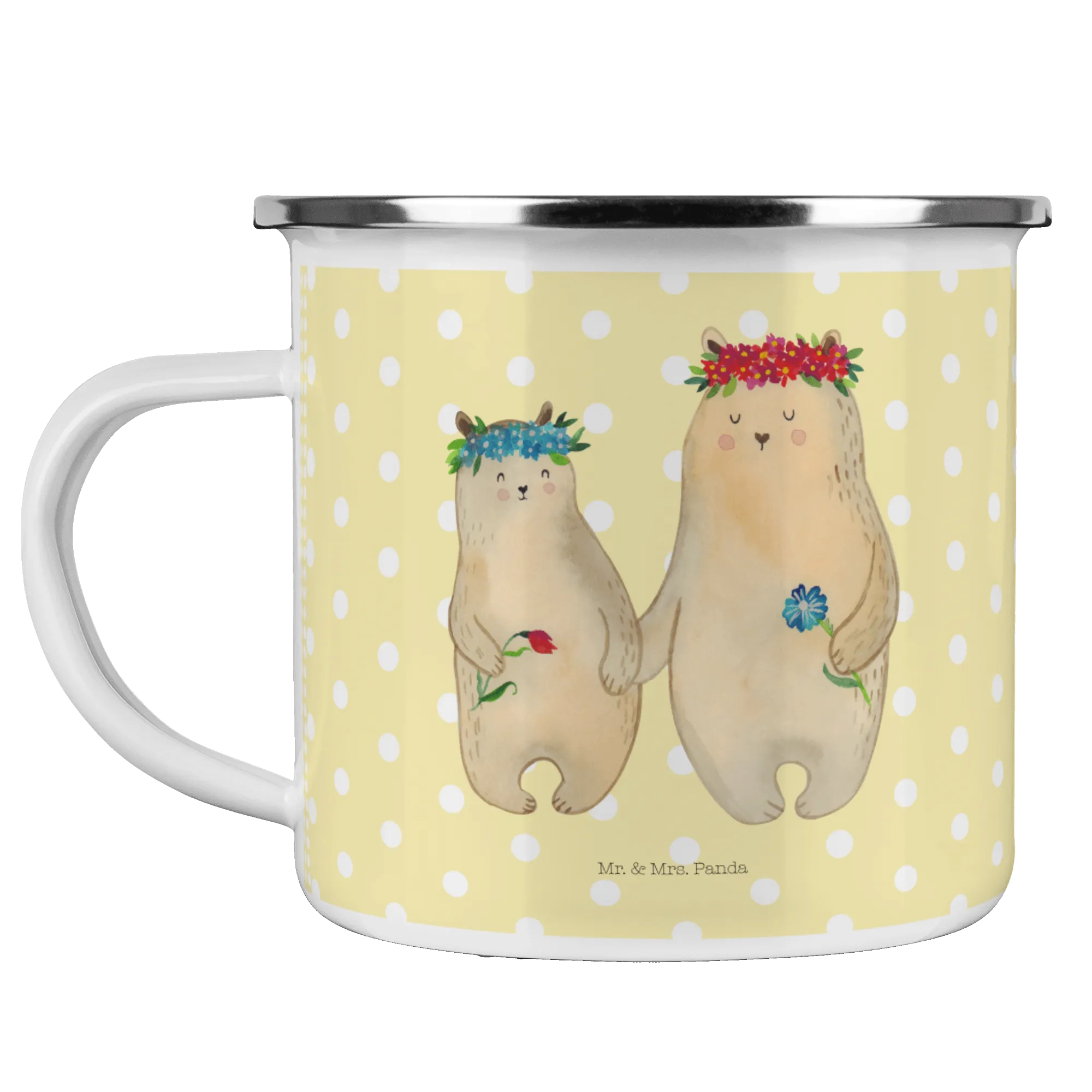 Kempingowy kubek emaliowany Niedźwiedzie z wianuszkiem - z napisem - Biały