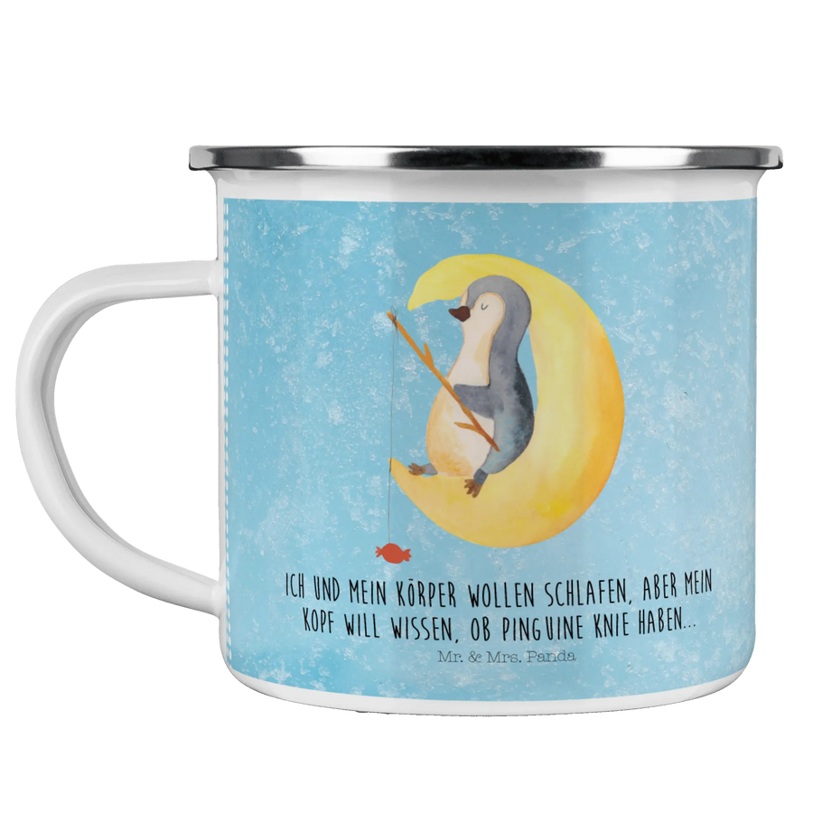 Kempingowy kubek emaliowany pingwin księżyc - mit Spruch - Eisblau