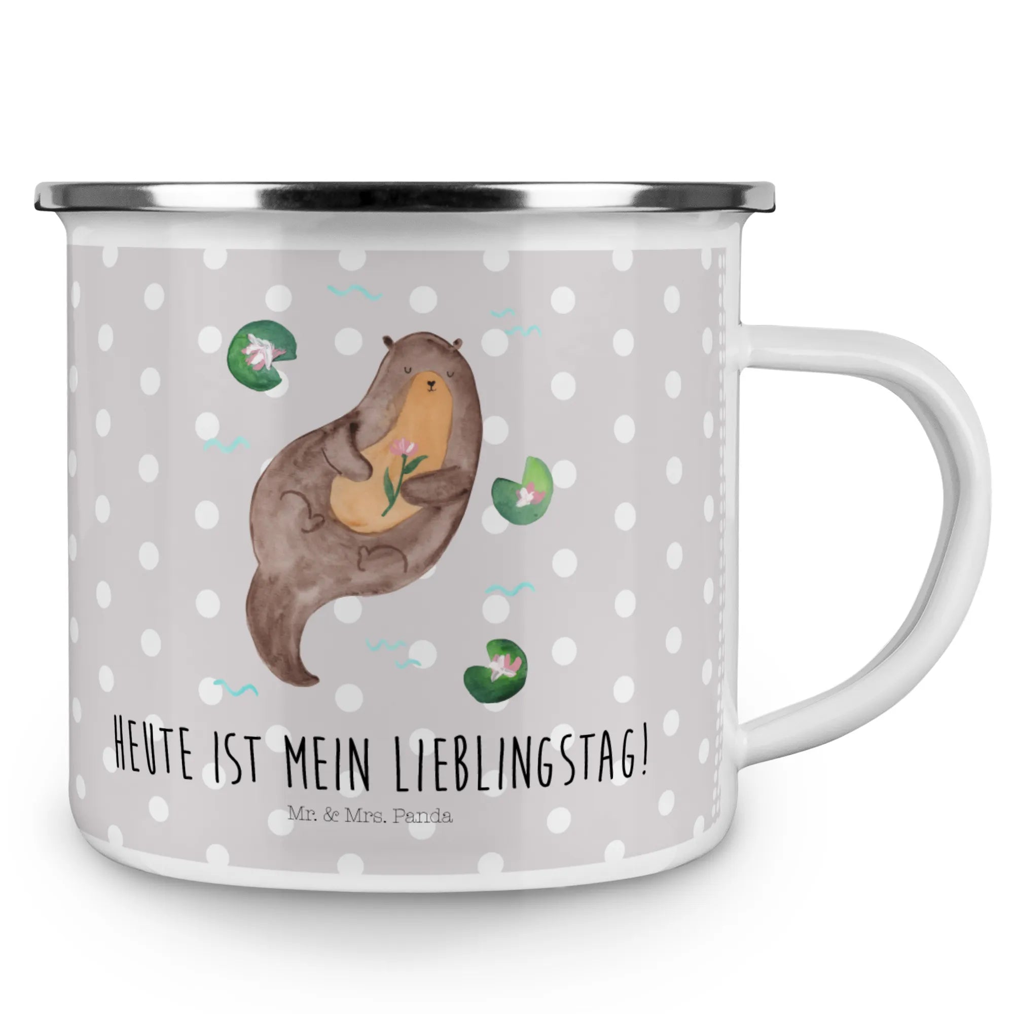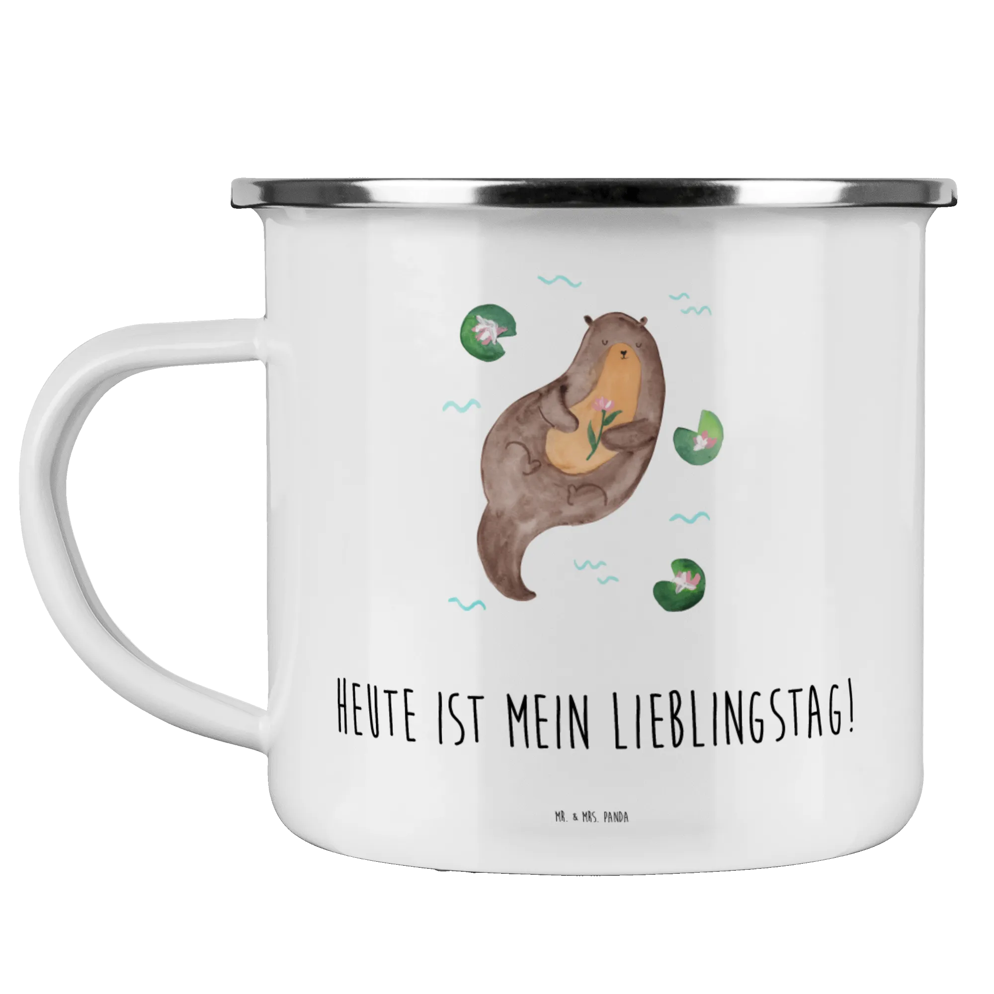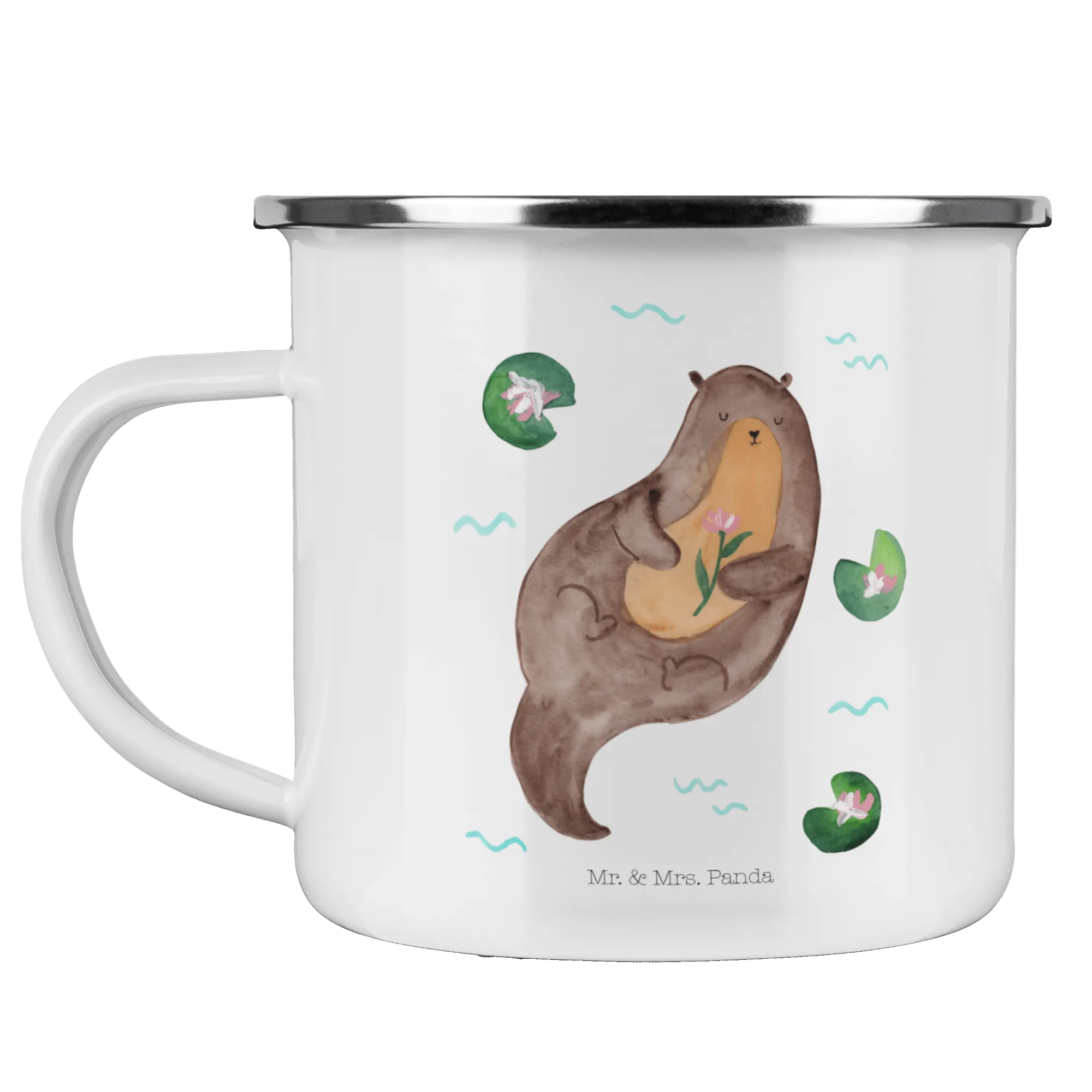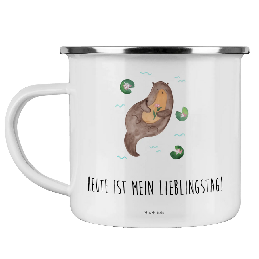 Kempingowy kubek emaliowany wydra lilia wodna - z napisem - Biały