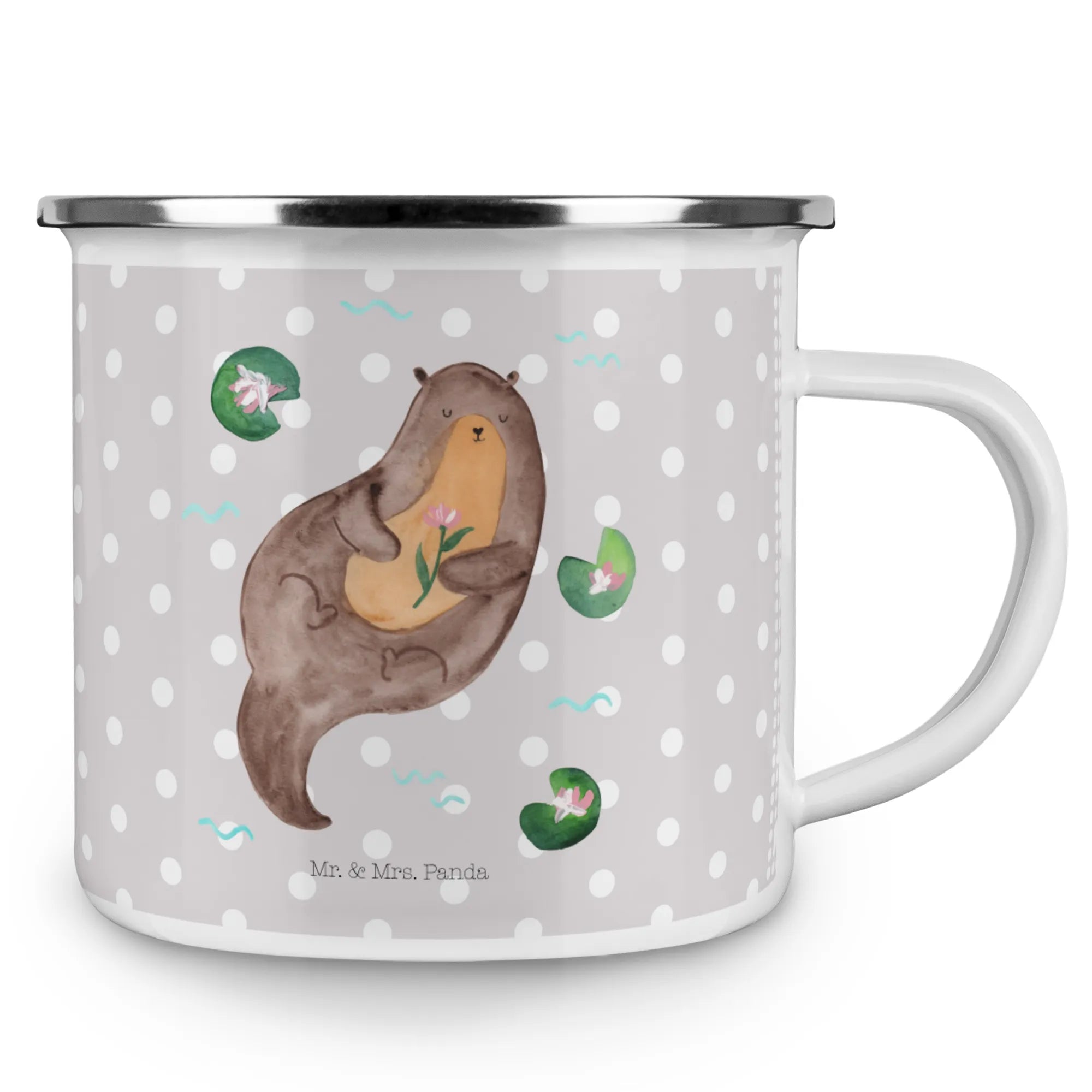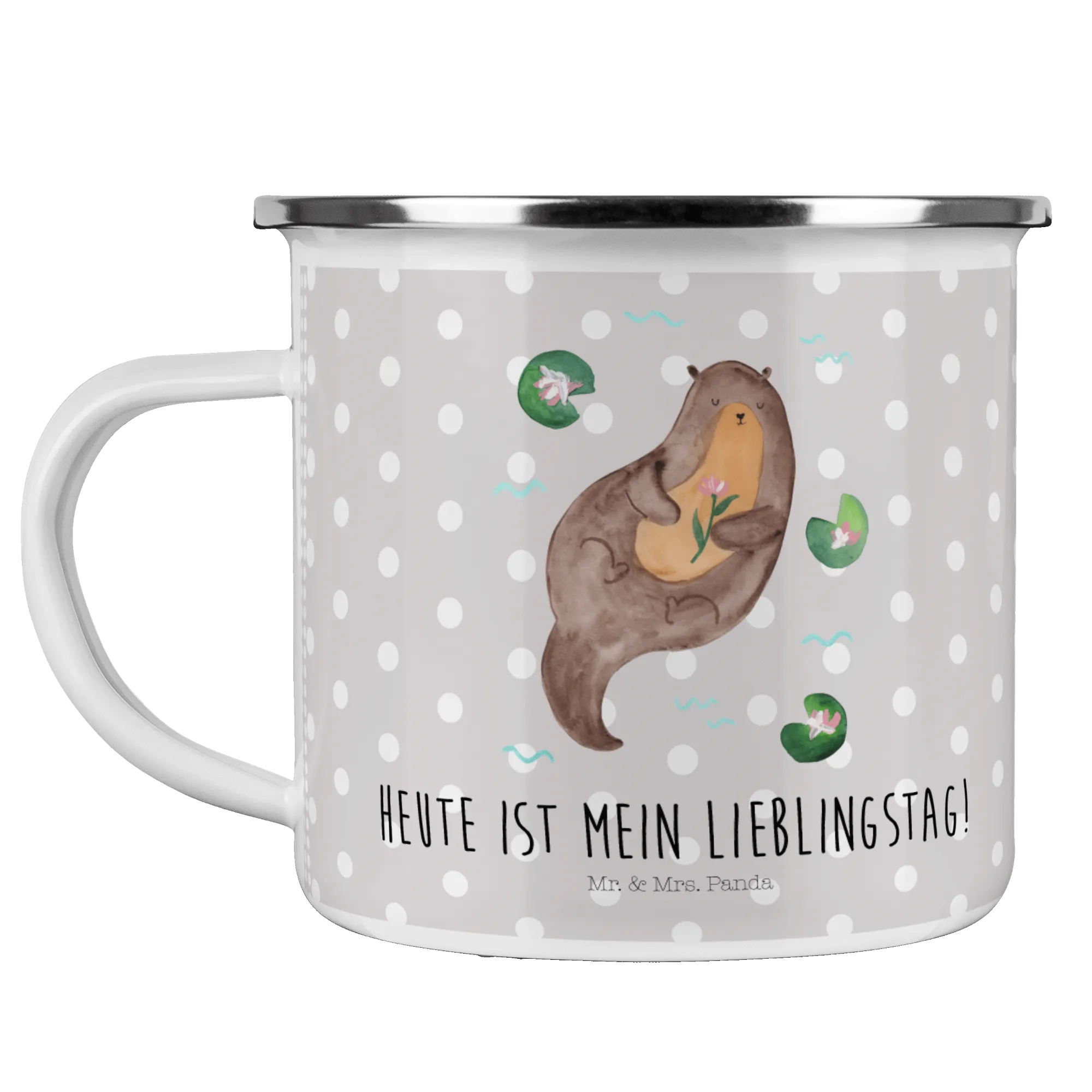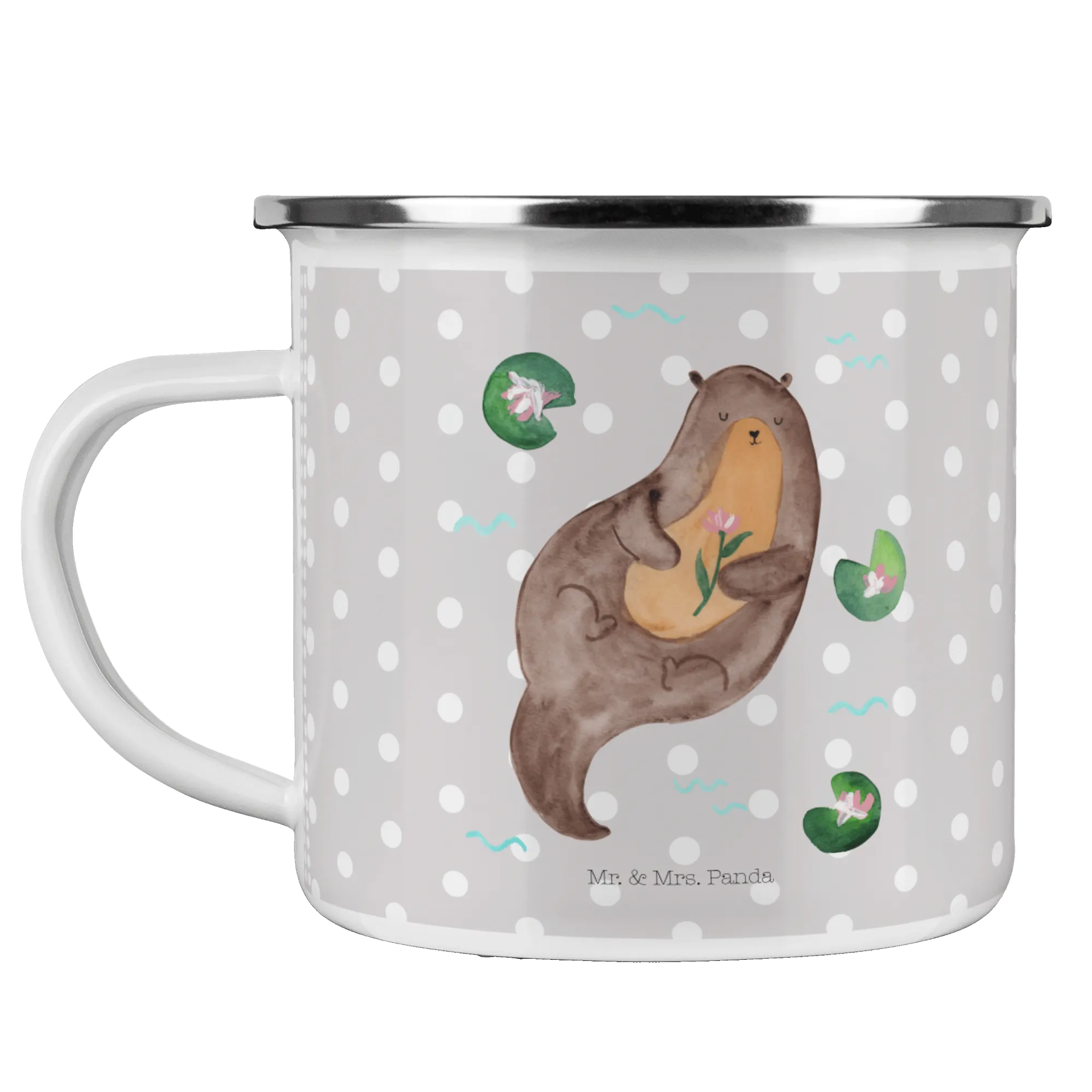 Kempingowy kubek emaliowany wydra lilia wodna - z napisem - Biały