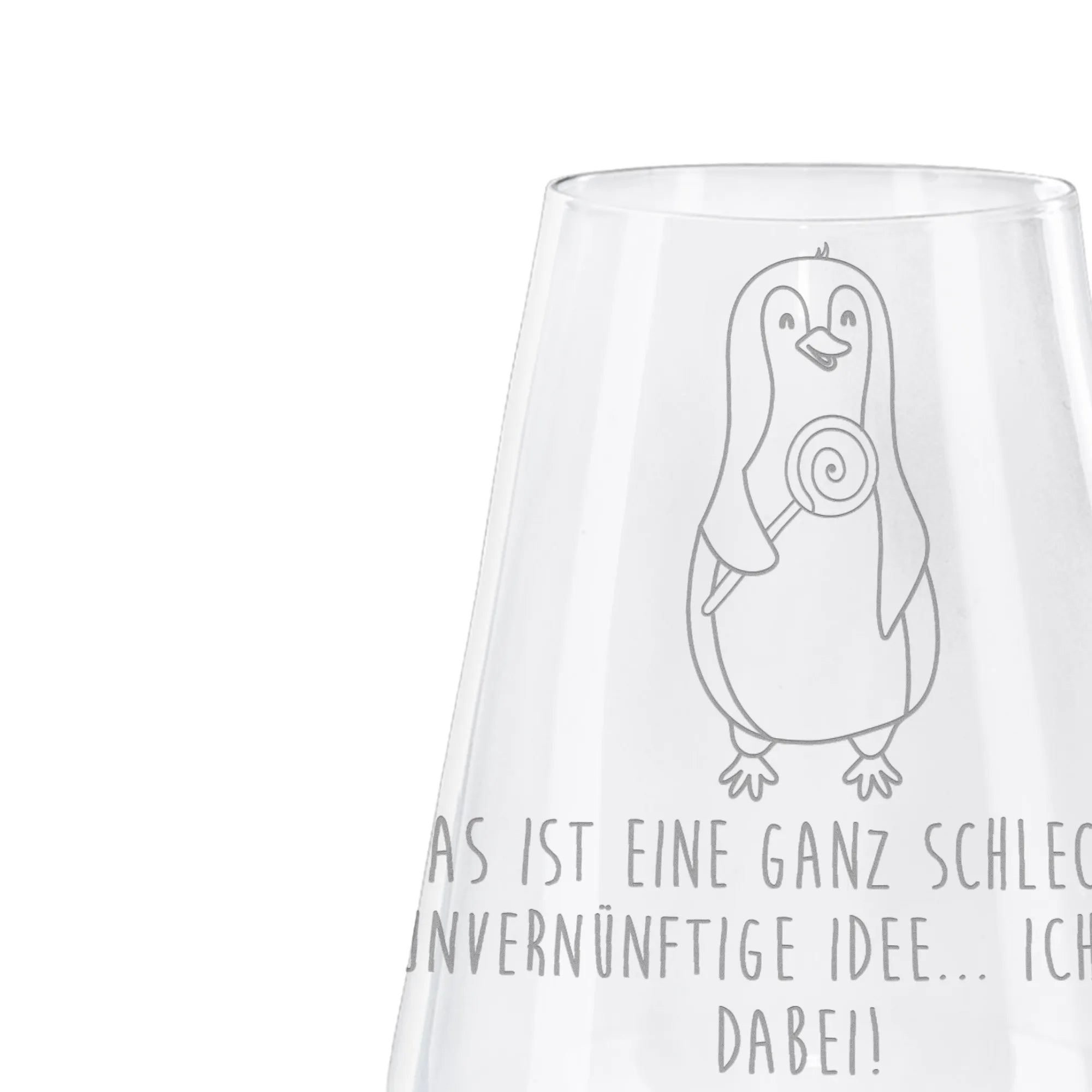 Die charmante Gravur, die von Mr. & Mrs. Panda handgezeichnet wurde, zeigt einen niedlichen Pinguin mit einem großen Lolli, der deinem Glas einen verspielten und fröhlichen Touch verleiht. Das Motiv voller kindlicher Unbeschwertheit und die liebevolle Botschaft „Das ist eine ganz schlechte, unvernünftige Idee... Ich bin dabei!“ machen dieses Weißweinglas zu einem idealen Geschenk für Freunde, Familie oder sogar für dich selbst!